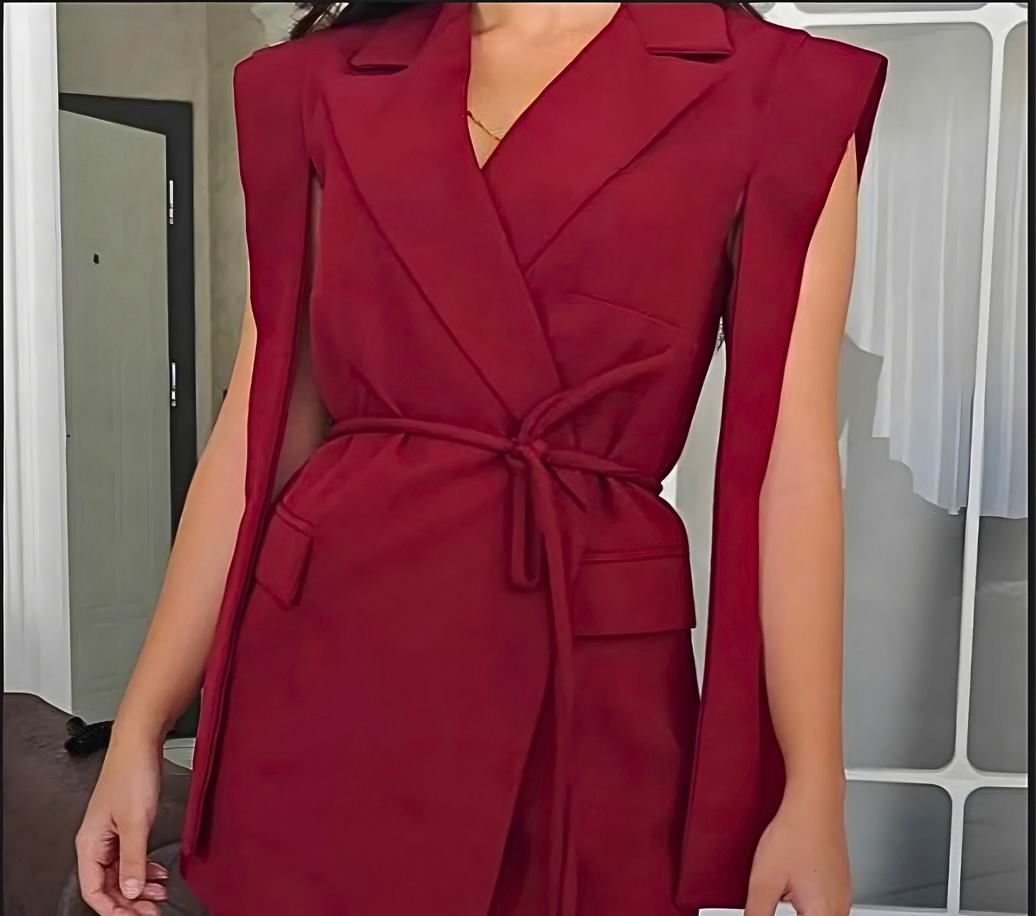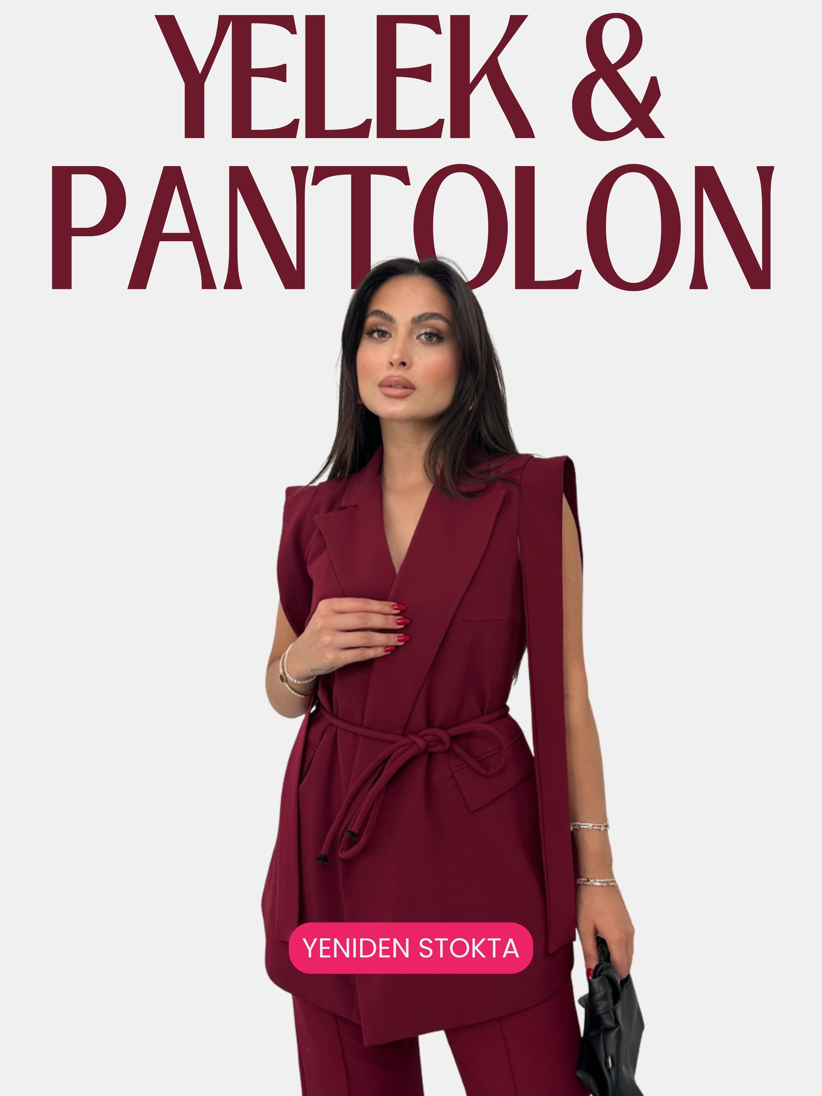 Kadın Alt Üst İkili Takım Omuz Detaylı Kuşaklı Yelek Pantolon Takım