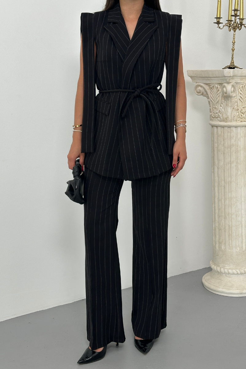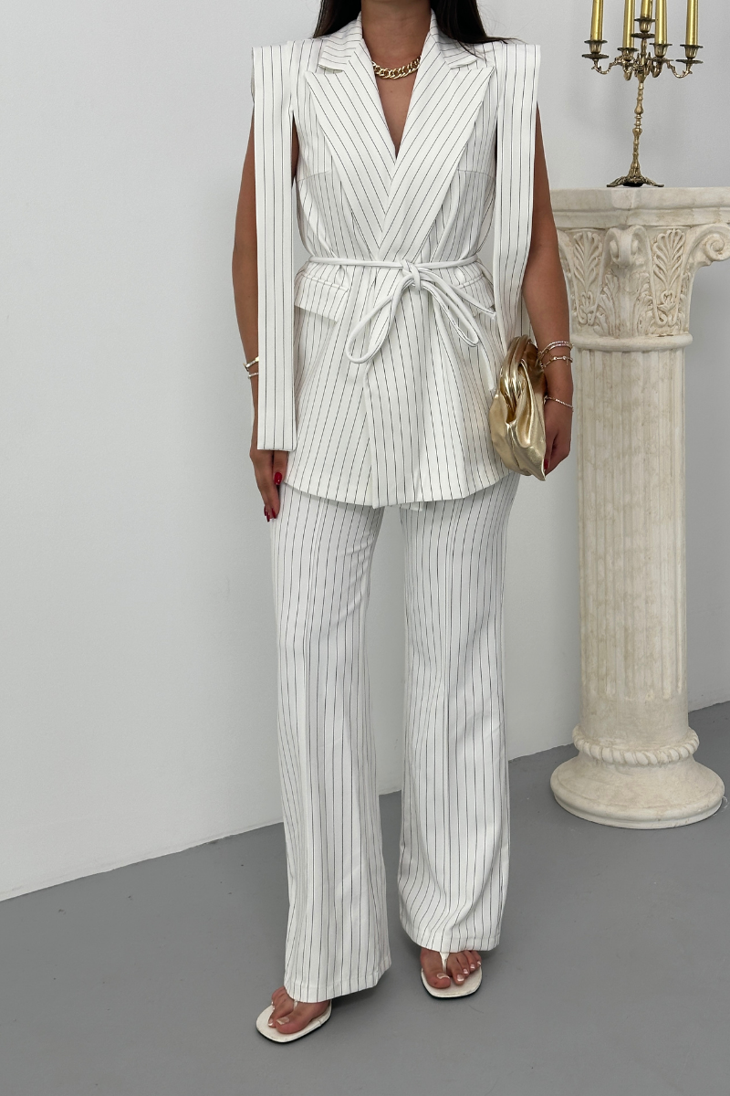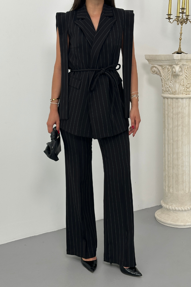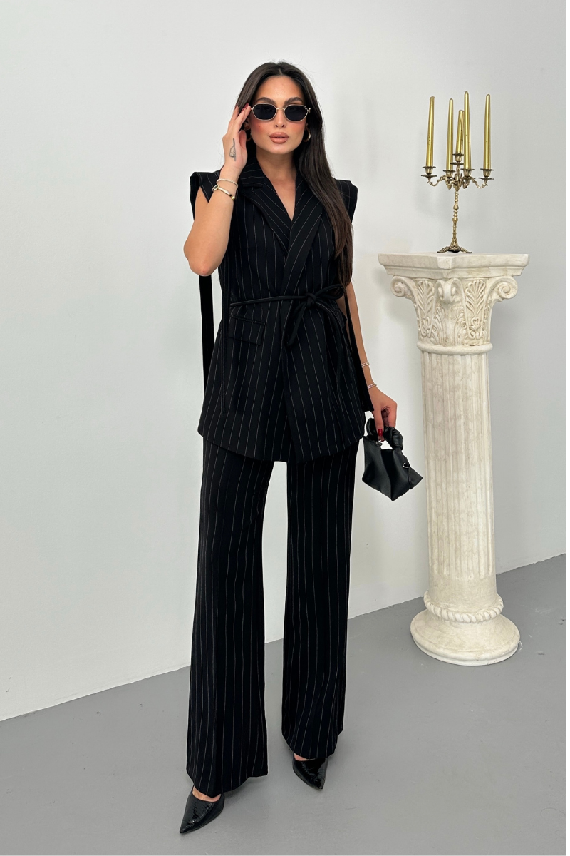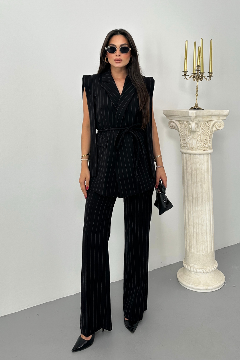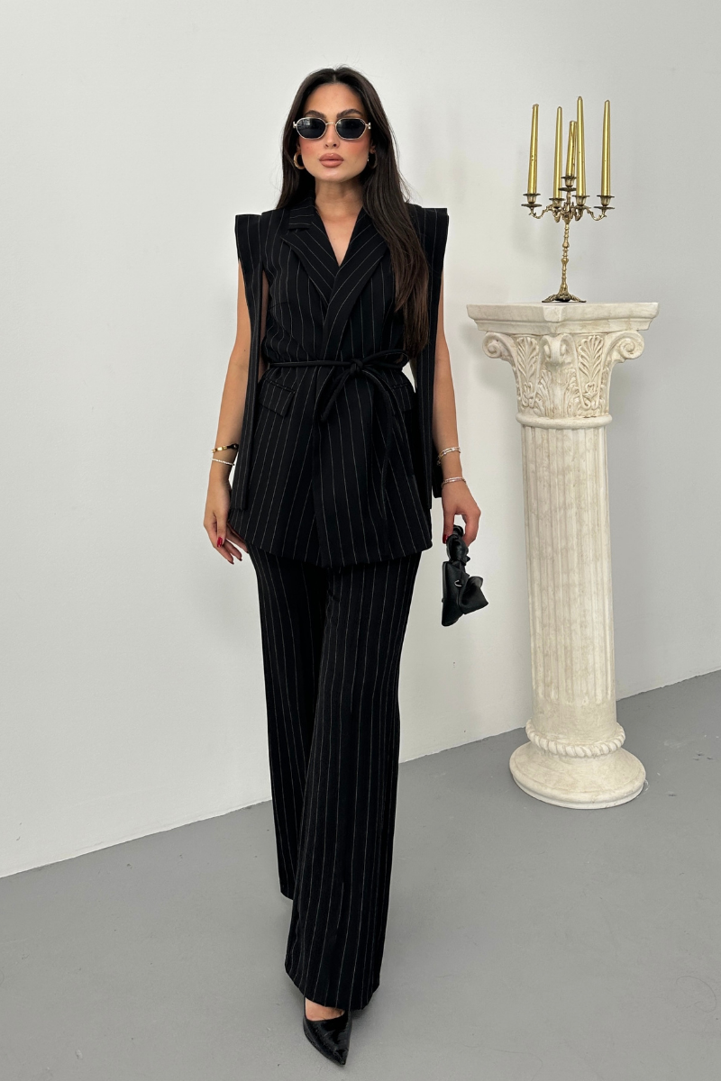 Kadın Alt Üst İkili Takım Çizgili Omuz Detaylı Kuşaklı Yelek Pantolon Takım