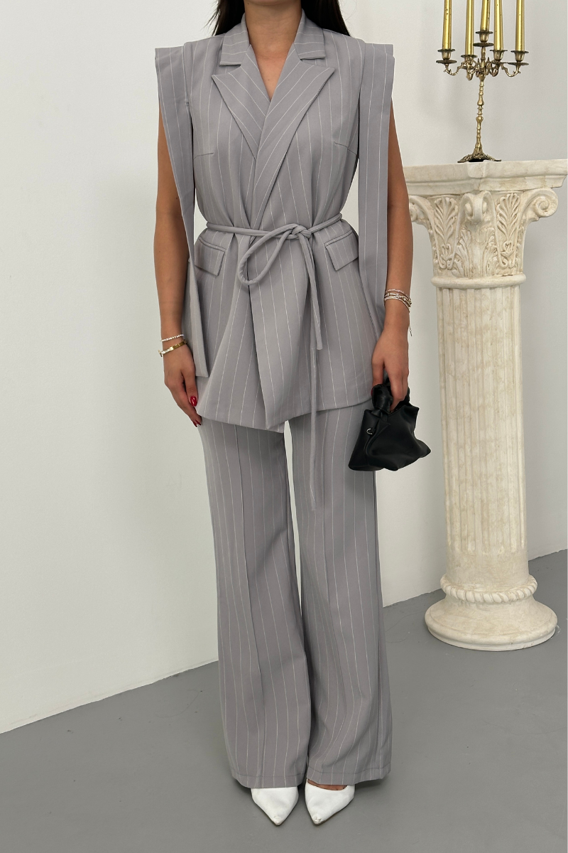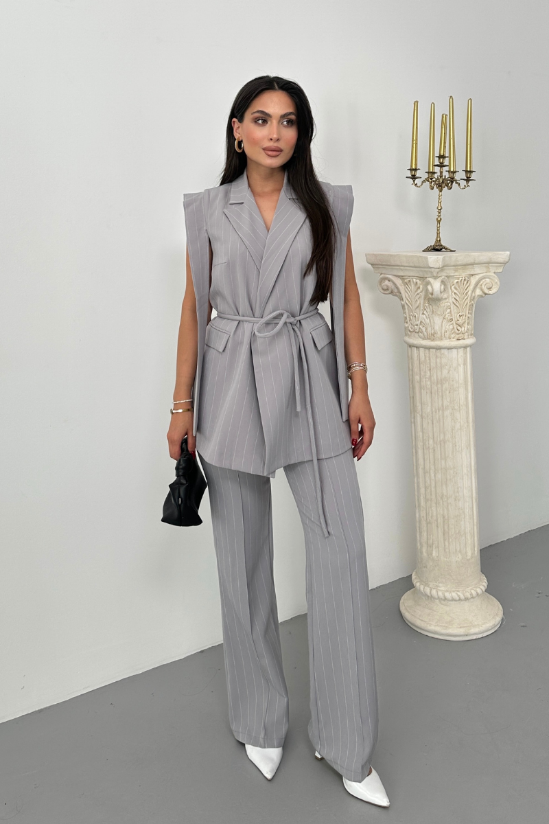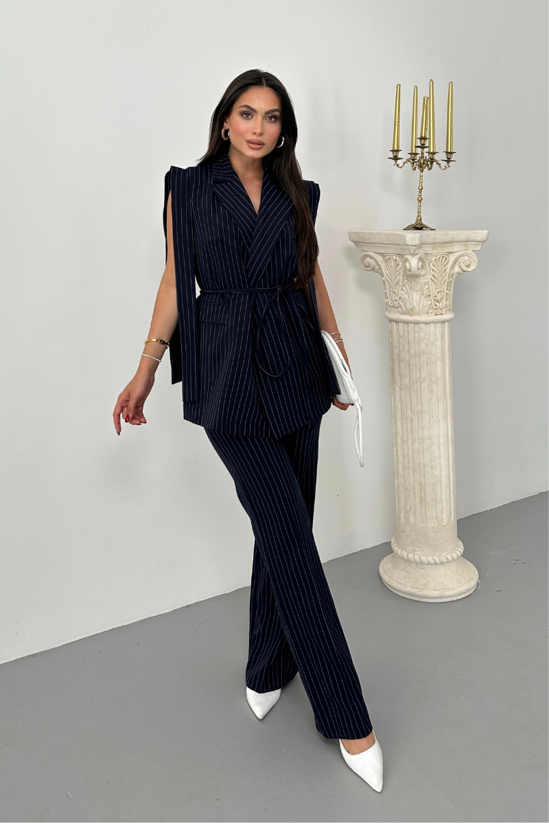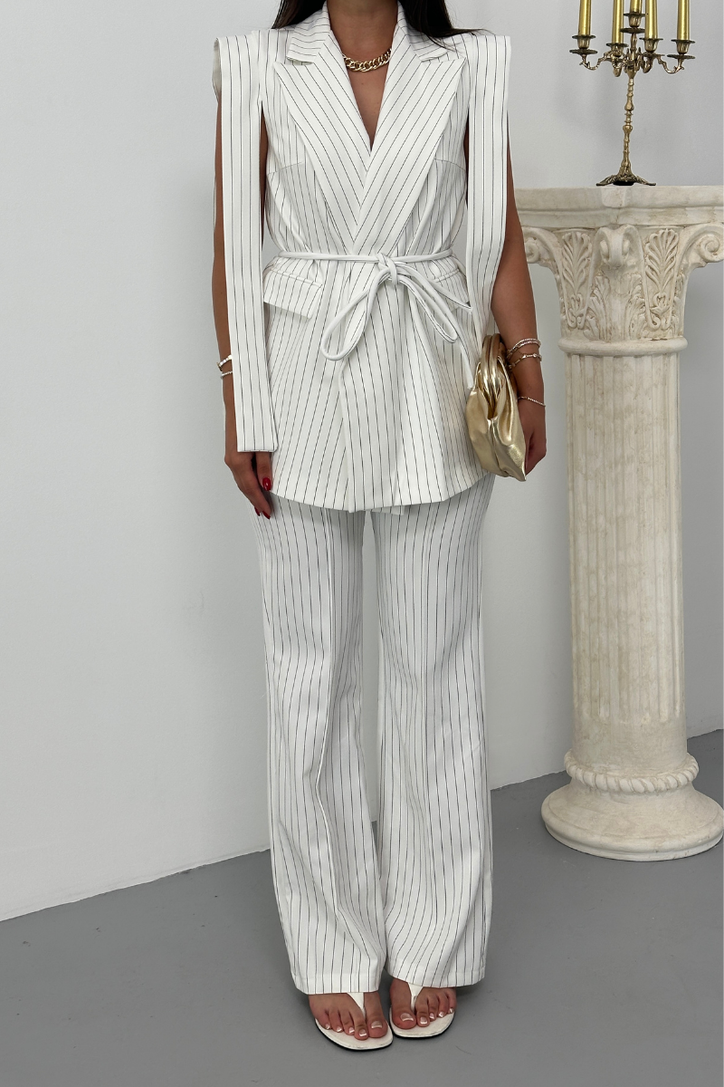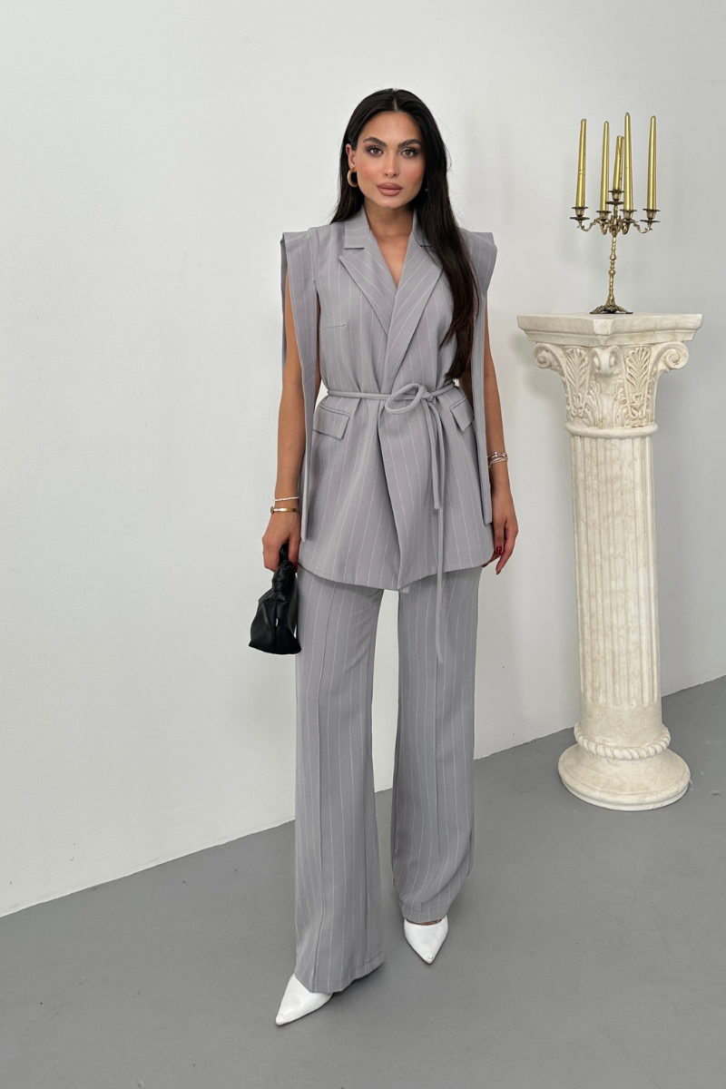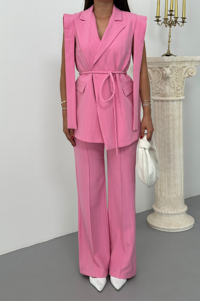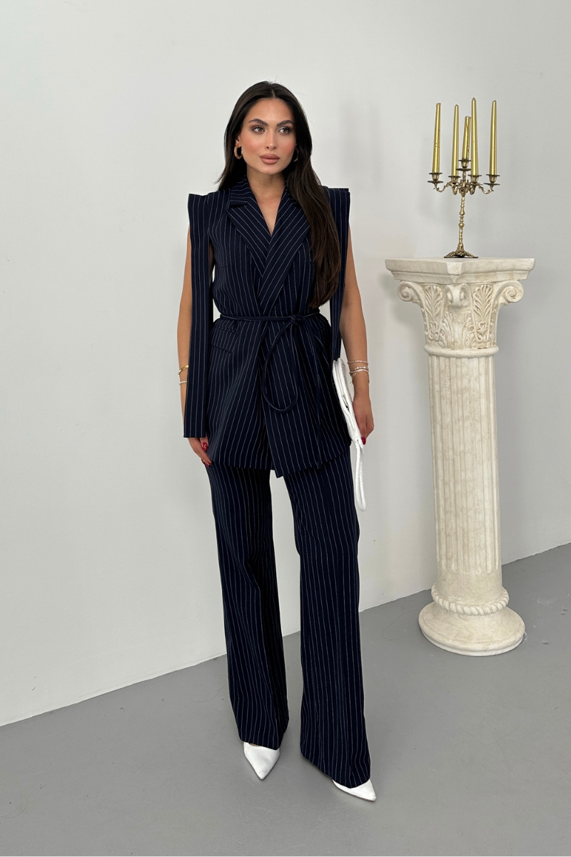 Kadın Alt Üst İkili Takım Çizgili Omuz Detaylı Kuşaklı Yelek Pantolon Takım