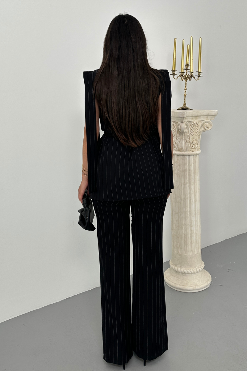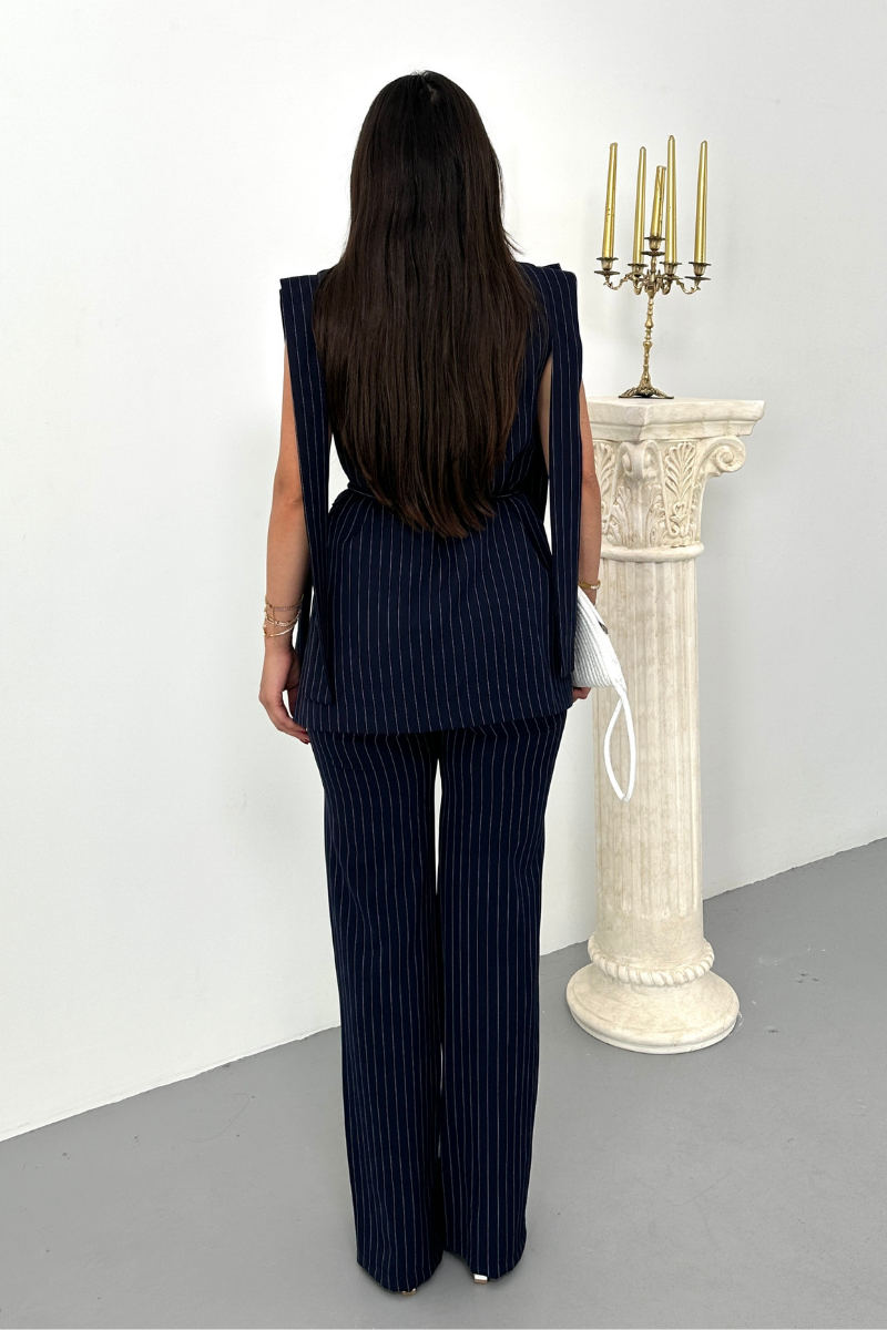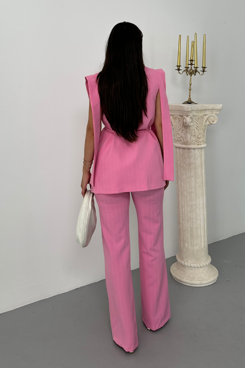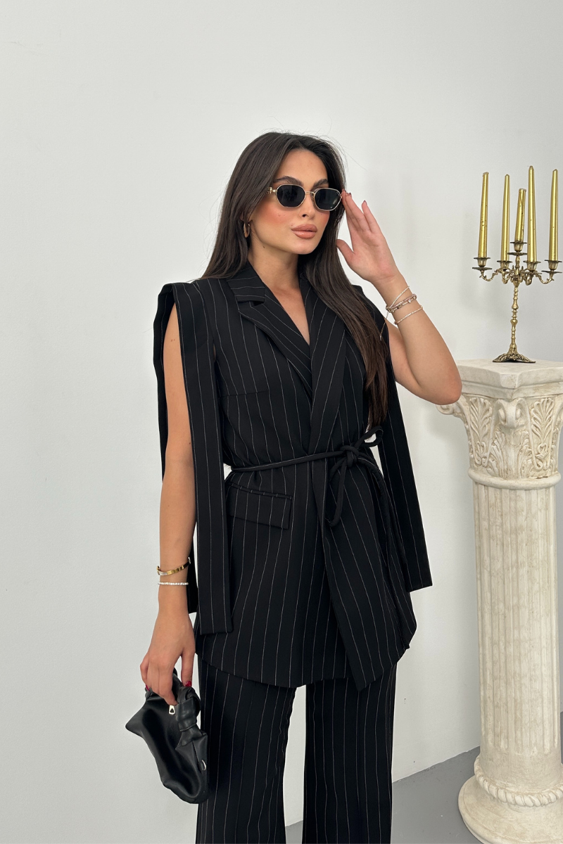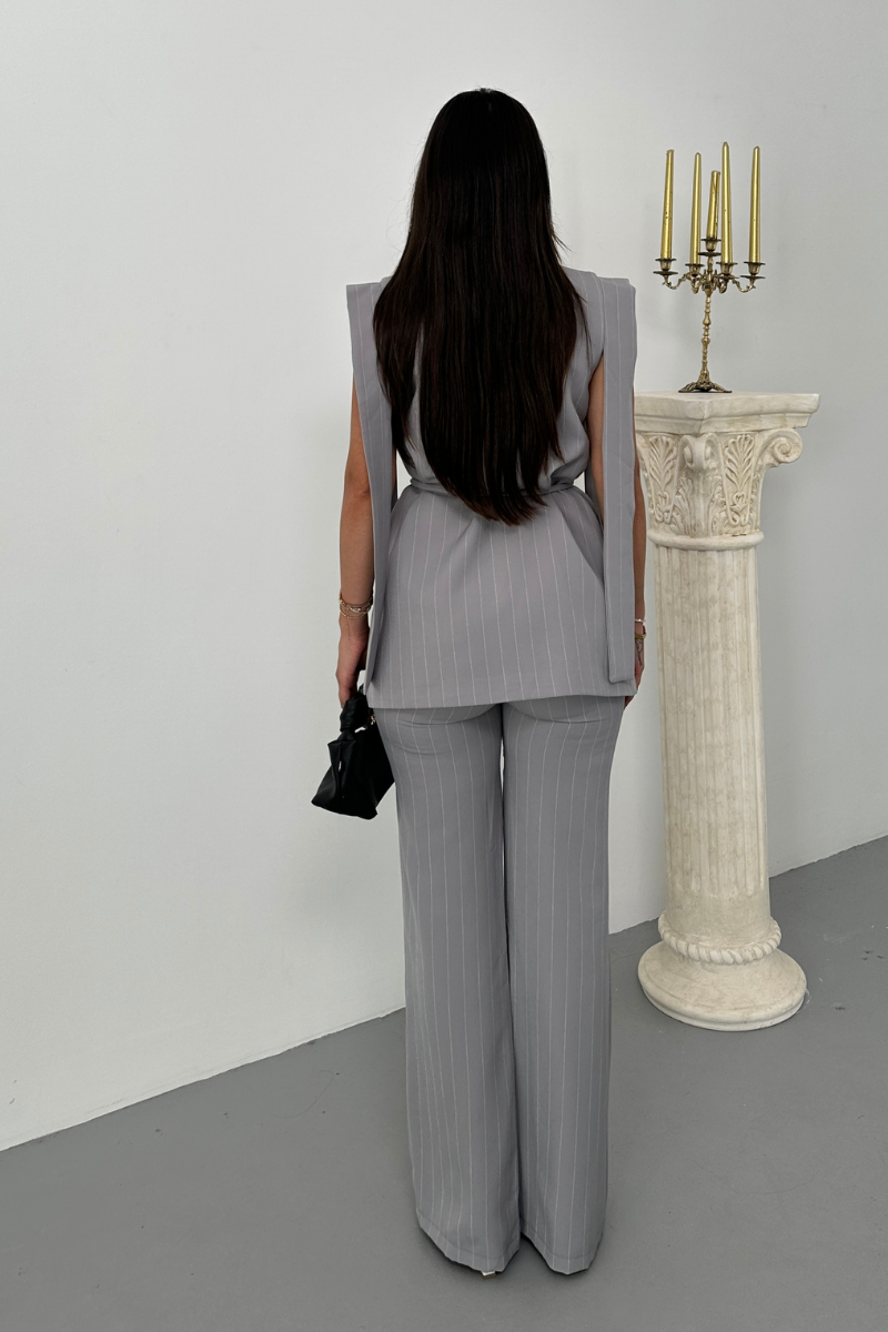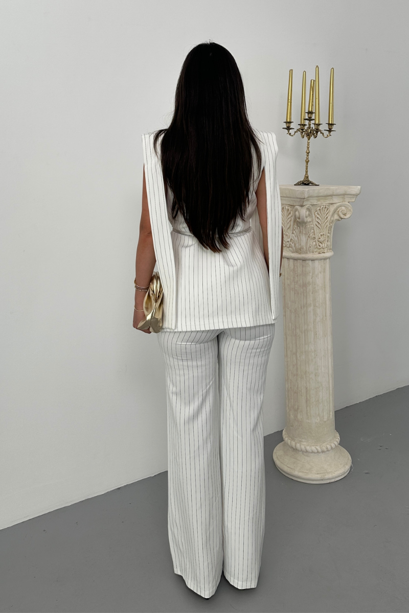 Kadın Alt Üst İkili Takım Çizgili Omuz Detaylı Kuşaklı Yelek Pantolon Takım