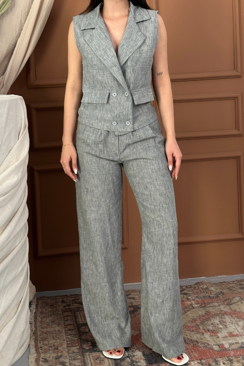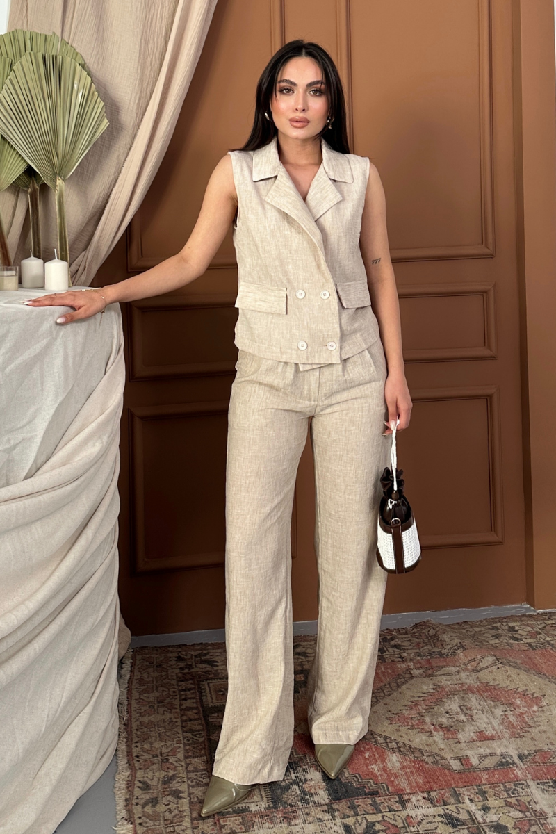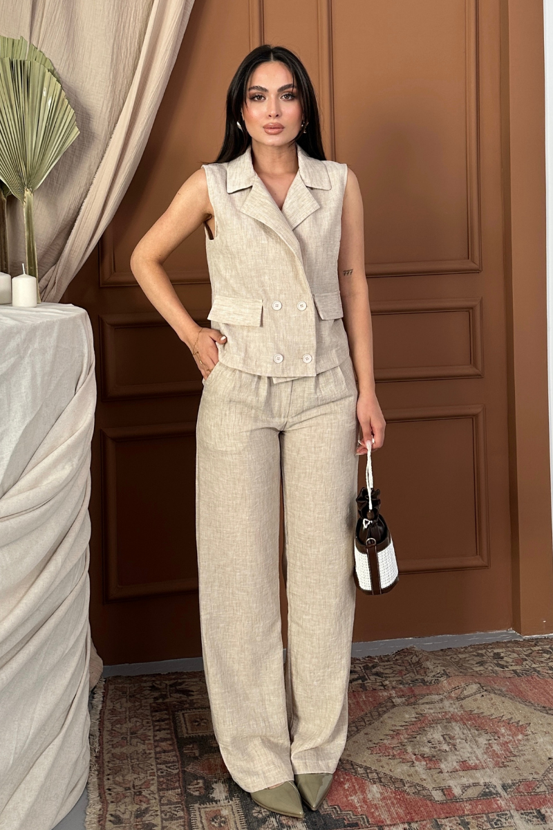 Kadın Alt Üst Takım Keten Düğme ve Cep Detaylı Kruvaze Yaka Yelek Bol Paça Pantolon Takım