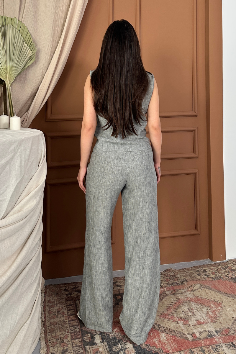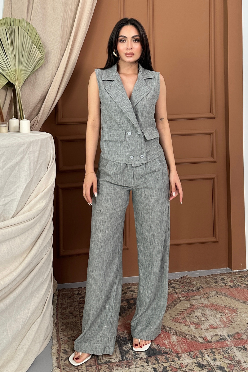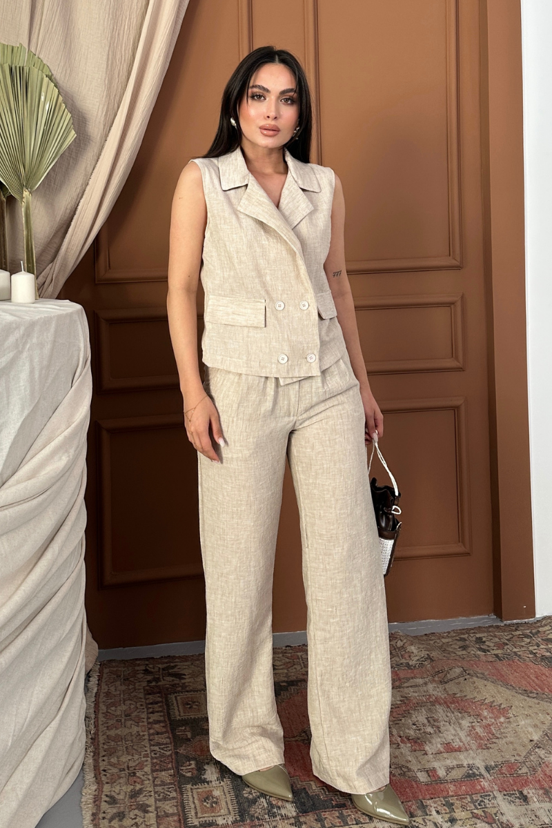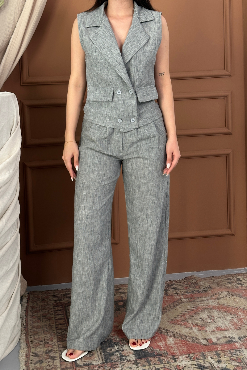 Kadın Alt Üst Takım Keten Düğme ve Cep Detaylı Kruvaze Yaka Yelek Bol Paça Pantolon Takım