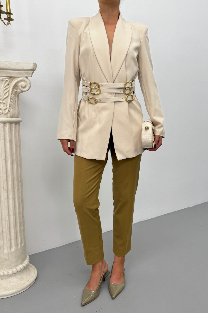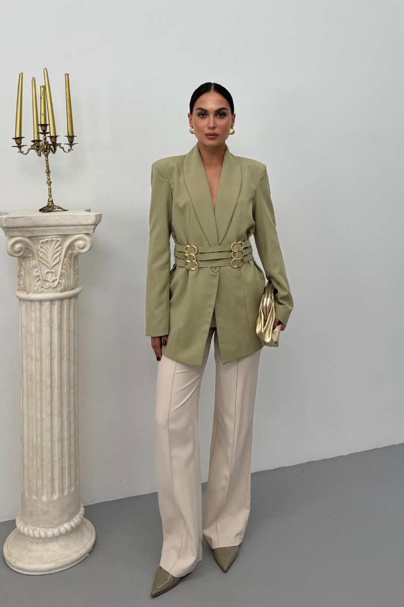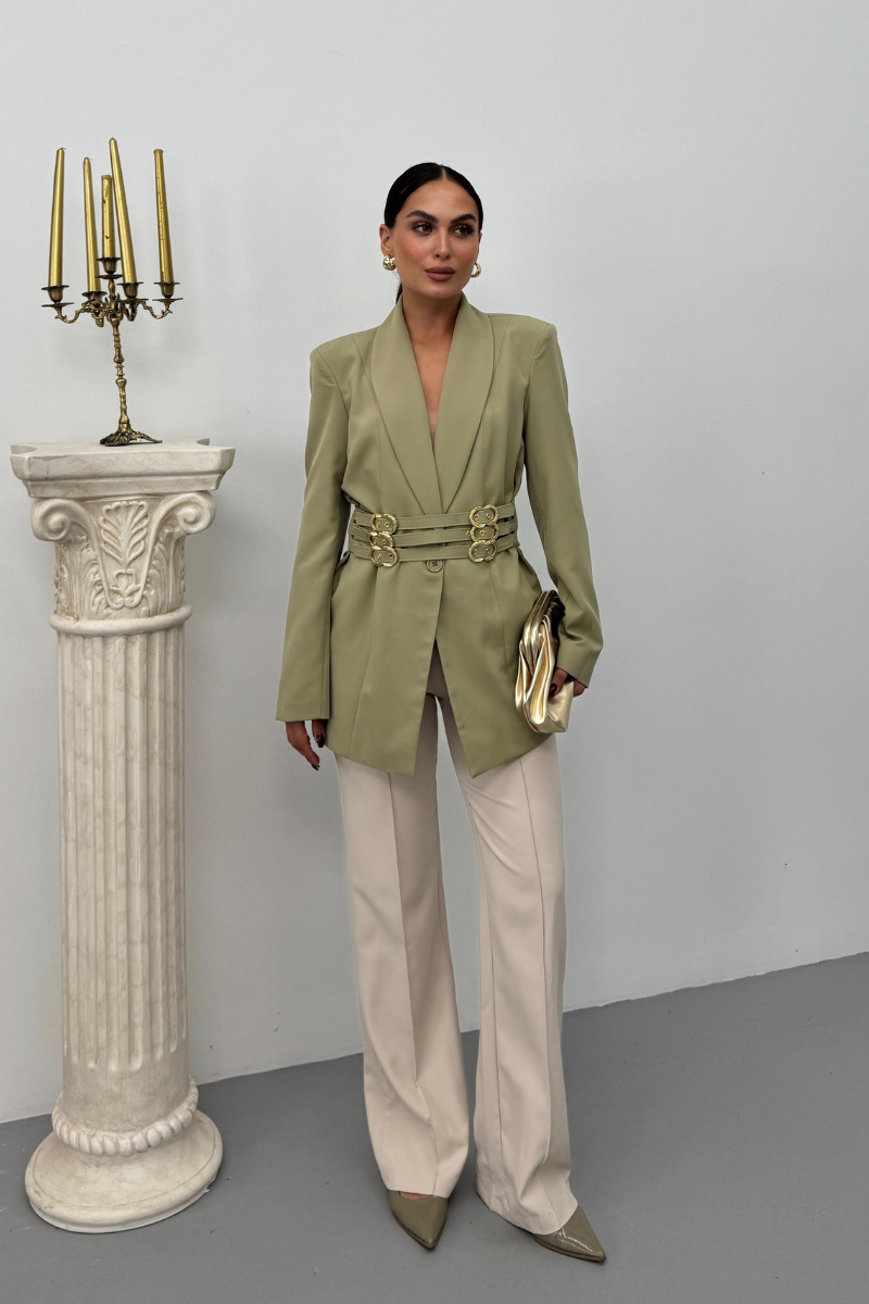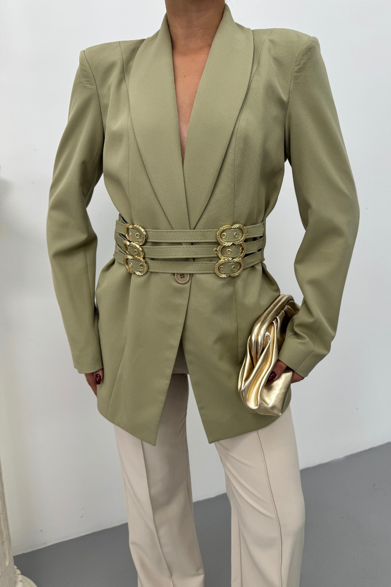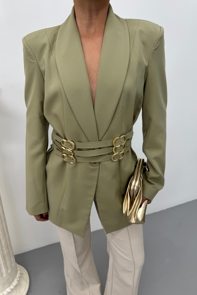 Kadın Blazer Ceket Şık Kruvaze Yaka Vatkalı Gold Kemer Detaylı Ceket
