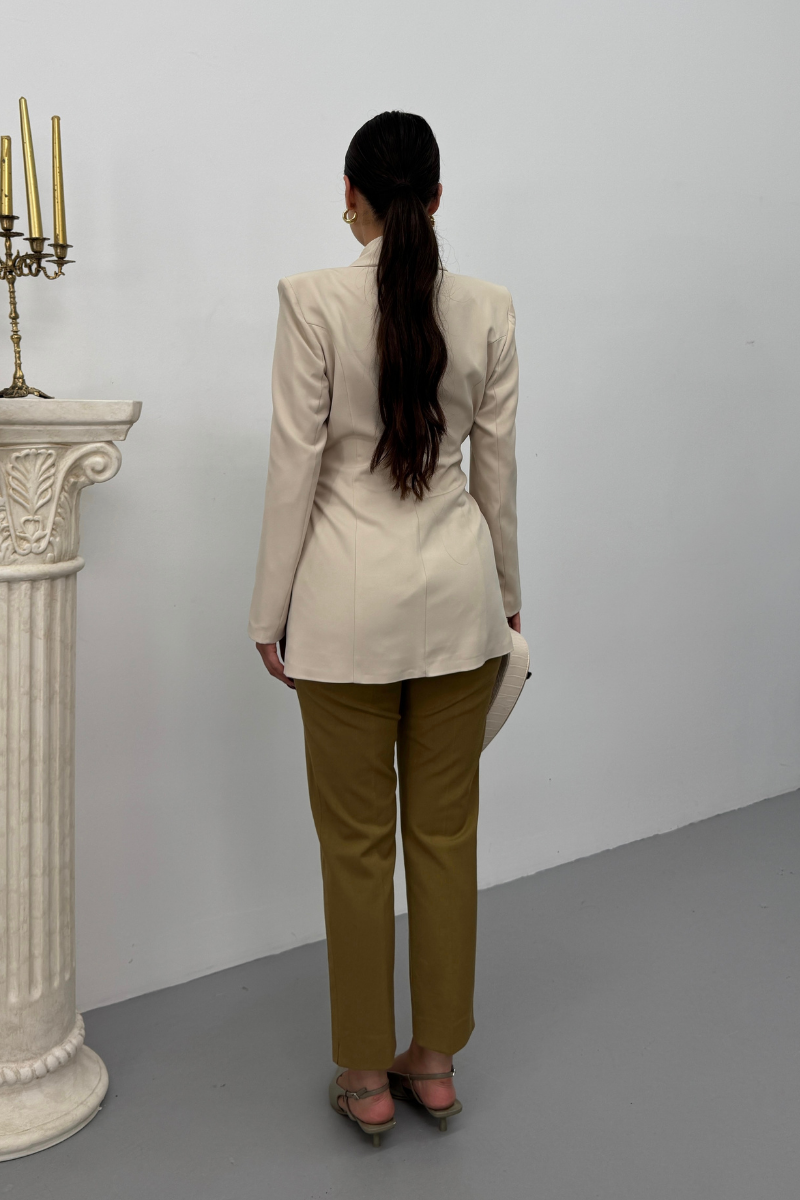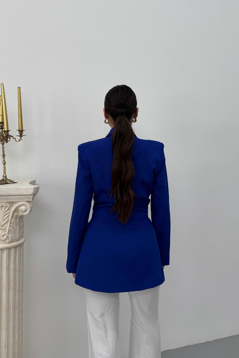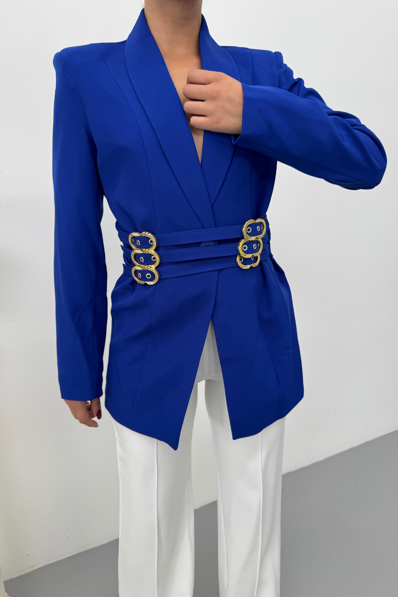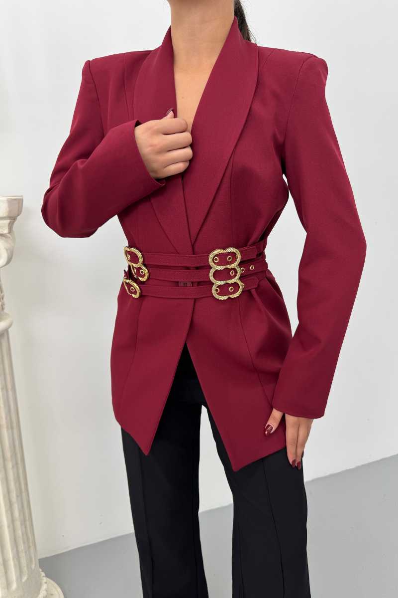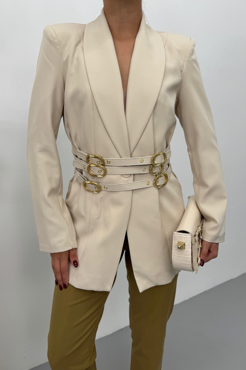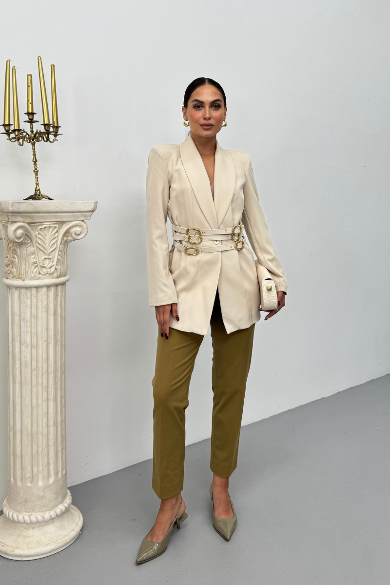 Kadın Blazer Ceket Şık Kruvaze Yaka Vatkalı Gold Kemer Detaylı Ceket