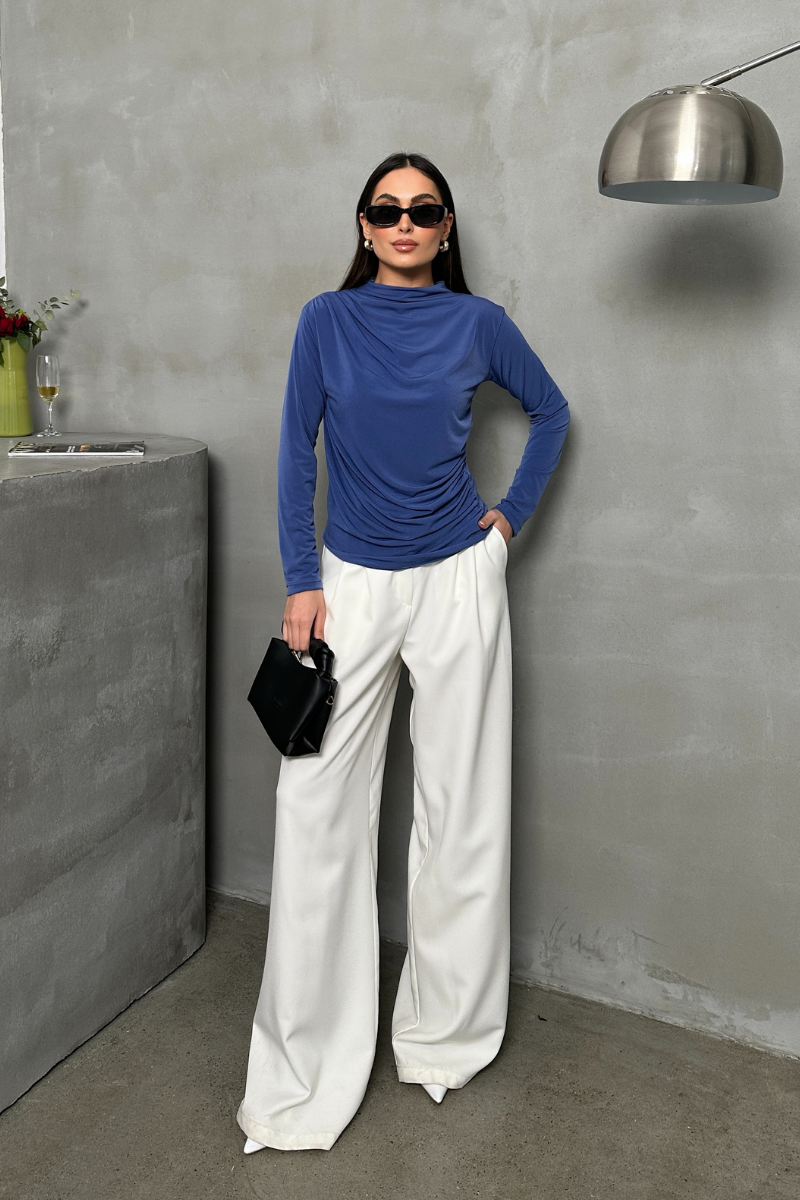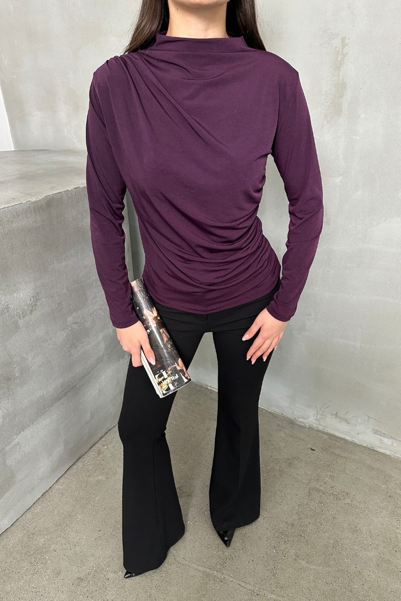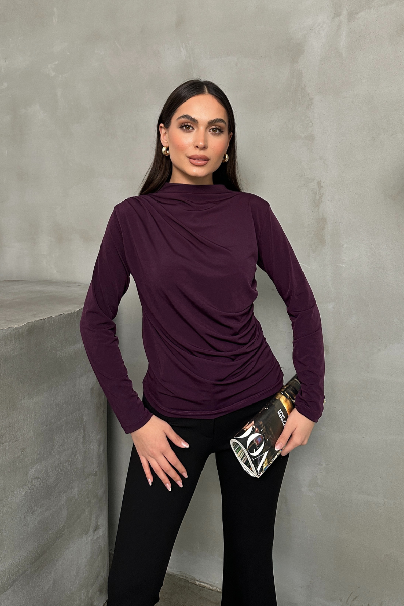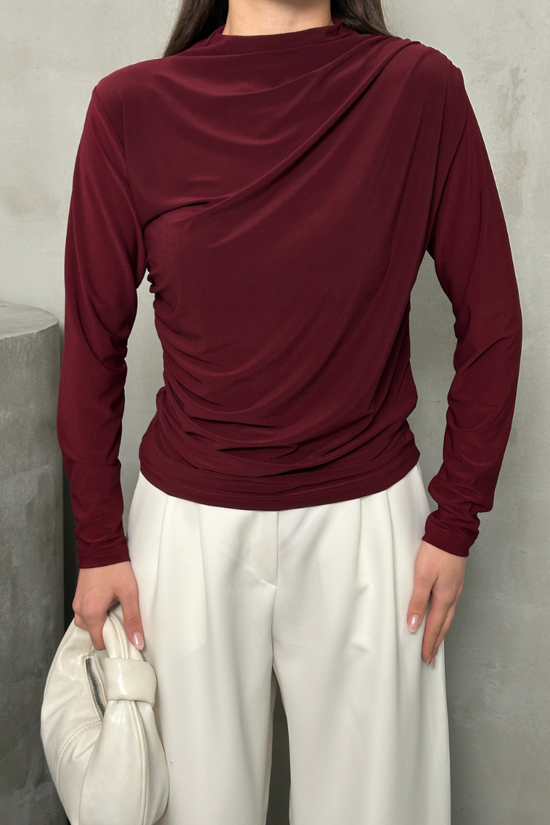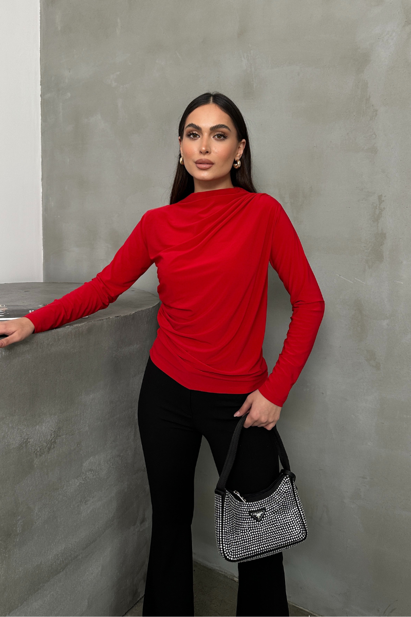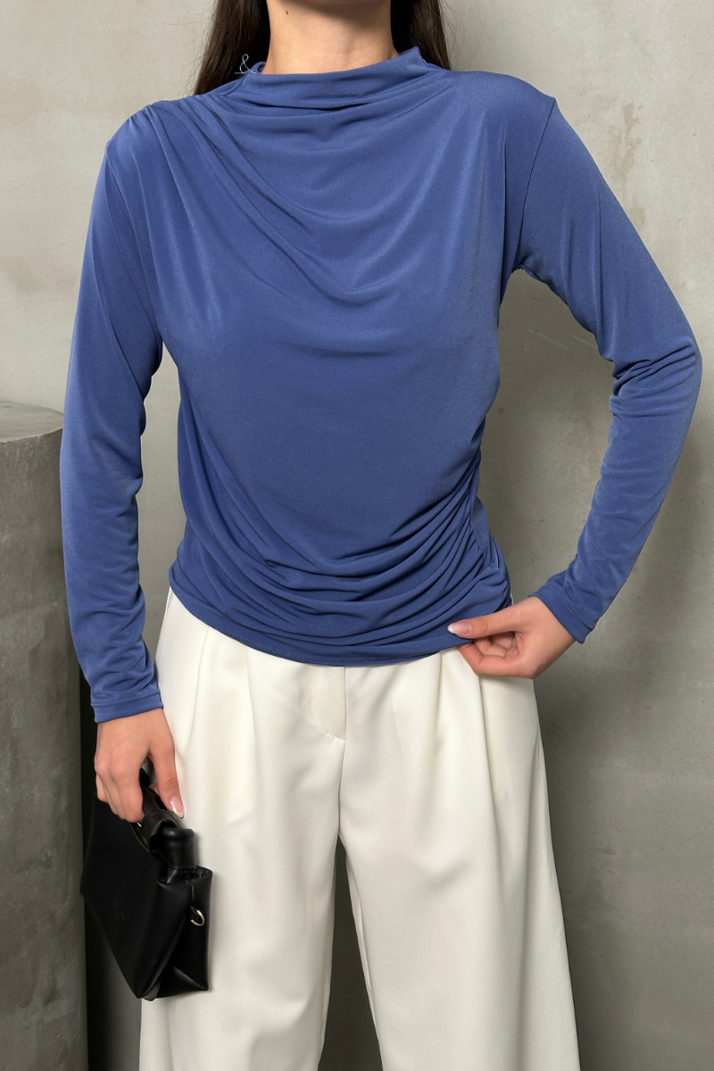 Zarif ve şık duruşuyla öne çıkan bu bluz, asimetrik drape detaylarıyla modern bir hava katıyor. Yumuşak ve esnek kumaşı sayesinde hem rahat hem de vücuda uyum sağlayan bir kesime sahiptir. Günlük kombinlerinizde şıklığı yakalamak veya özel davetlerde sofistike bir stil oluşturmak için ideal bir seçim!