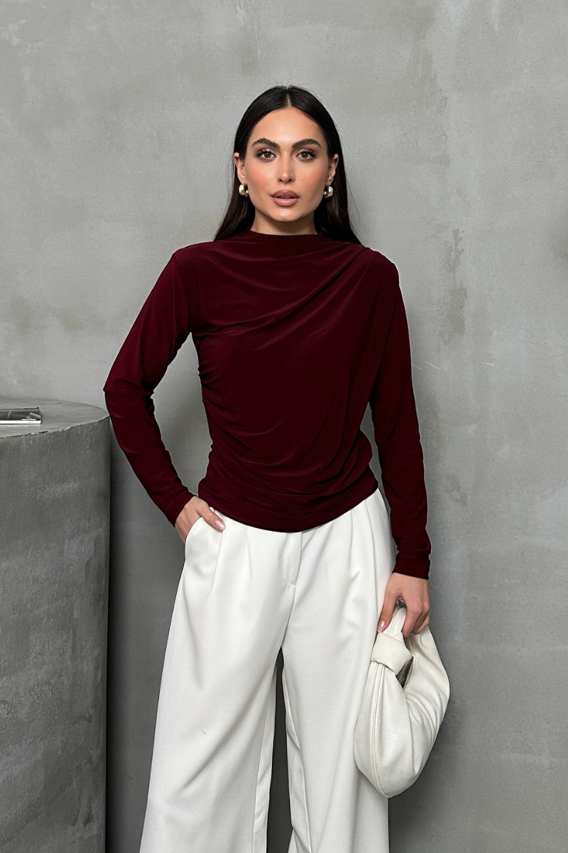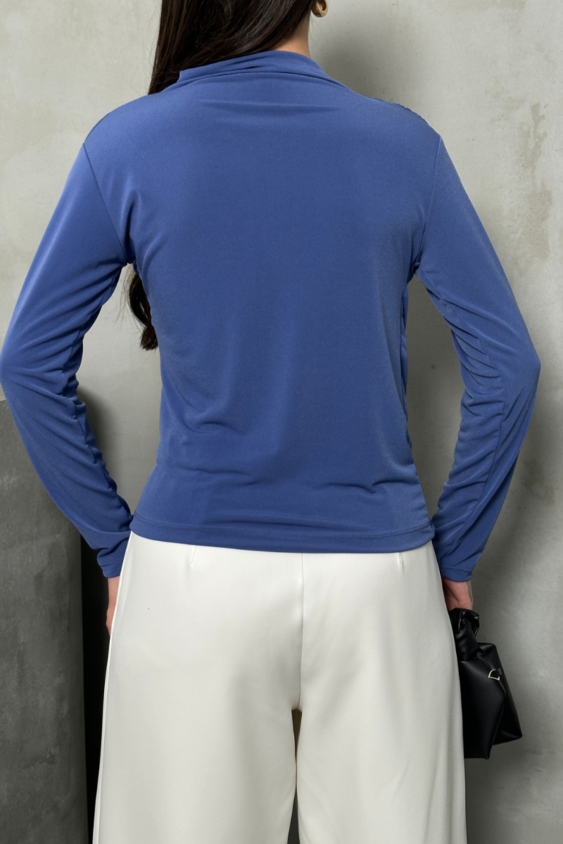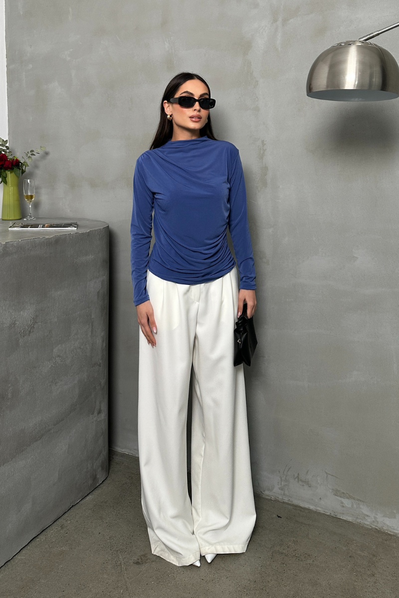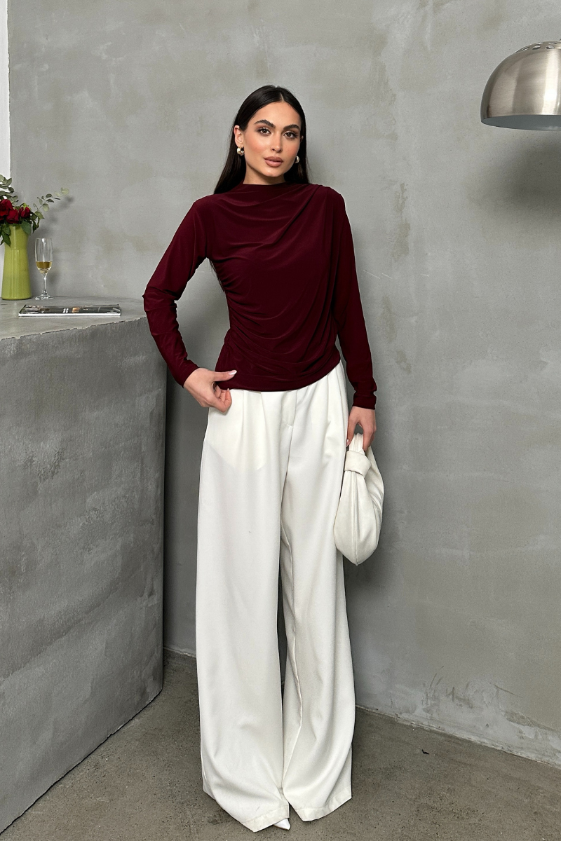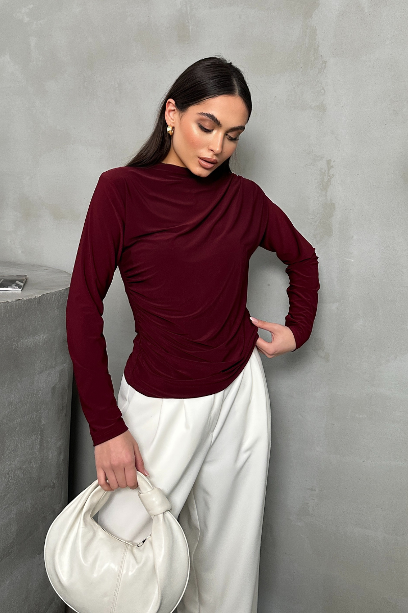 Zarif ve şık duruşuyla öne çıkan bu bluz, asimetrik drape detaylarıyla modern bir hava katıyor. Yumuşak ve esnek kumaşı sayesinde hem rahat hem de vücuda uyum sağlayan bir kesime sahiptir. Günlük kombinlerinizde şıklığı yakalamak veya özel davetlerde sofistike bir stil oluşturmak için ideal bir seçim!