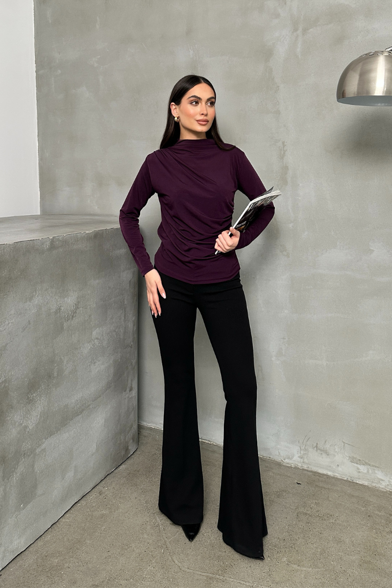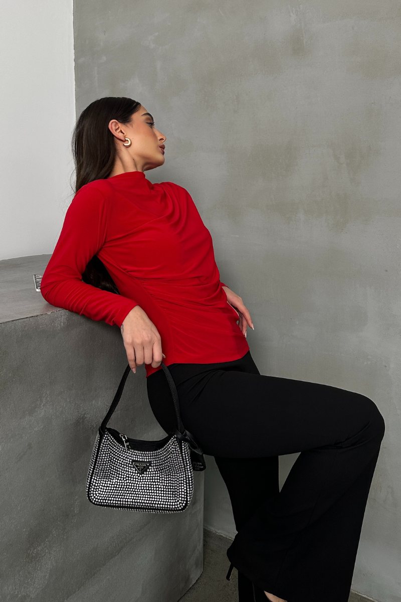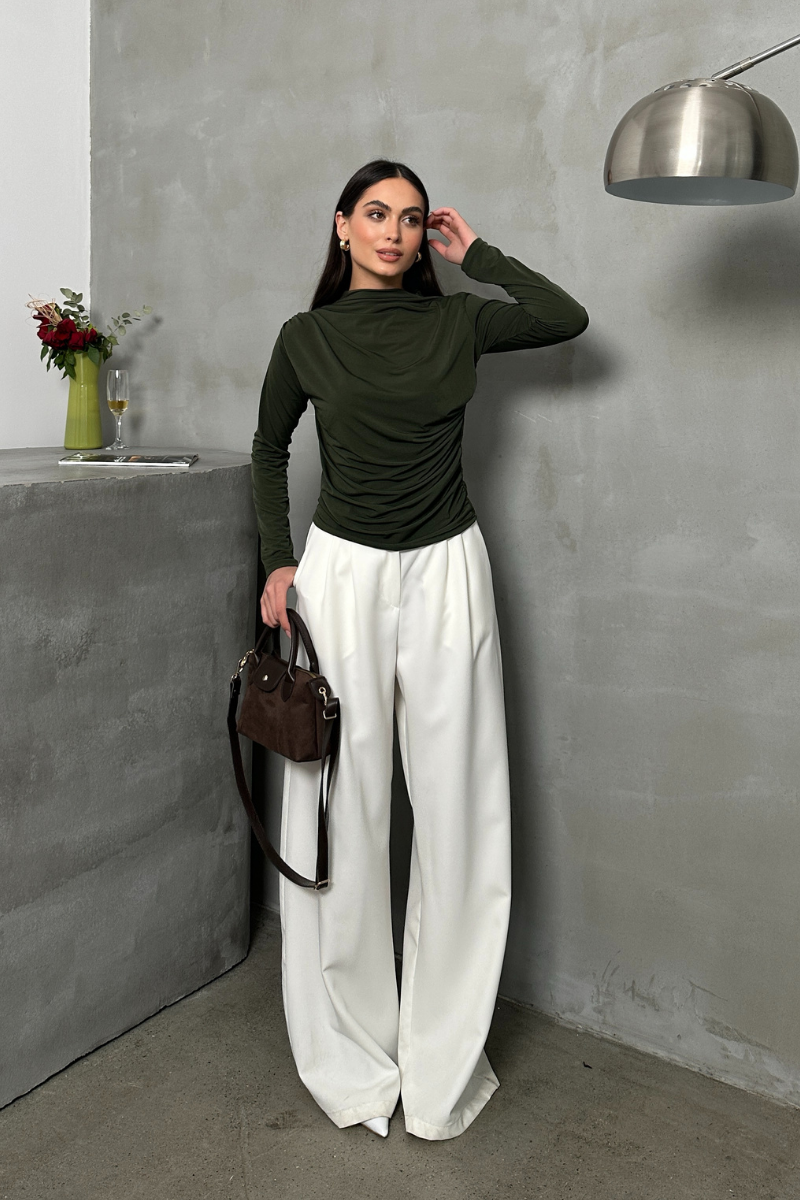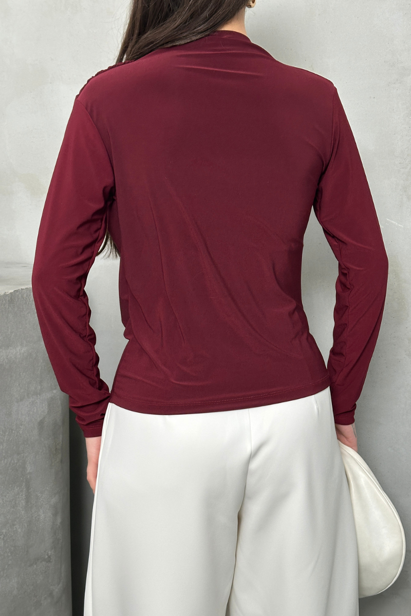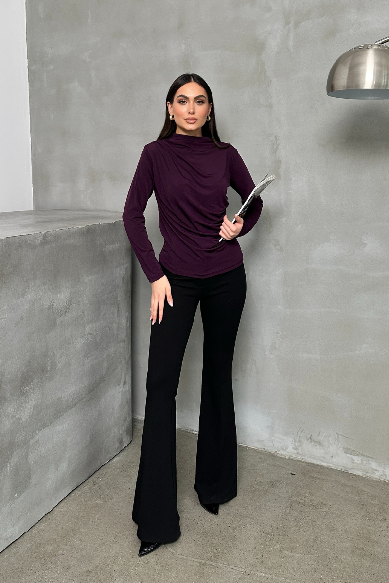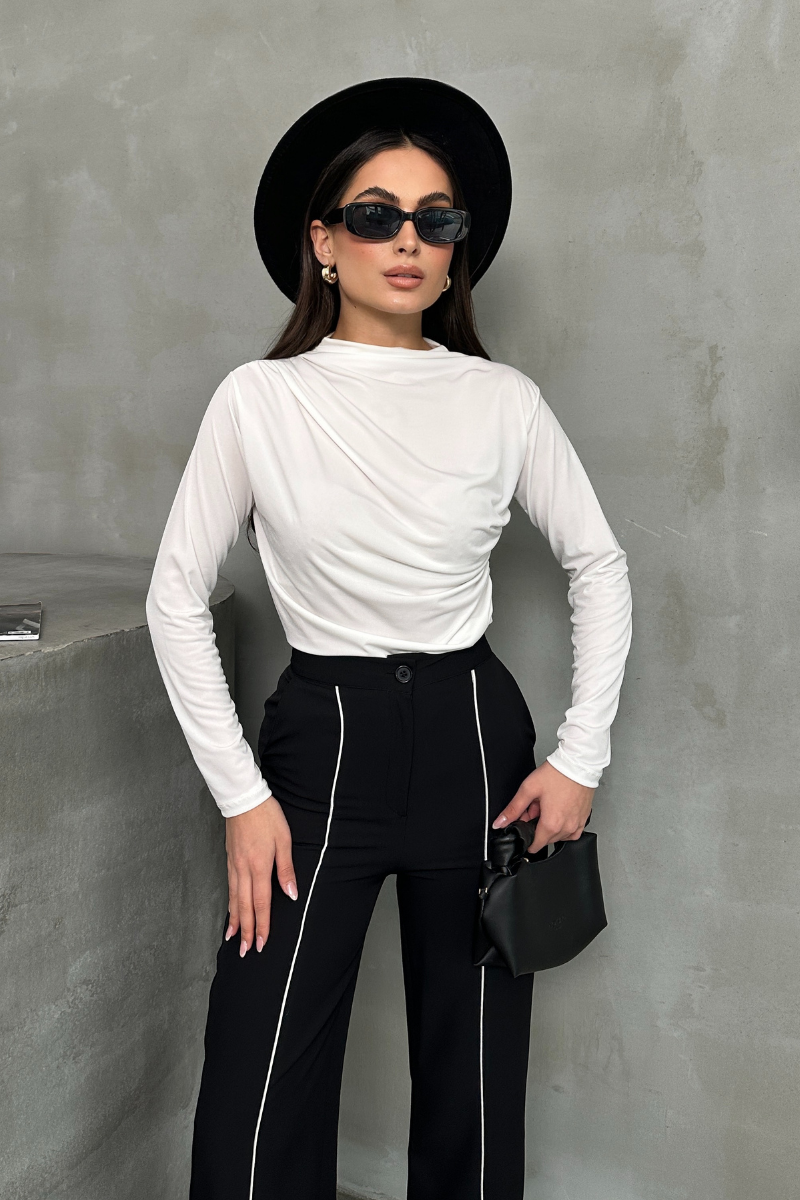 Zarif ve şık duruşuyla öne çıkan bu bluz, asimetrik drape detaylarıyla modern bir hava katıyor. Yumuşak ve esnek kumaşı sayesinde hem rahat hem de vücuda uyum sağlayan bir kesime sahiptir. Günlük kombinlerinizde şıklığı yakalamak veya özel davetlerde sofistike bir stil oluşturmak için ideal bir seçim!