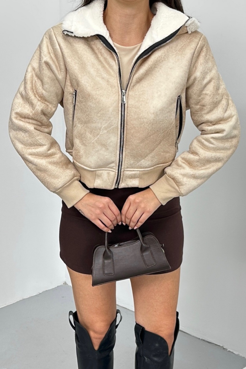 Kadın Ceket Kısa Süet İçi Kürklü Fermuarlı Çift Cepli Ribanalı Kısa Mont