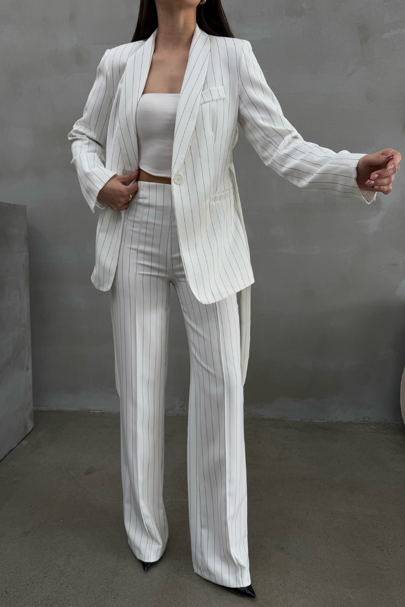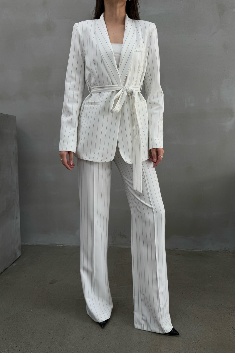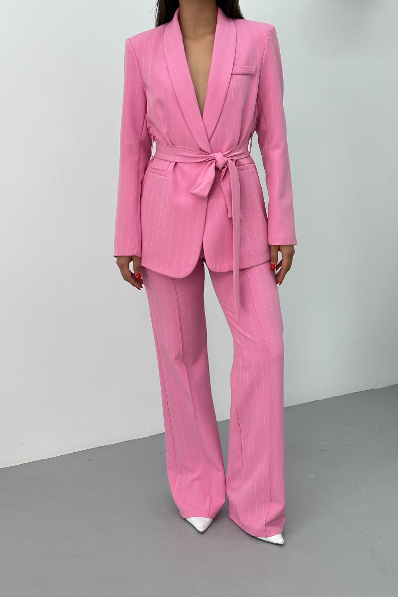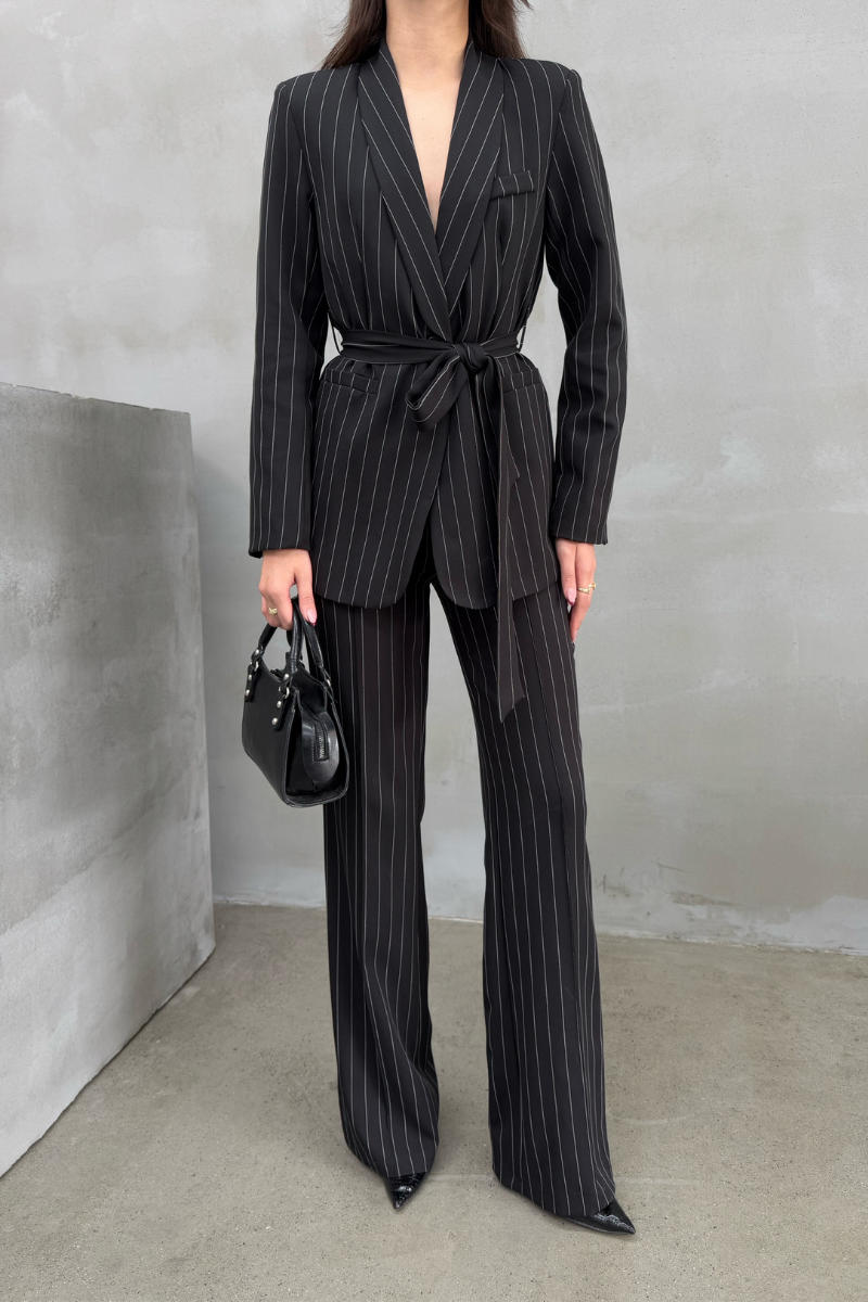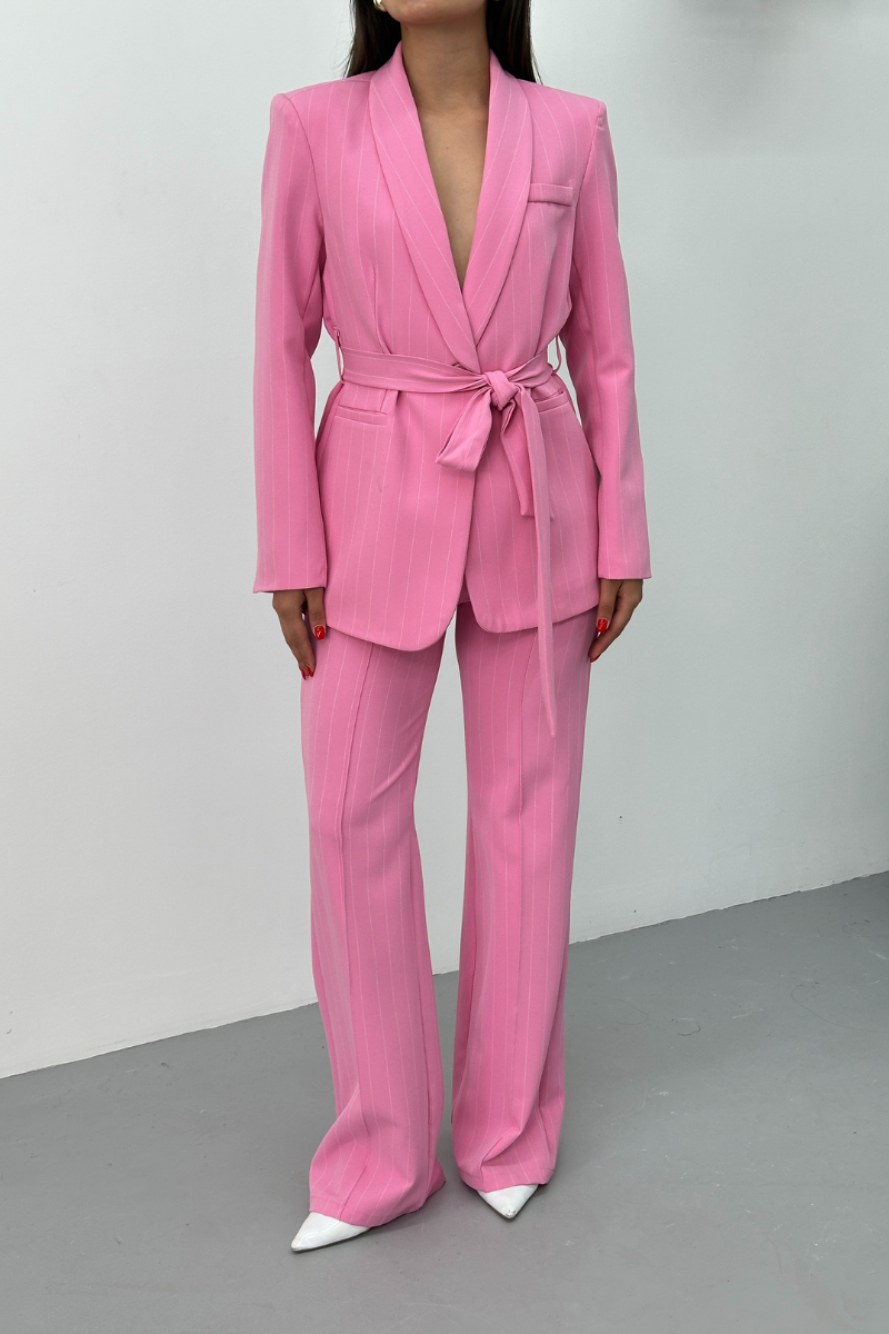 Kadın Çizgili Kuşaklı Blazer Ceket Pantolon Takım