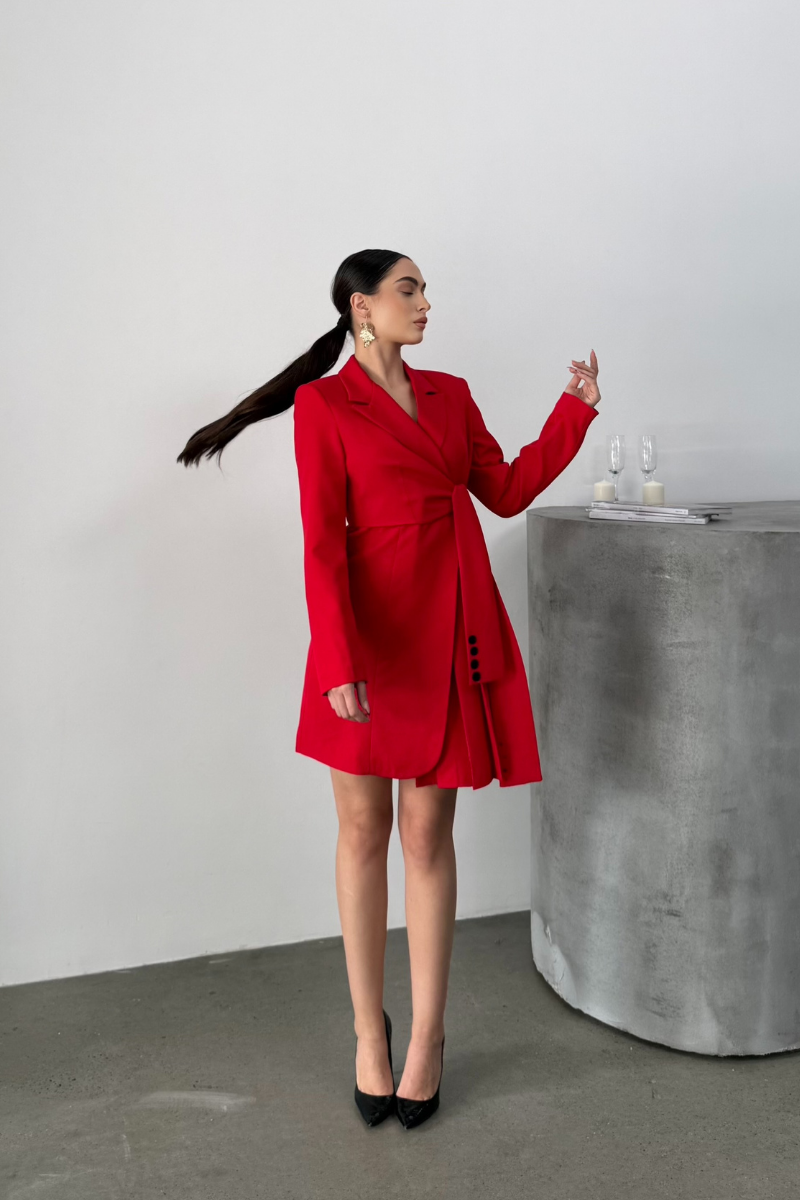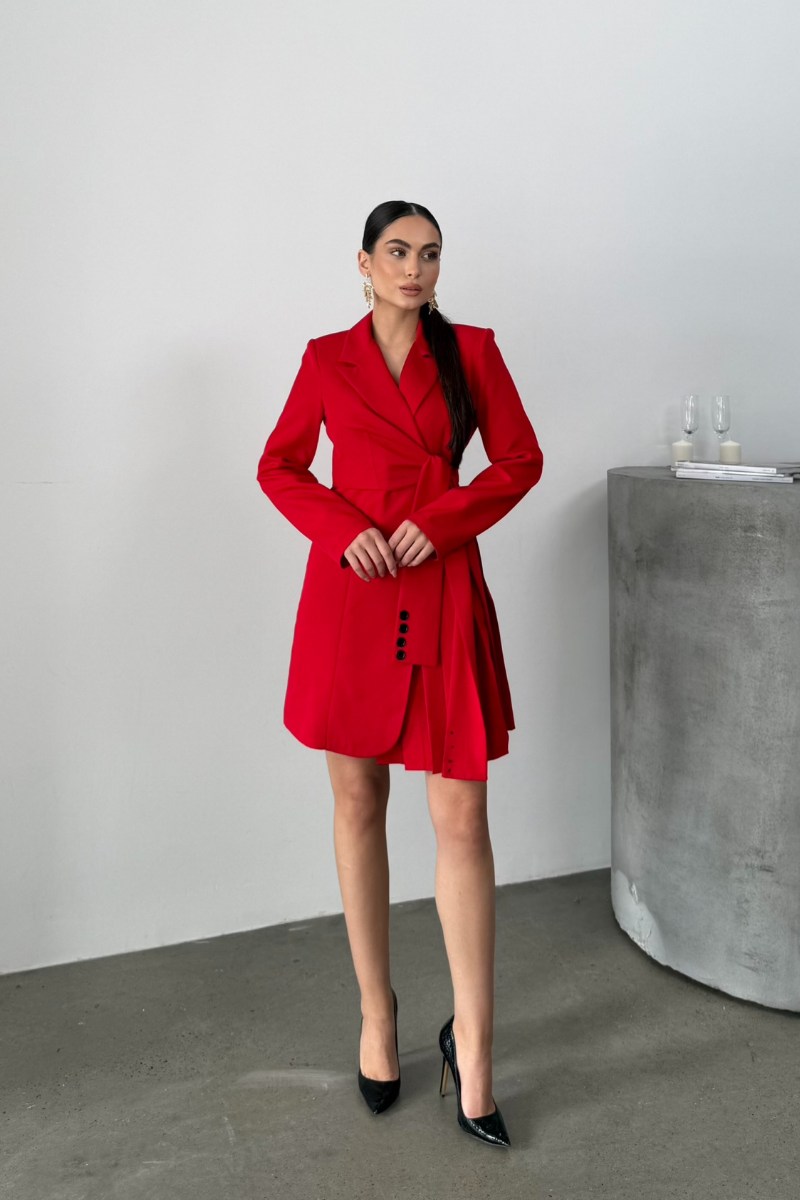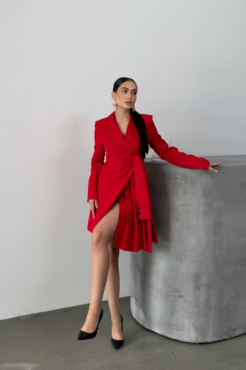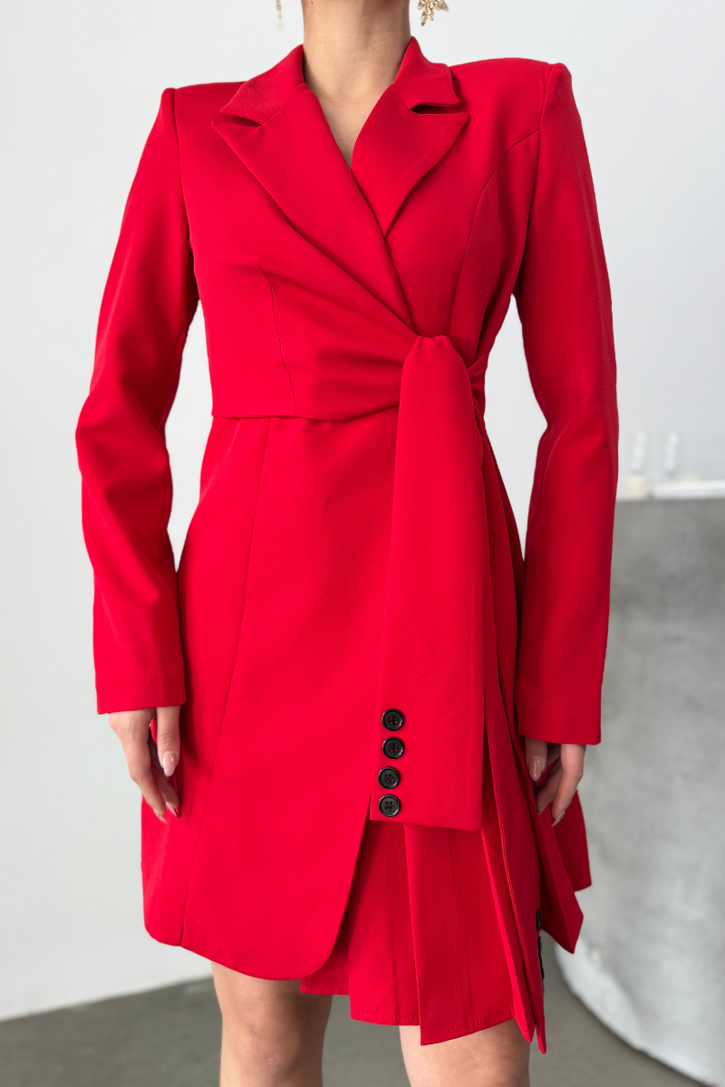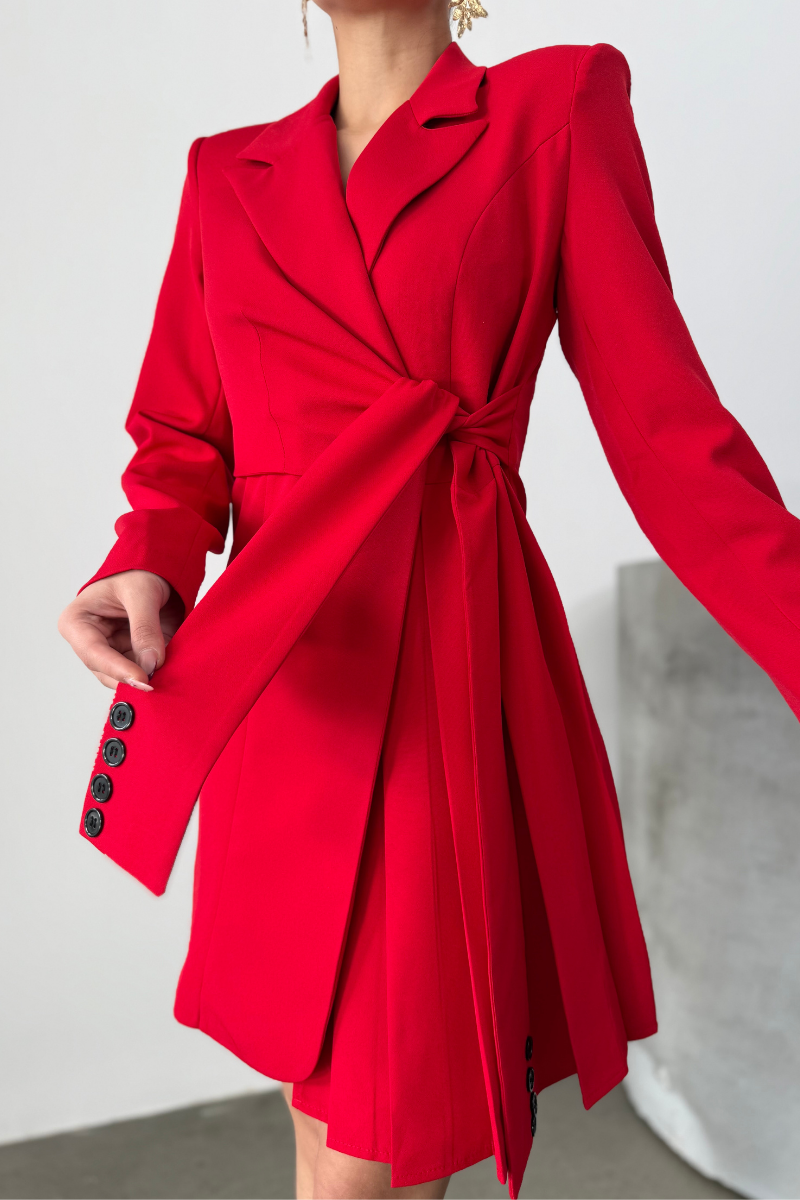 Şıklığı ve zarafeti bir arada sunan bu ceket elbise, özel günlerde ve davetlerde göz alıcı bir seçenek olacak.; Uzun kollu ve vatkalı olan elbise, feminen bir siluet sunar.; Üst kısmındaki ceket detayı ile formel bir görünüm sağlarken, alt kısmındaki kuşaklı ve pileli etek detayıyla da feminenliği ön plana çıkarır.; Çeşitli renk seçenekleriyle her tarza ve zevke hitap eder.; Gardırobunuzun özel parçalarından biri olacak bu elbiseyi keşfedin ve özel günlerinizde şıklığınızı tamamlayın.;