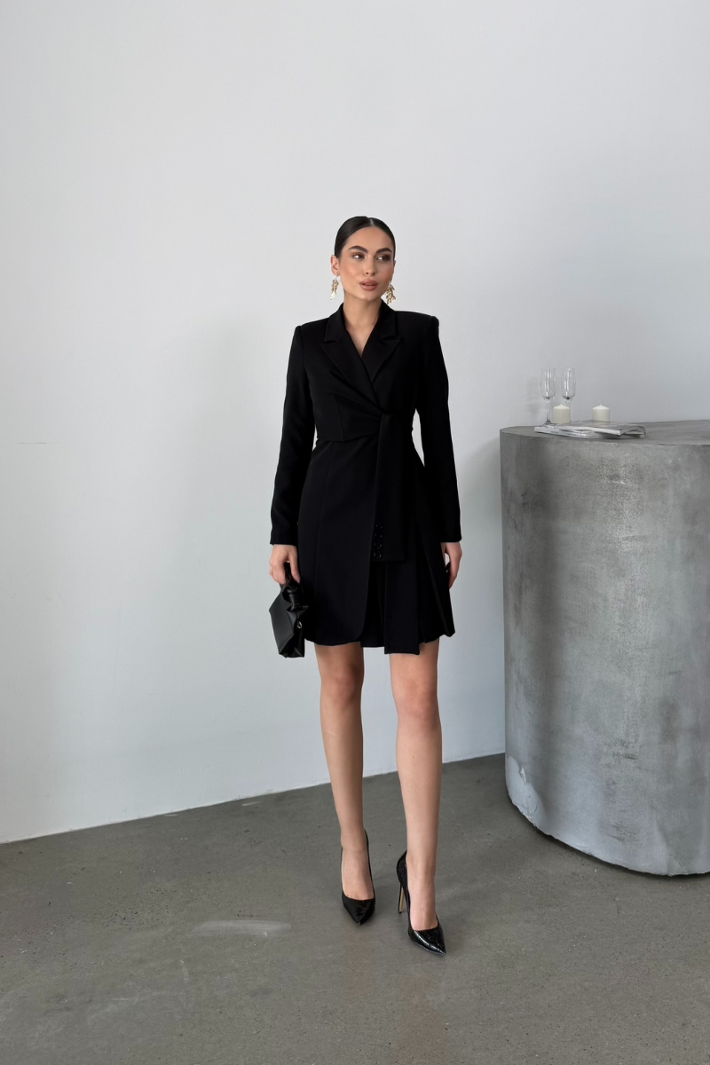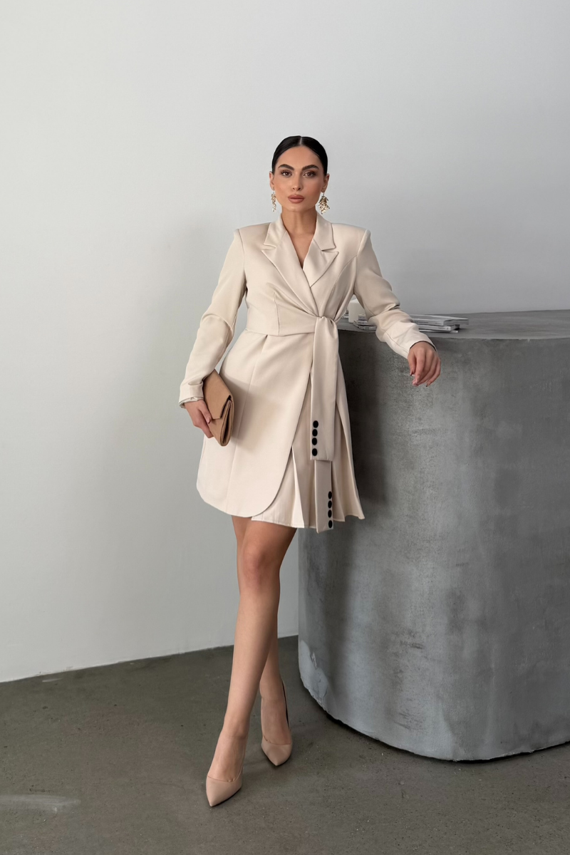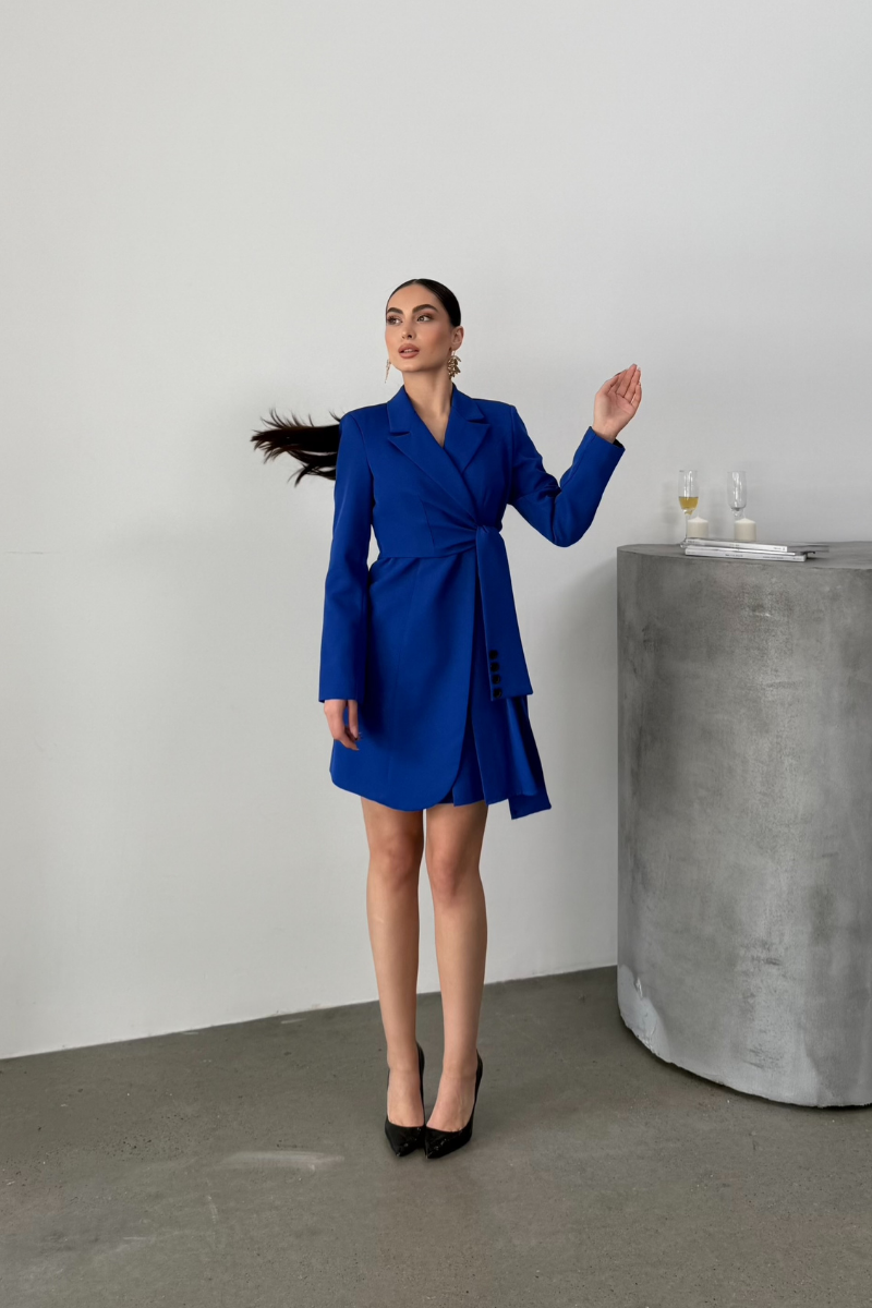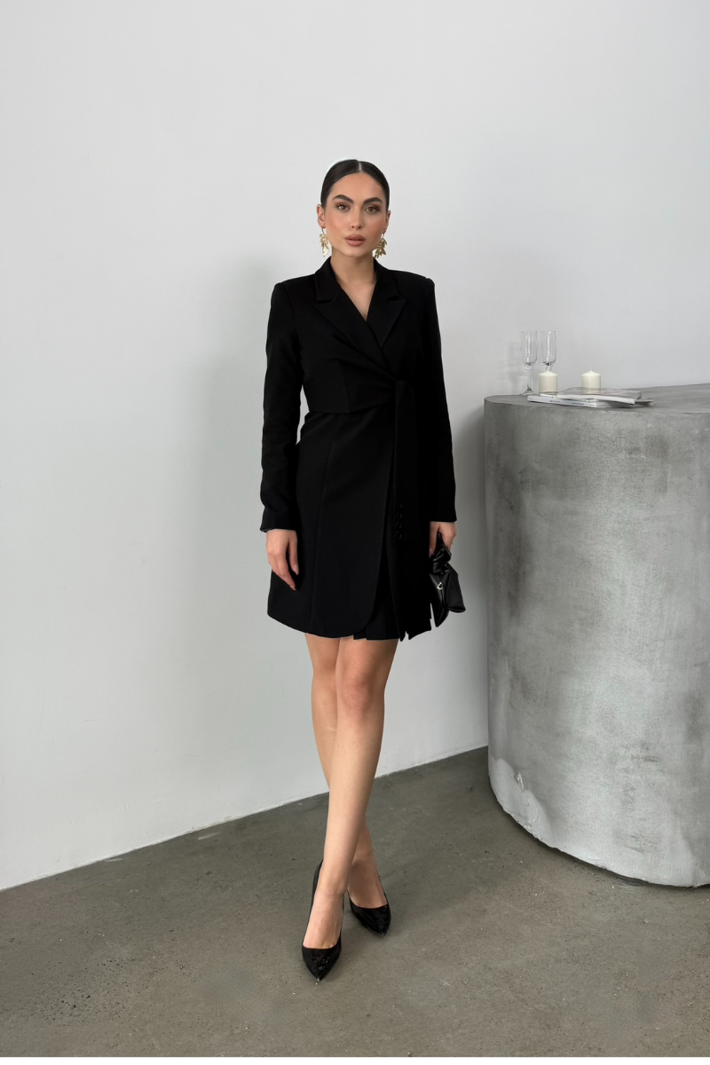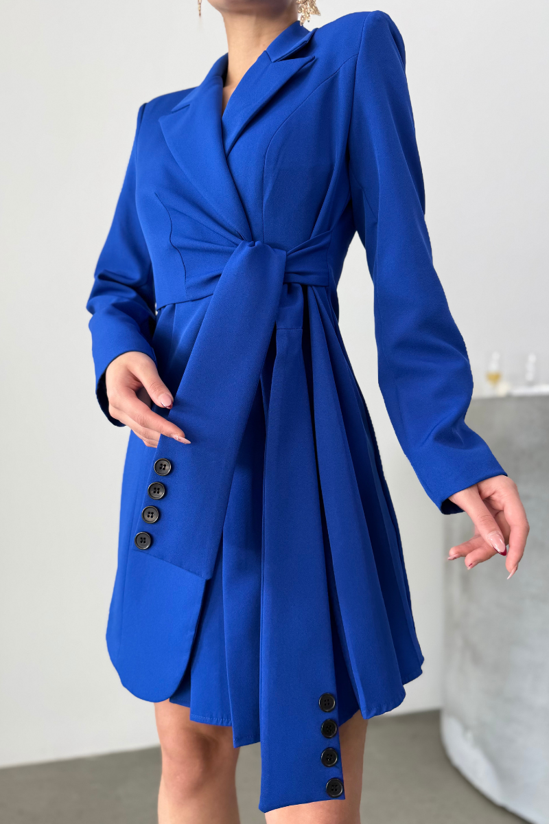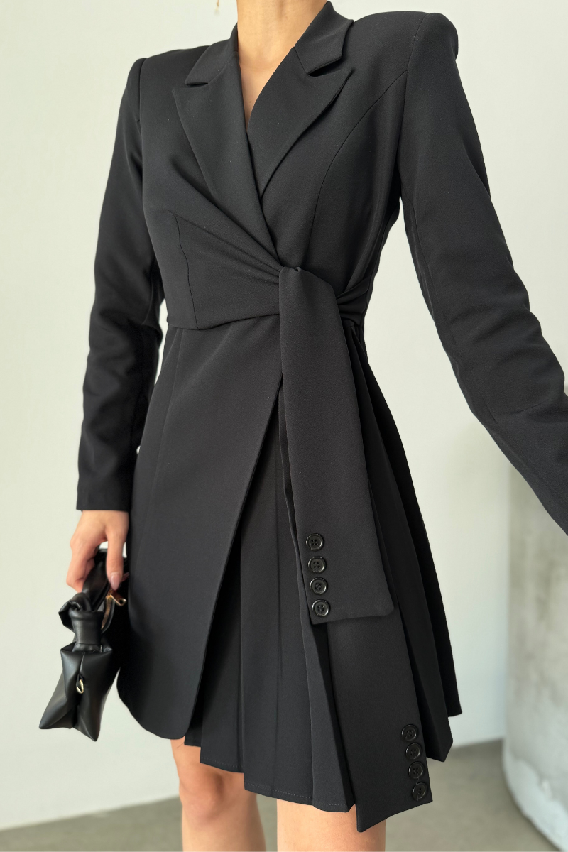 Kadın Elbise Mini Şık Uzun Kollu Kuşaklı Kruvaze Yaka Pileli Ceket Elbise