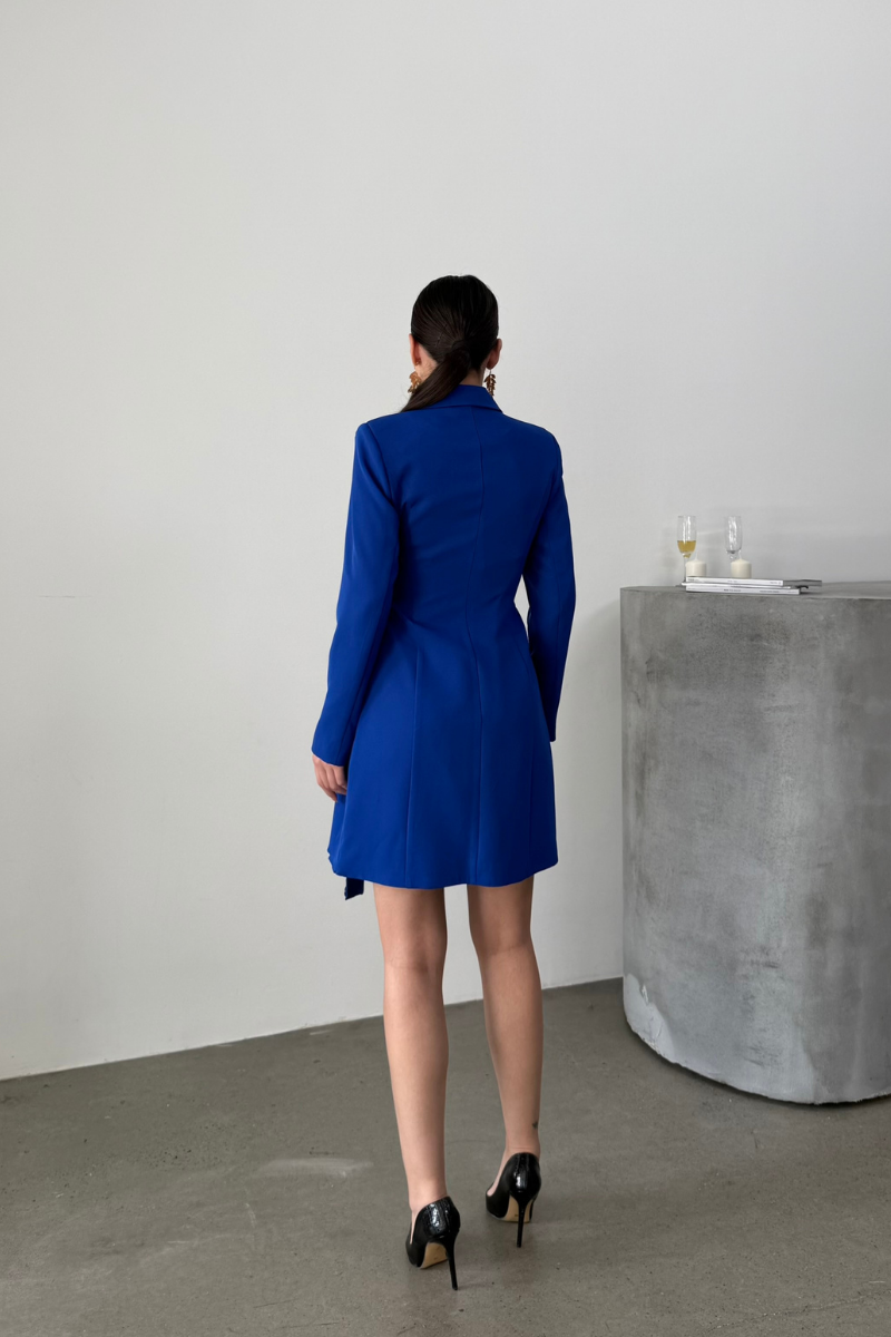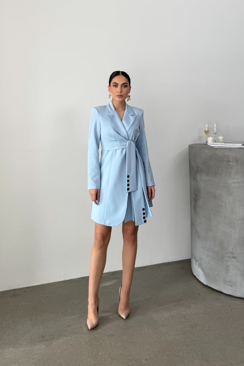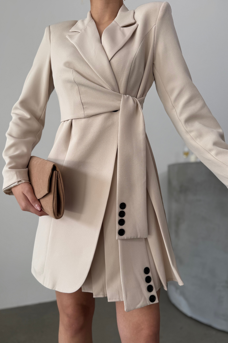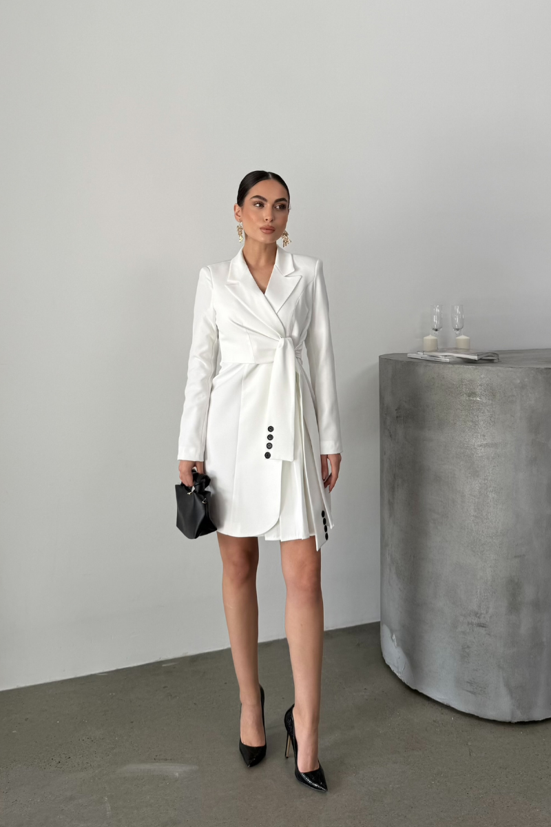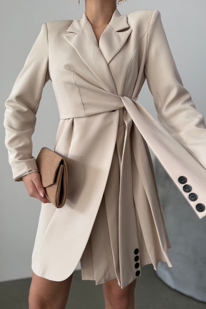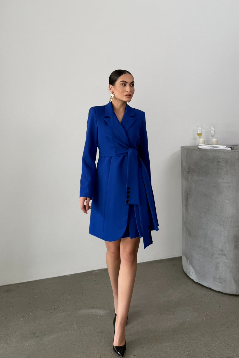 Kadın Elbise Mini Şık Uzun Kollu Kuşaklı Kruvaze Yaka Pileli Ceket Elbise