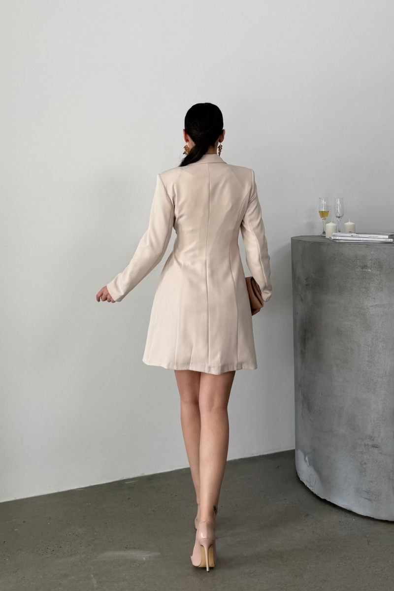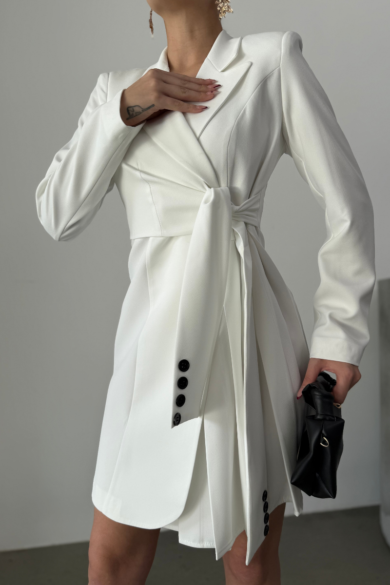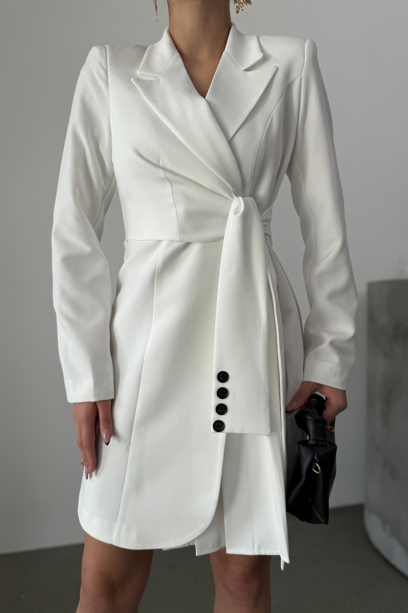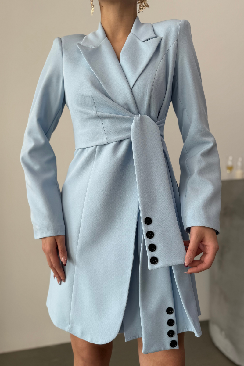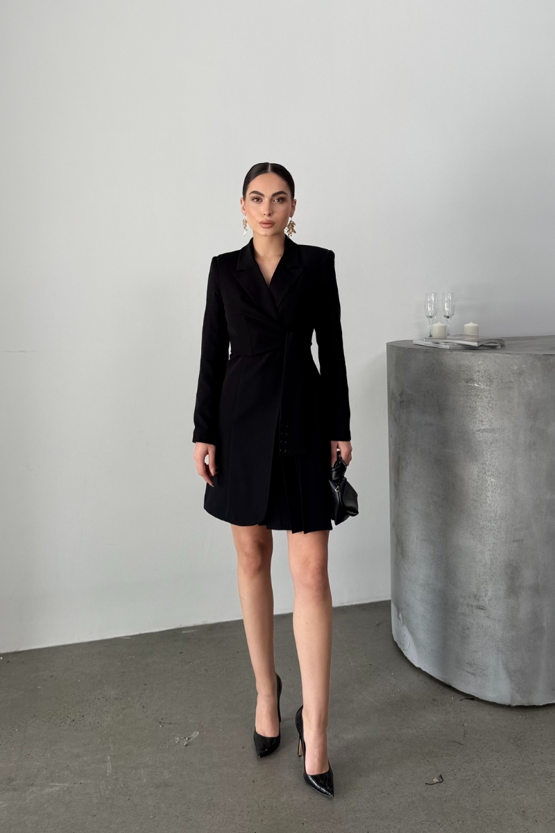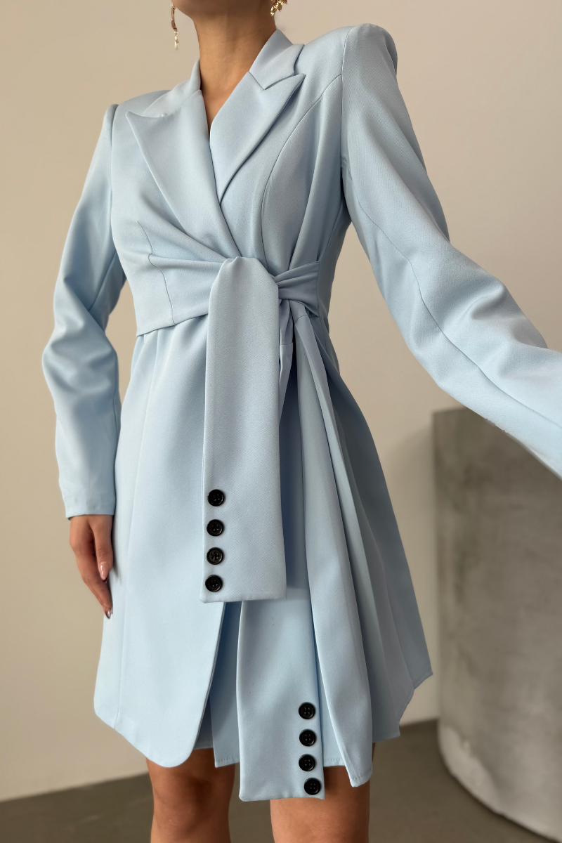 Kadın Elbise Mini Şık Uzun Kollu Kuşaklı Kruvaze Yaka Pileli Ceket Elbise