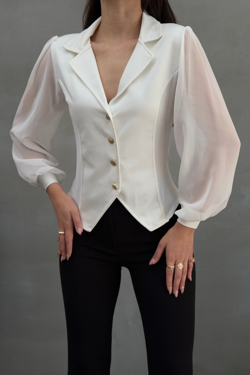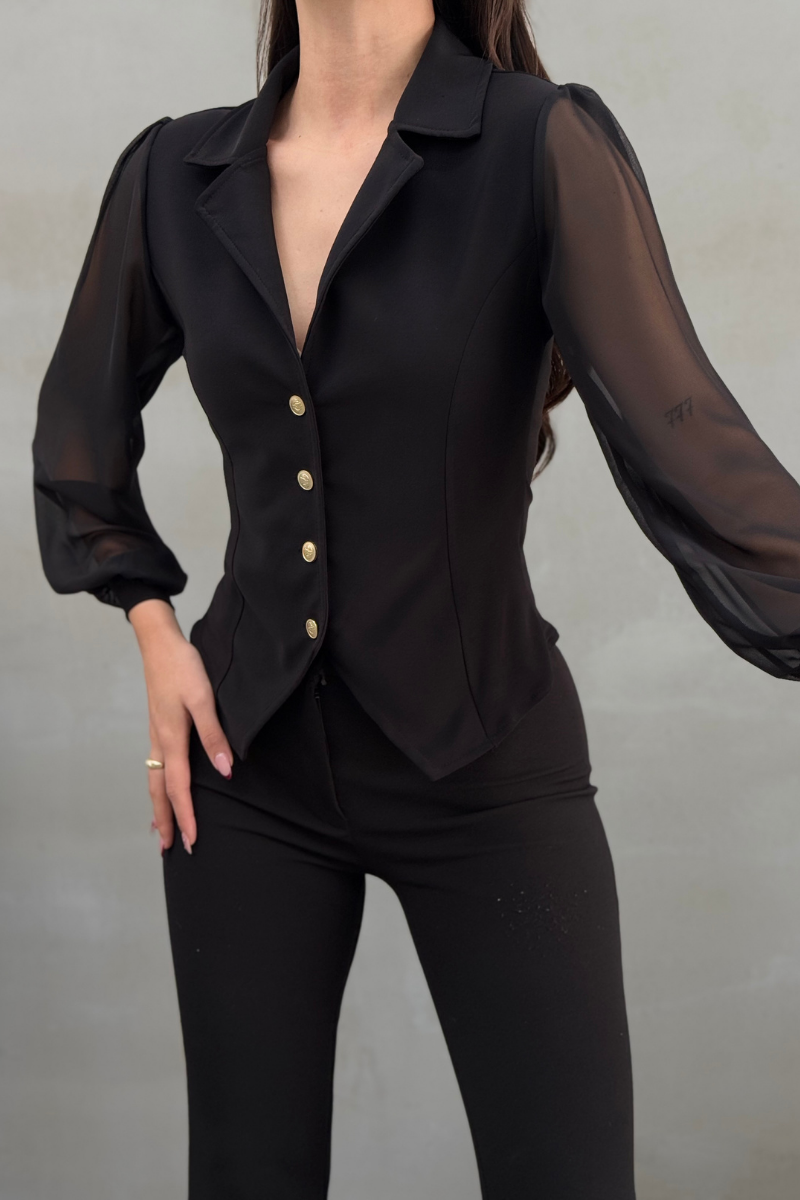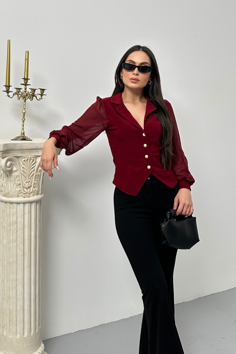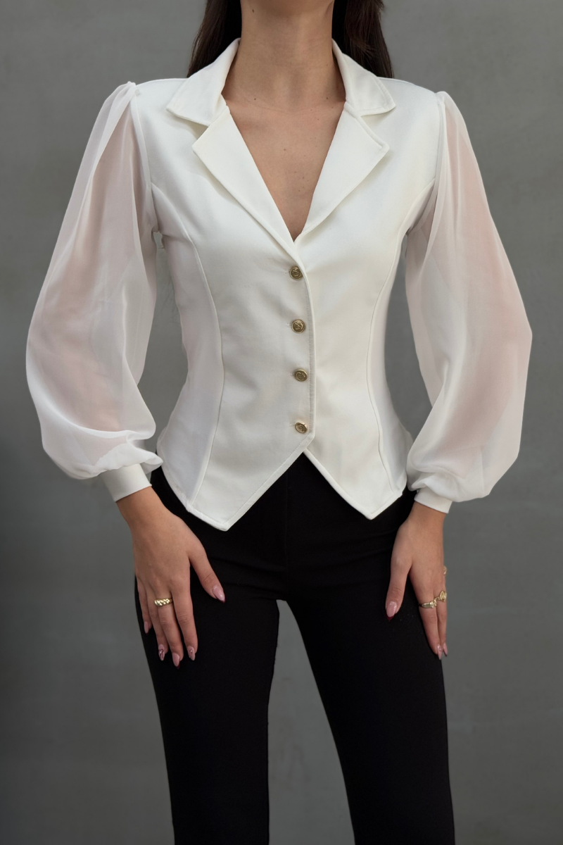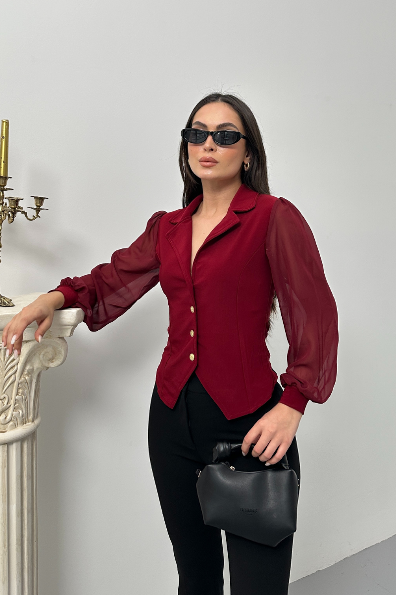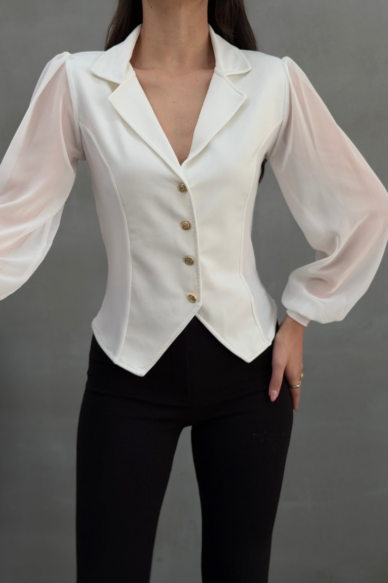 Kadın Gömlek Düğmeli Uzun Tül Kollu Ceket Yaka Bele Oturan Gömlek