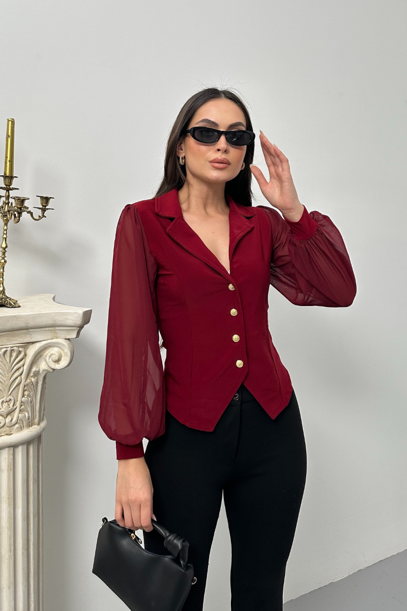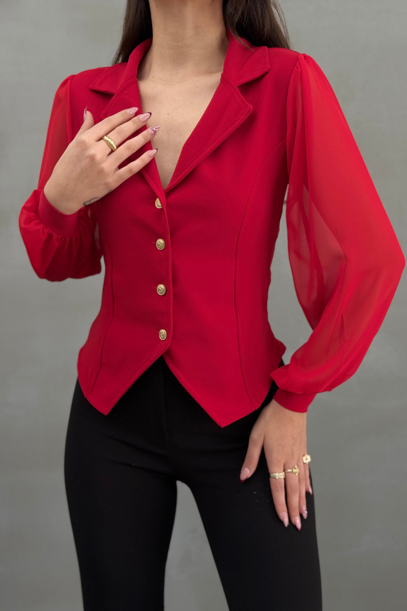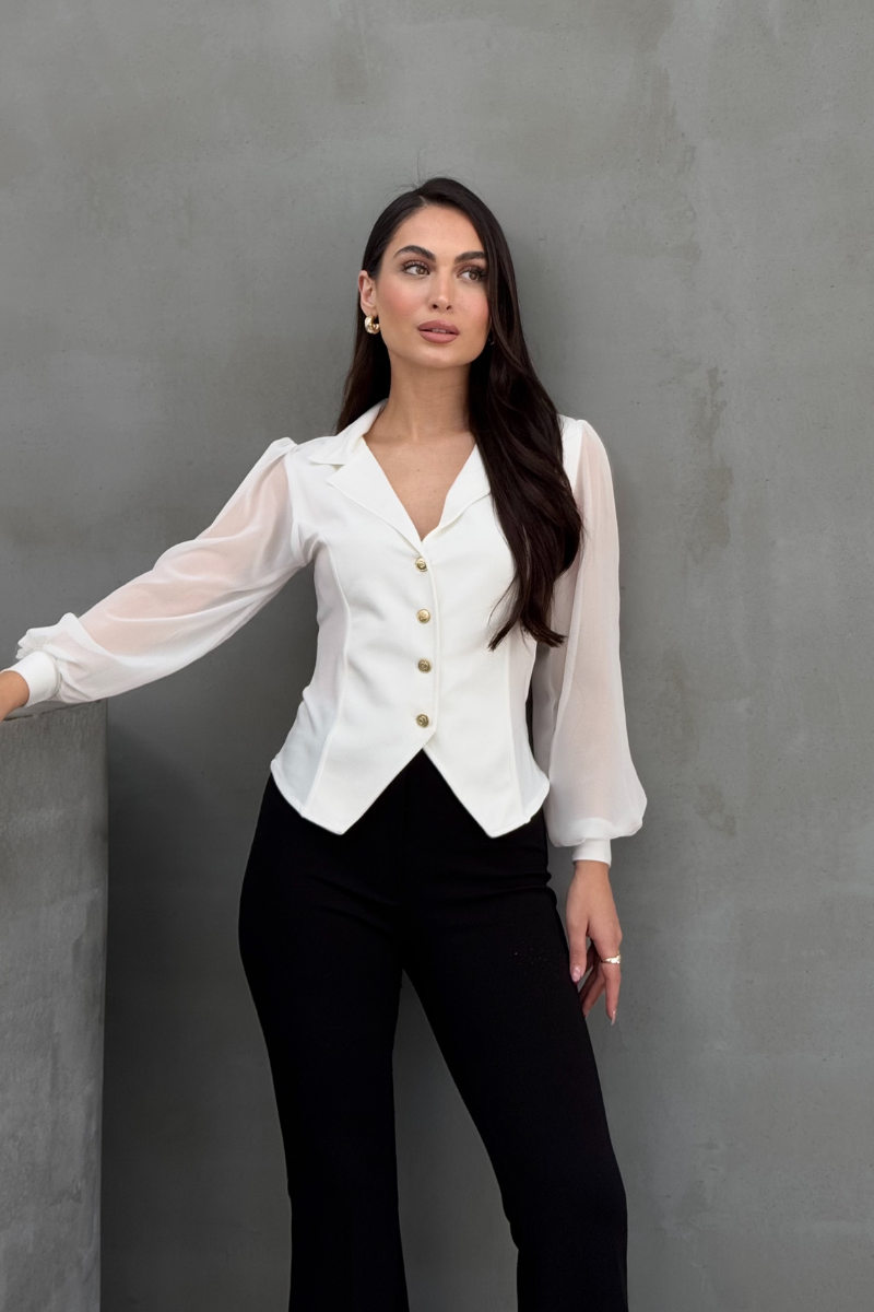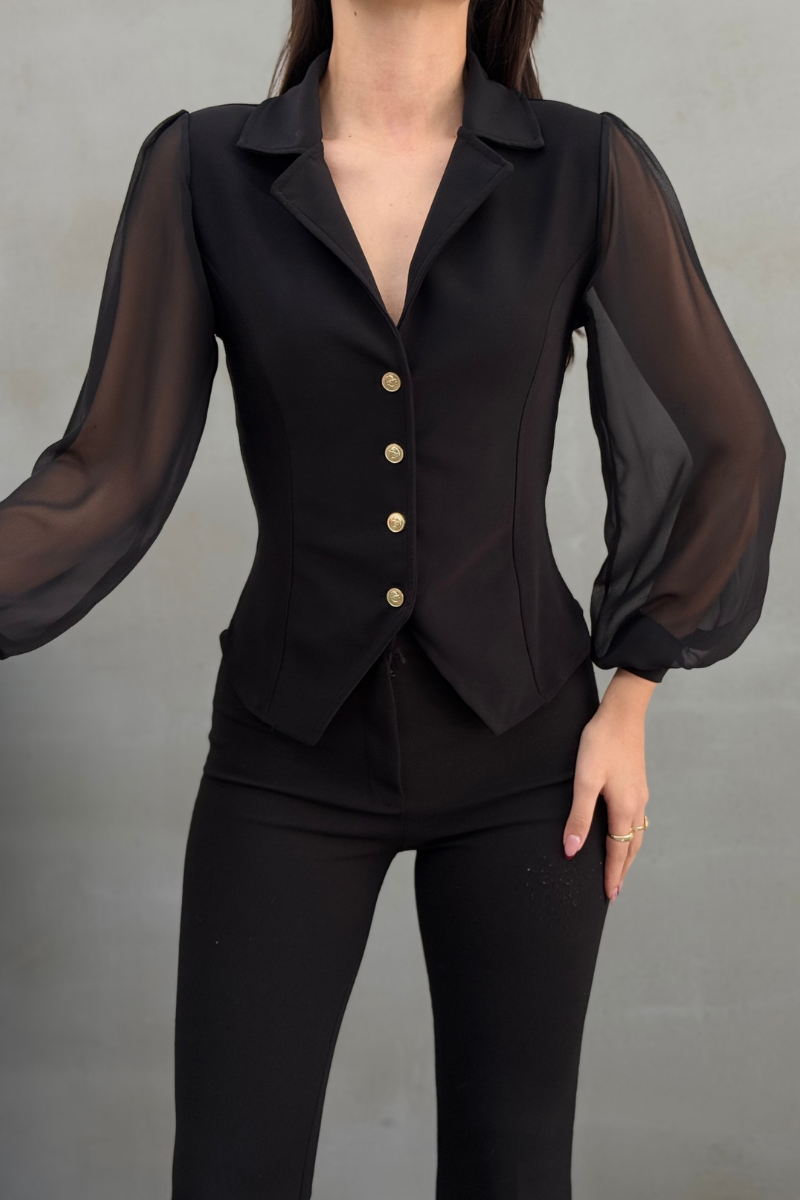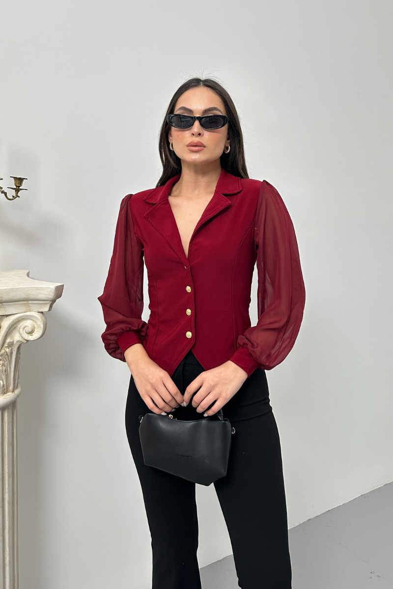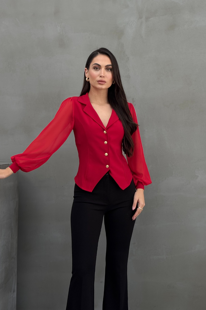 Kadın Gömlek Düğmeli Uzun Tül Kollu Ceket Yaka Bele Oturan Gömlek