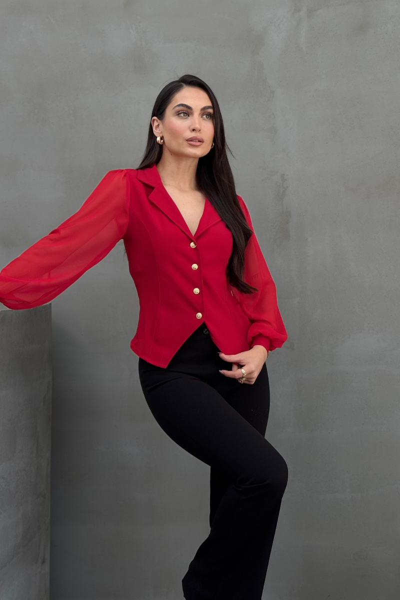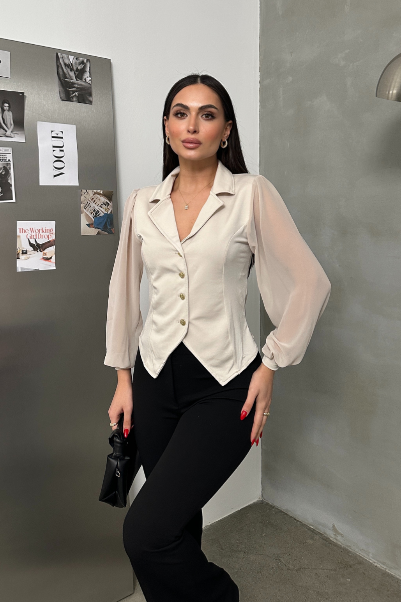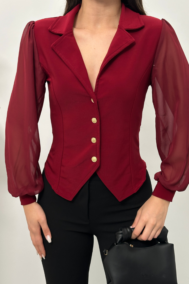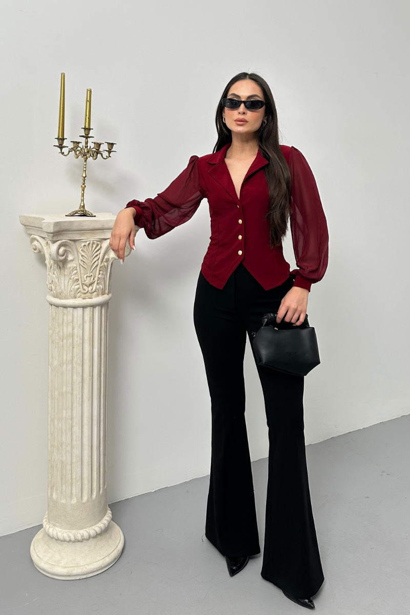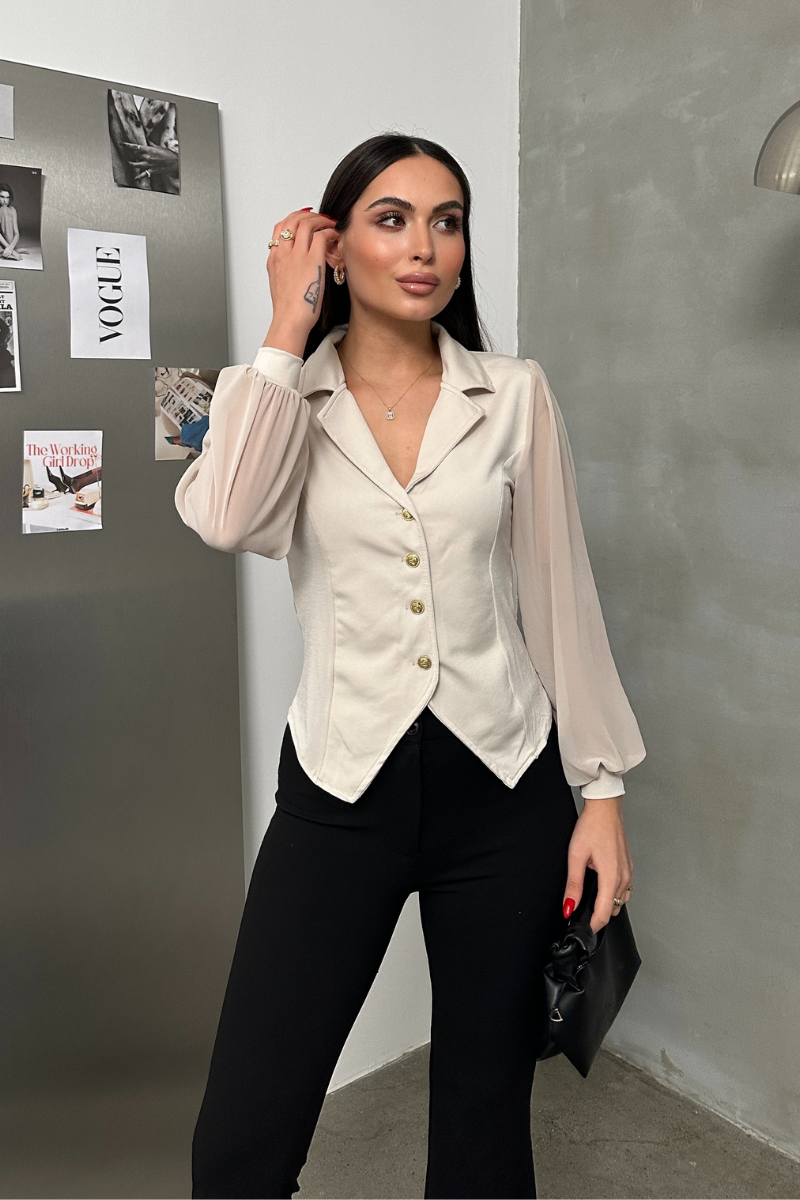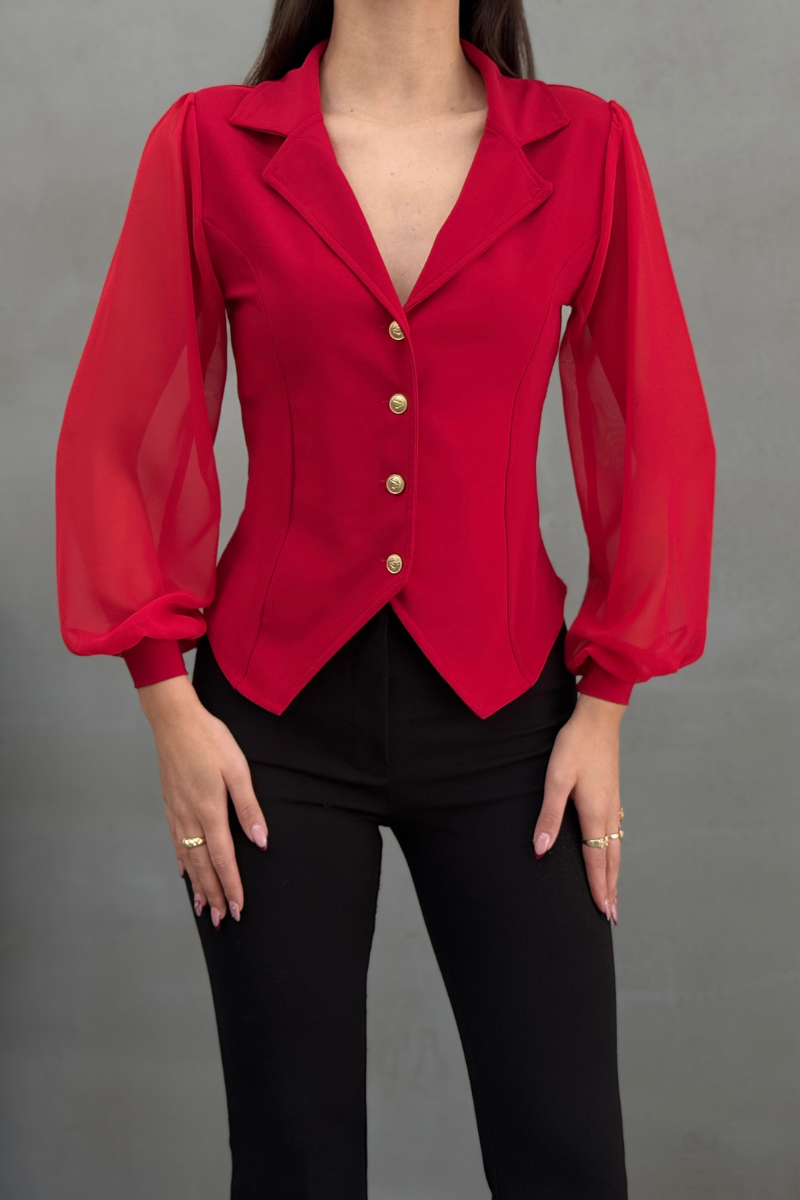 Kadın Gömlek Düğmeli Uzun Tül Kollu Ceket Yaka Bele Oturan Gömlek