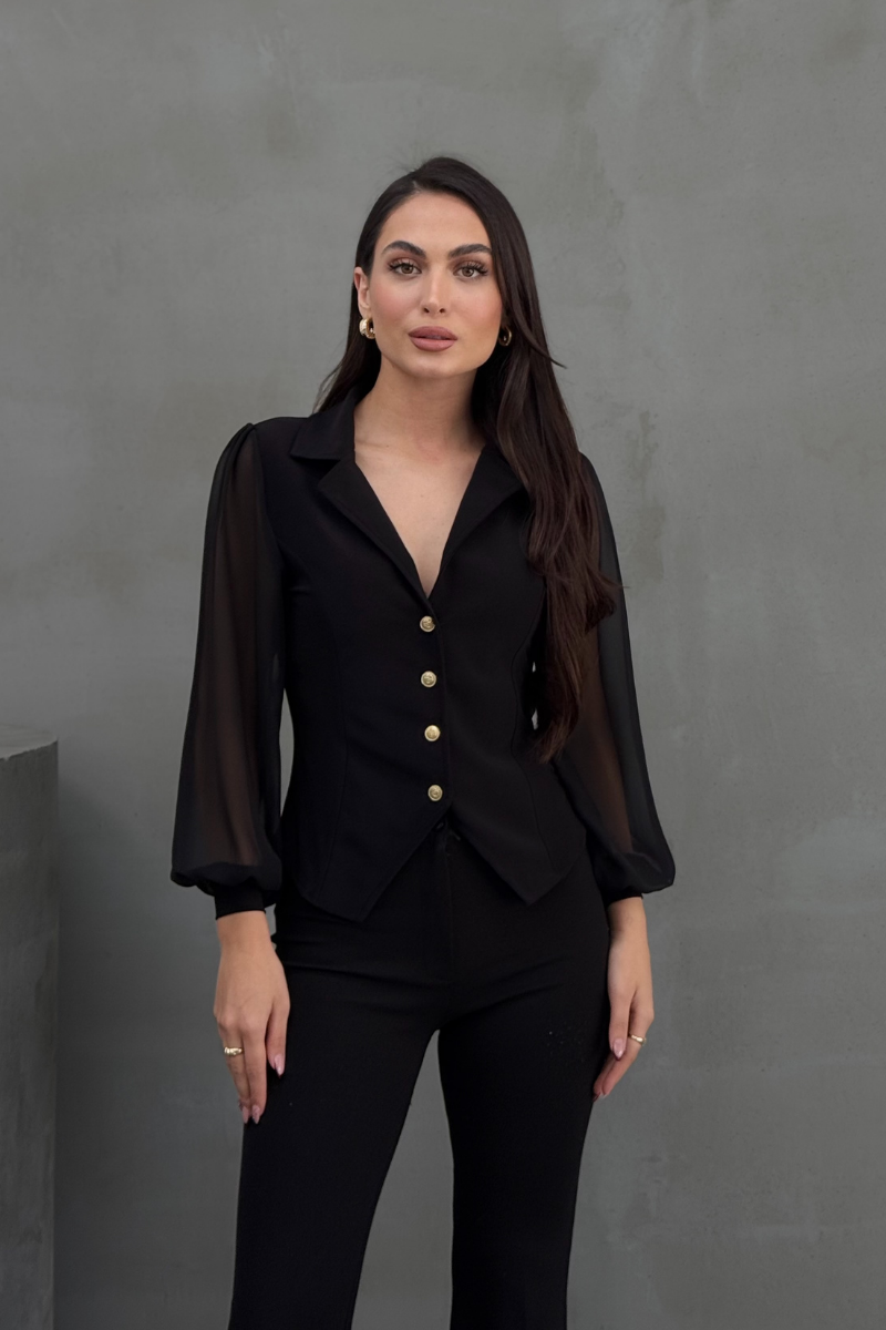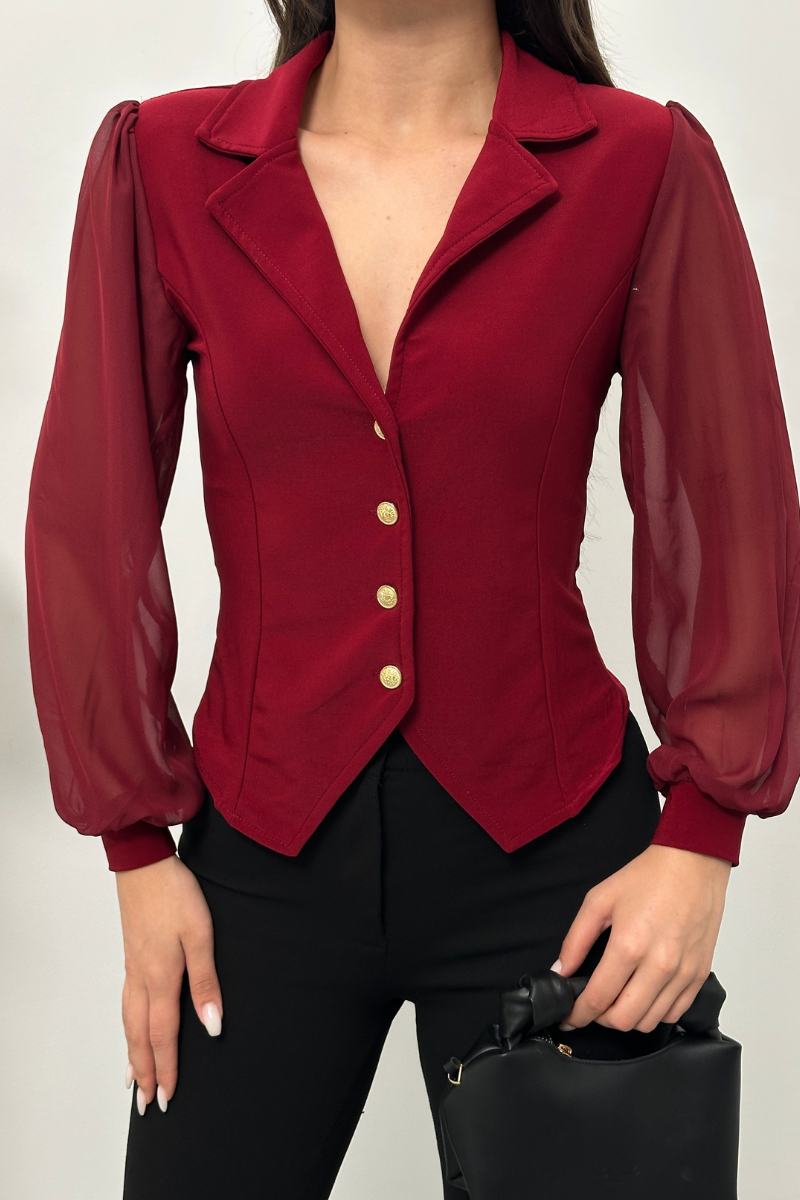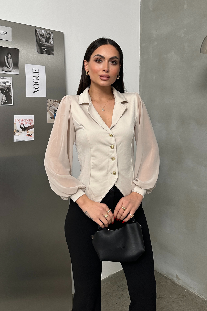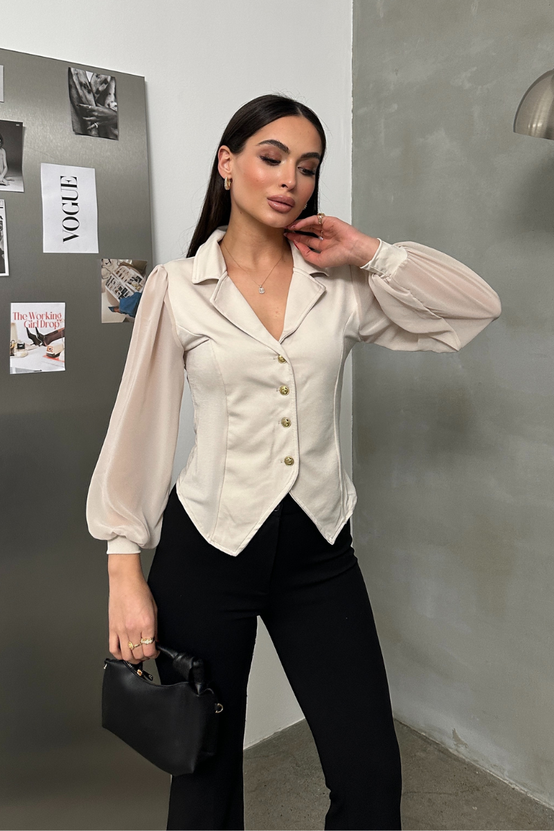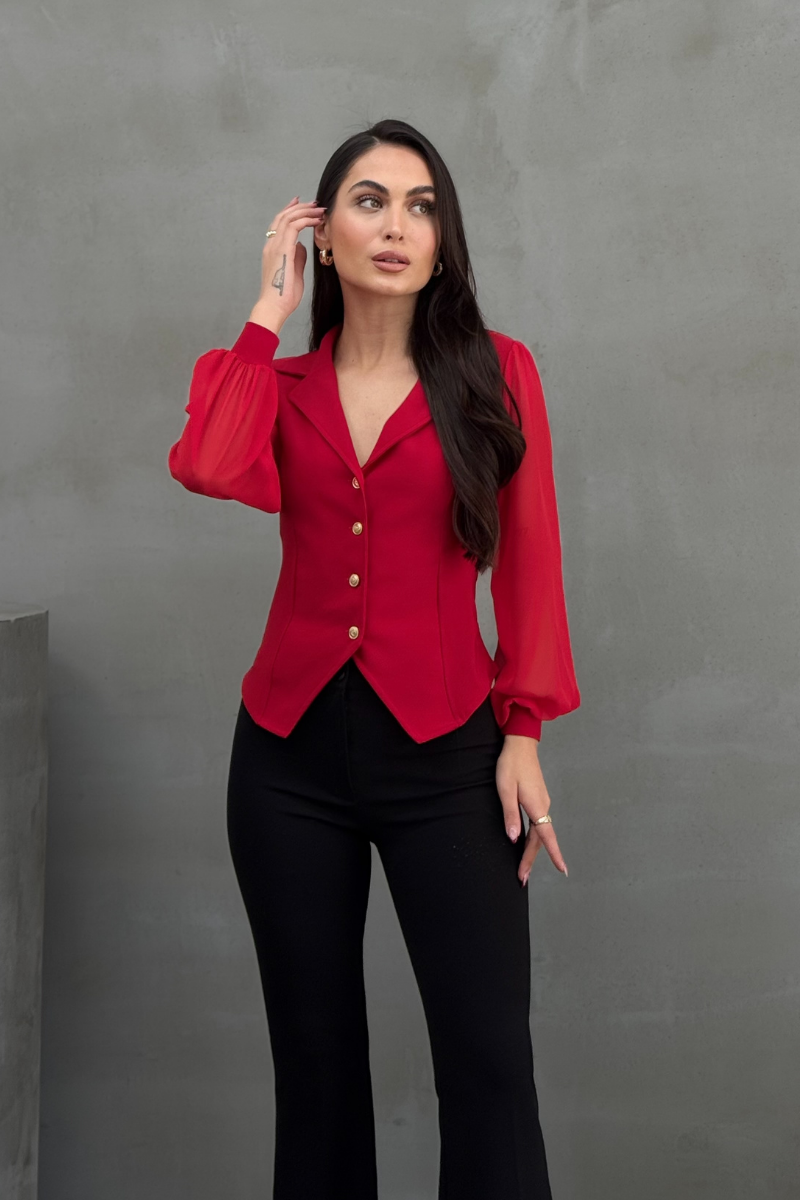 Kadın Gömlek Düğmeli Uzun Tül Kollu Ceket Yaka Bele Oturan Gömlek