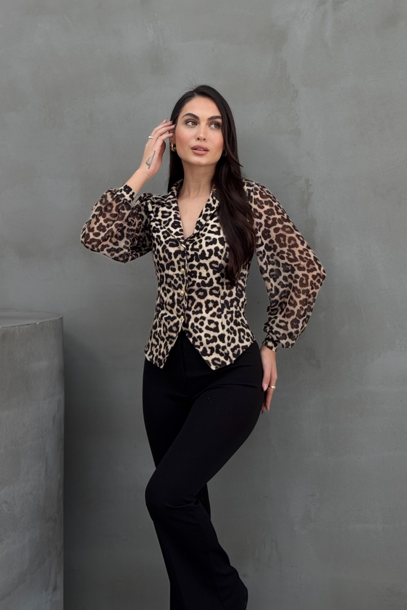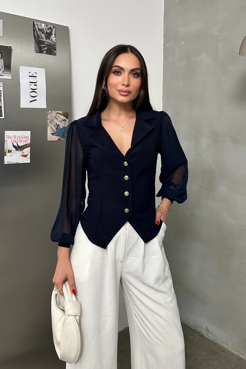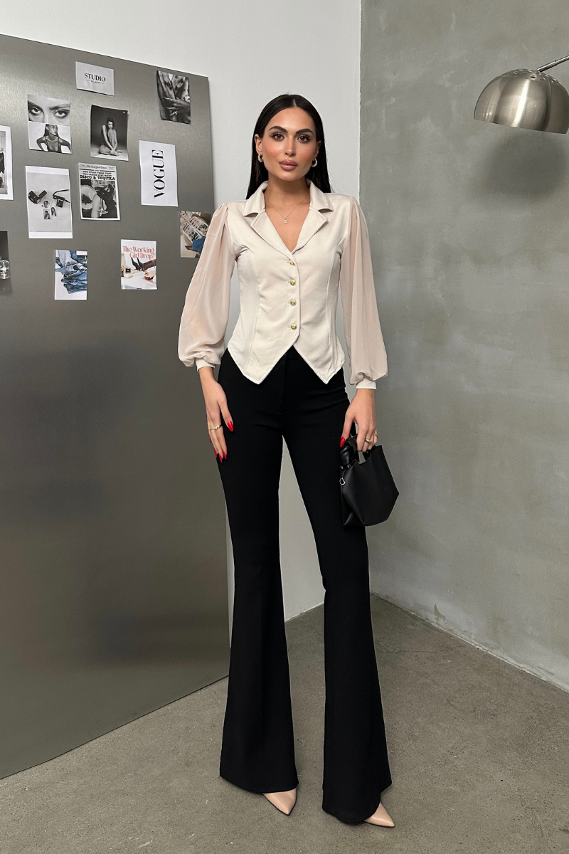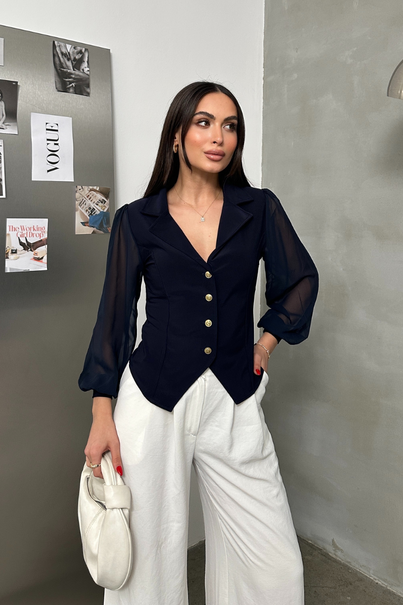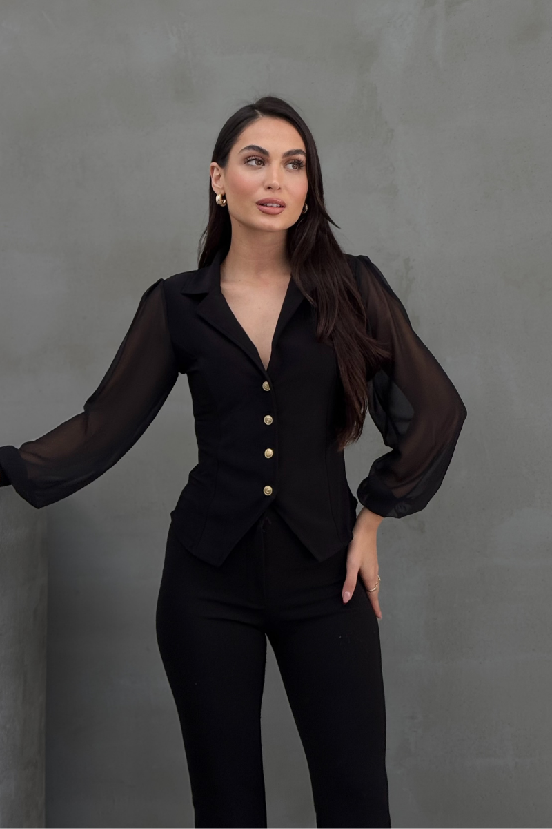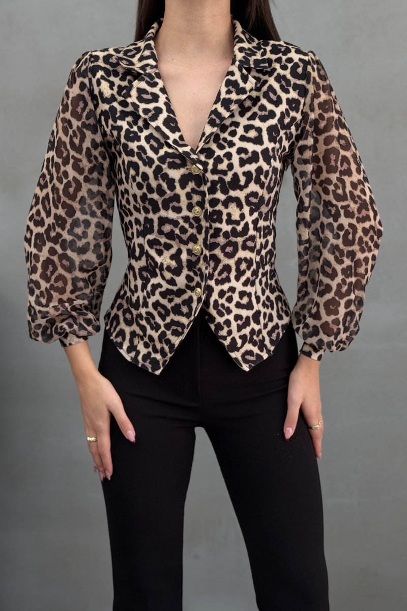 Kadın Gömlek Düğmeli Uzun Tül Kollu Ceket Yaka Bele Oturan Gömlek
