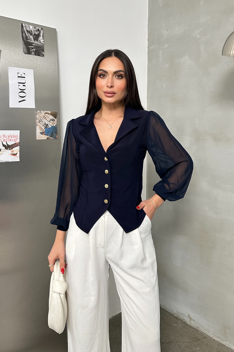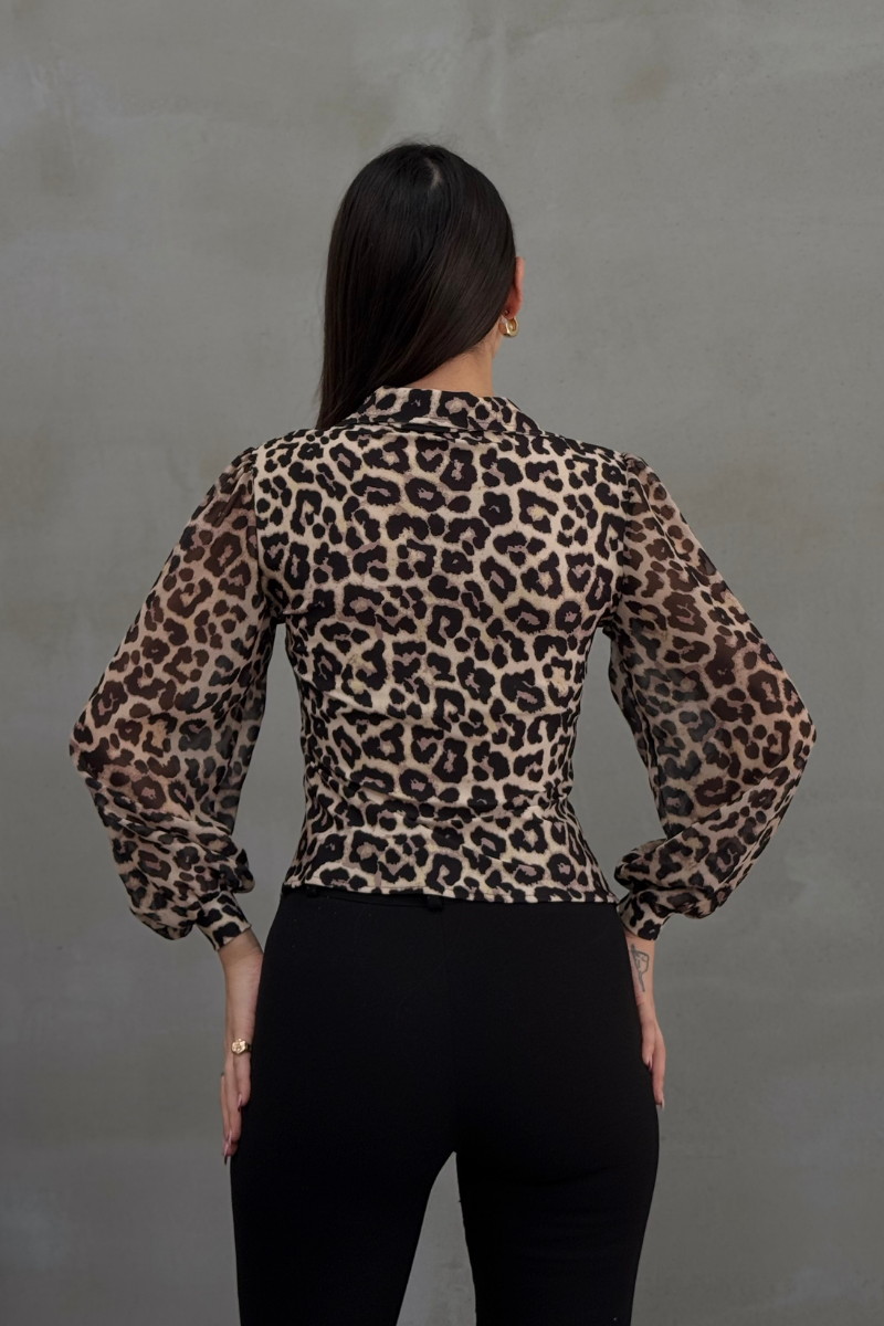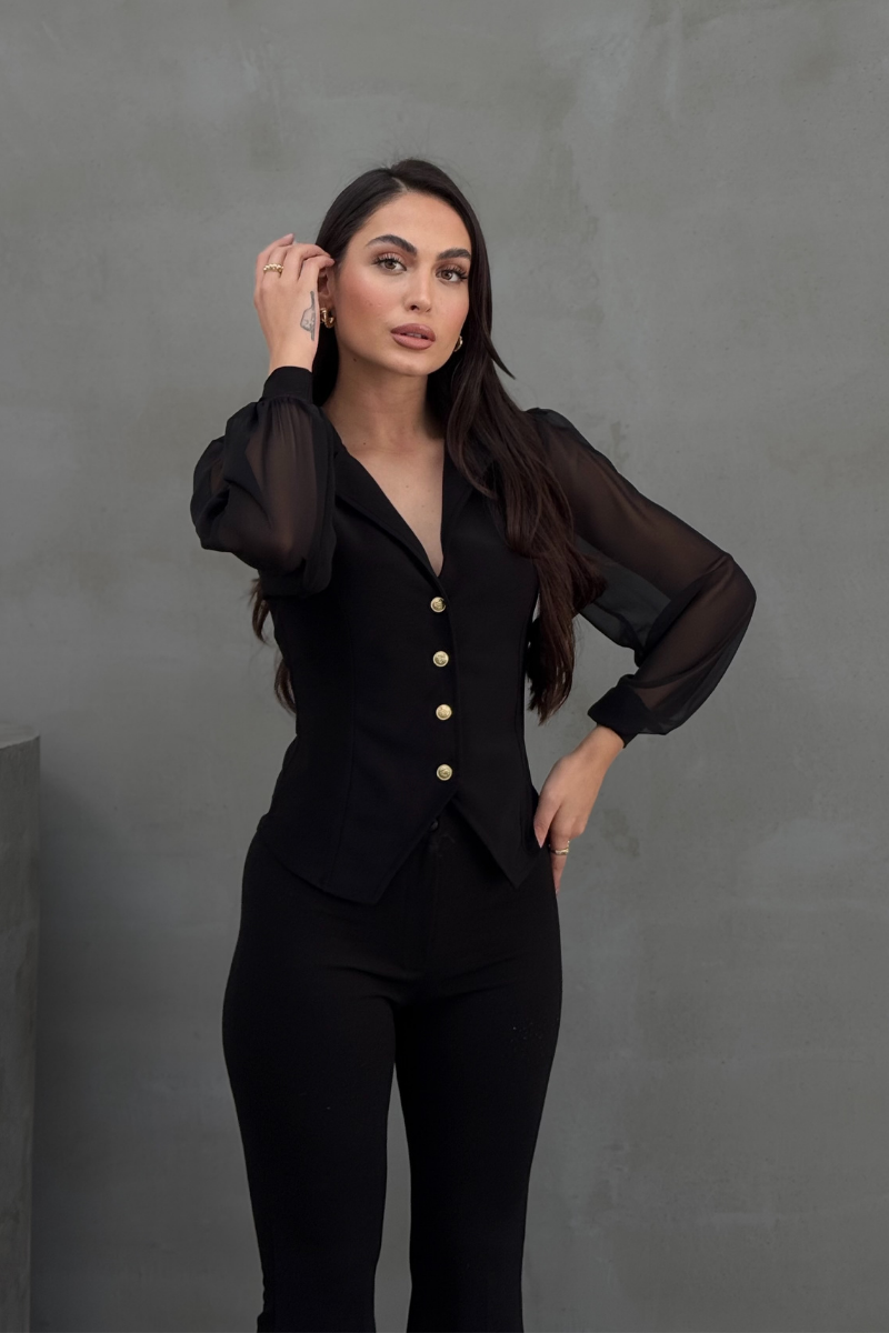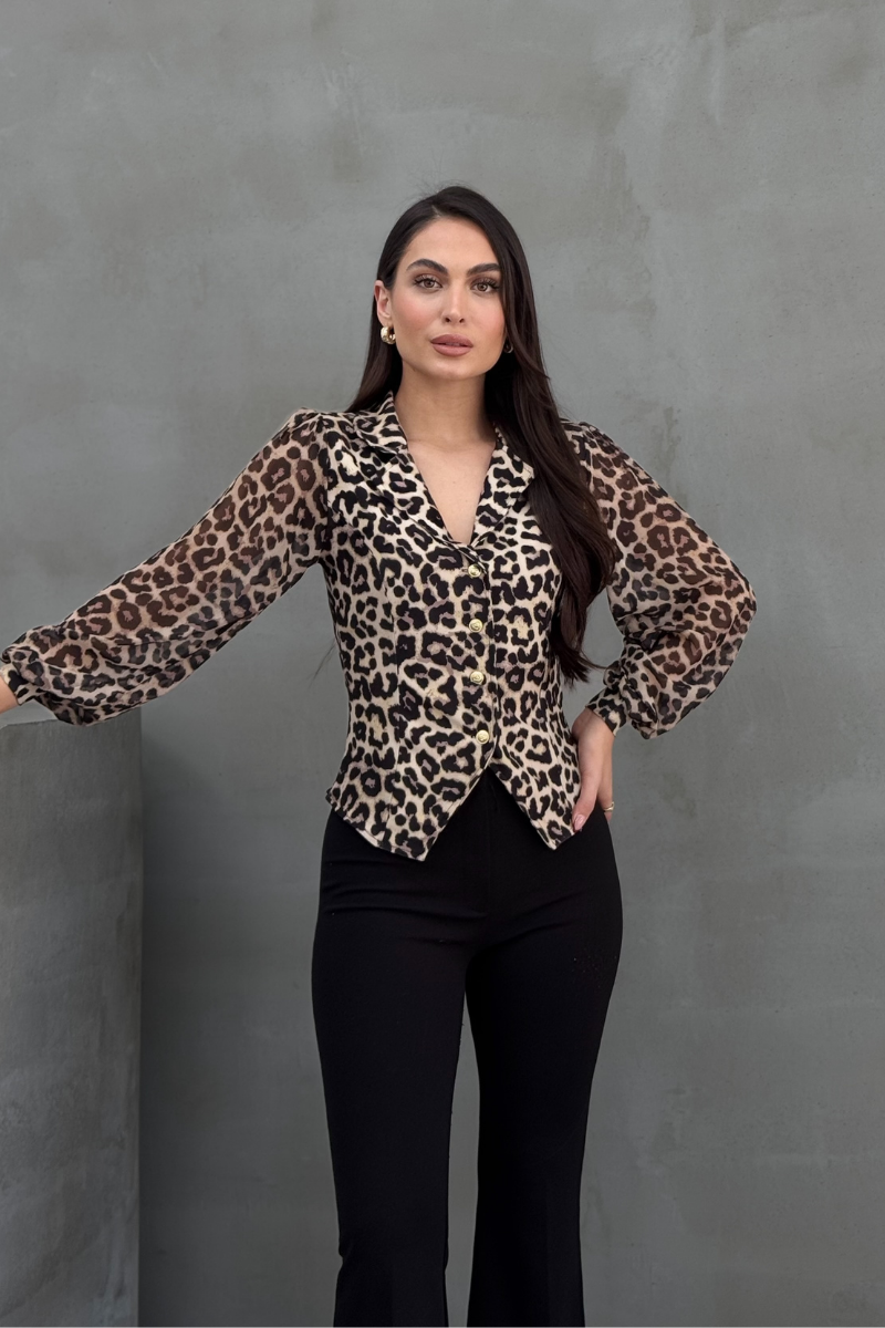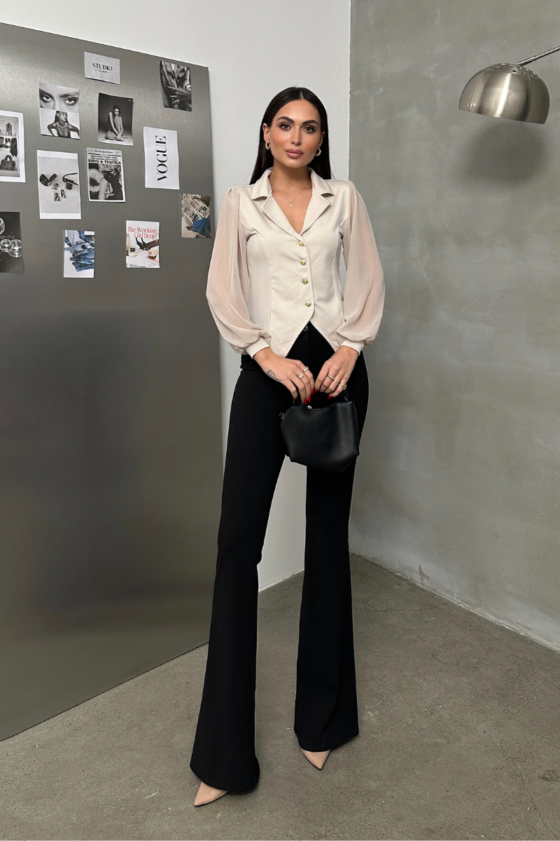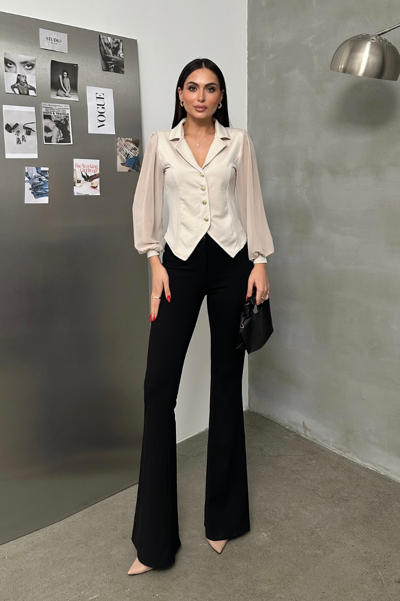 Kadın Gömlek Düğmeli Uzun Tül Kollu Ceket Yaka Bele Oturan Gömlek