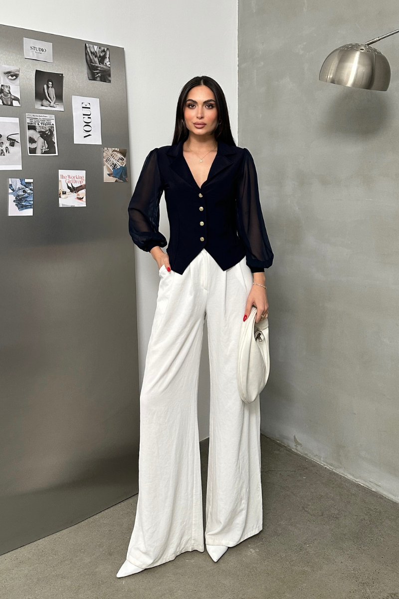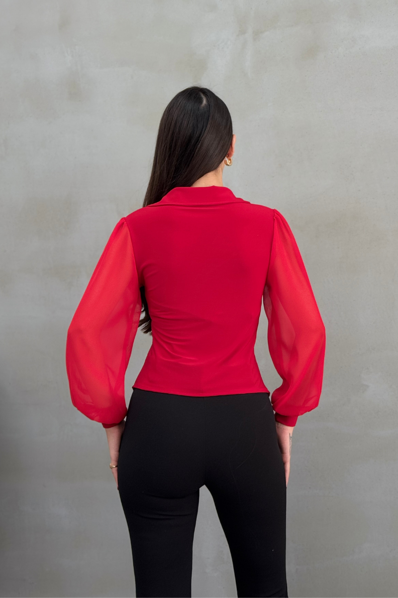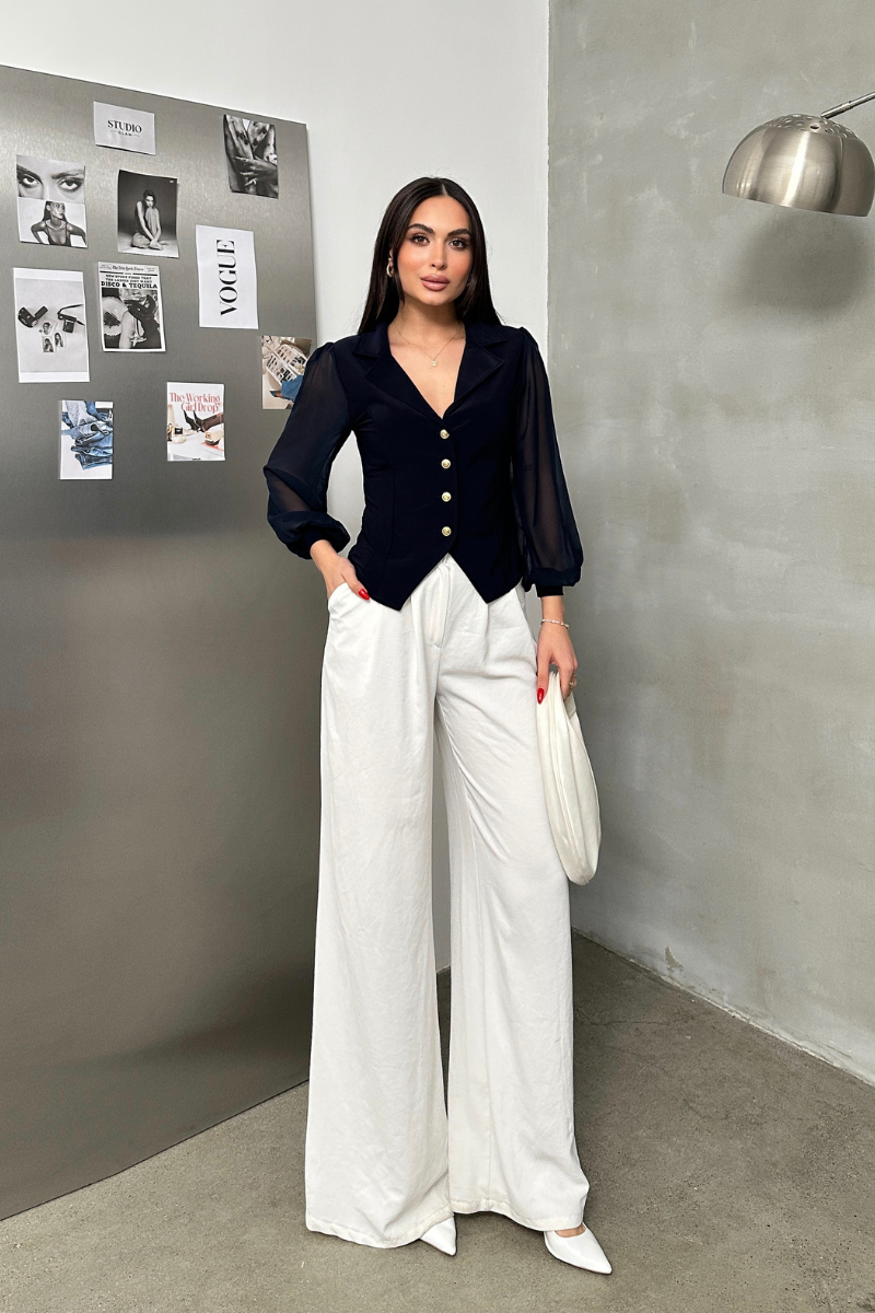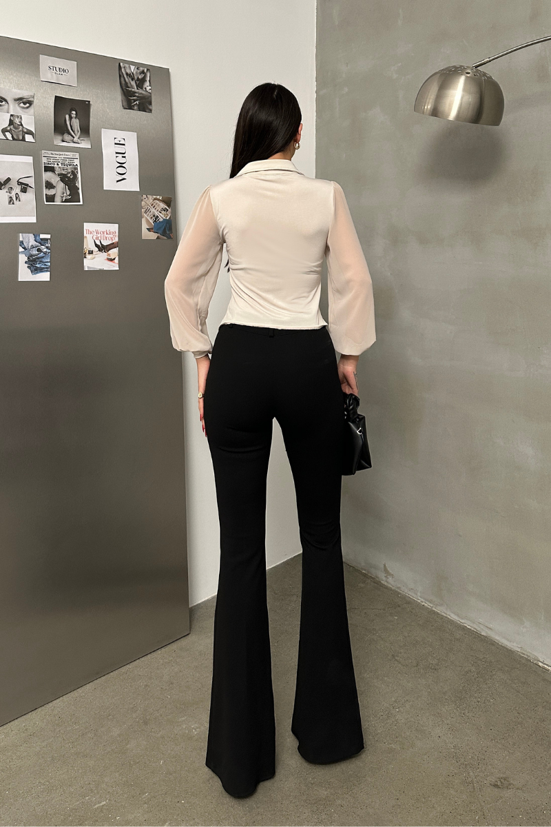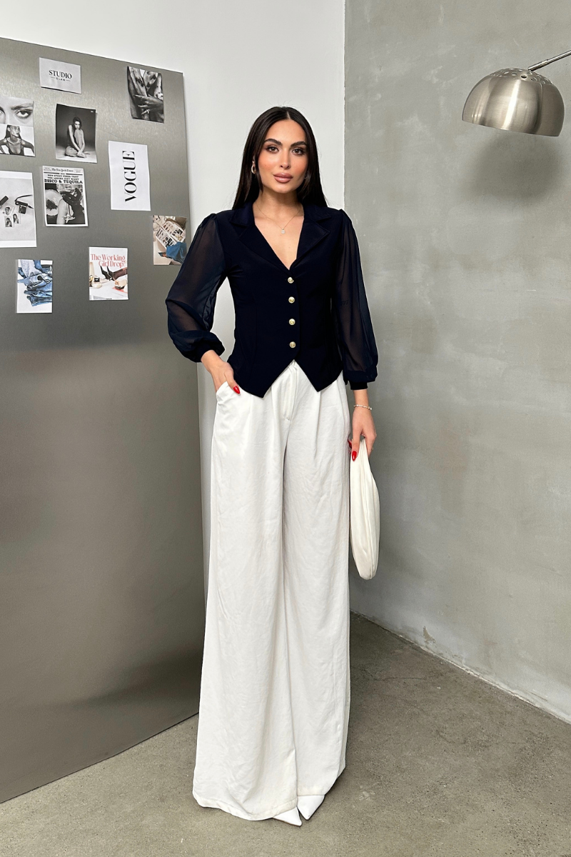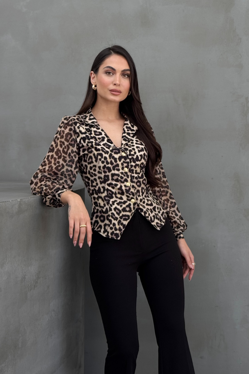 Kadın Gömlek Düğmeli Uzun Tül Kollu Ceket Yaka Bele Oturan Gömlek