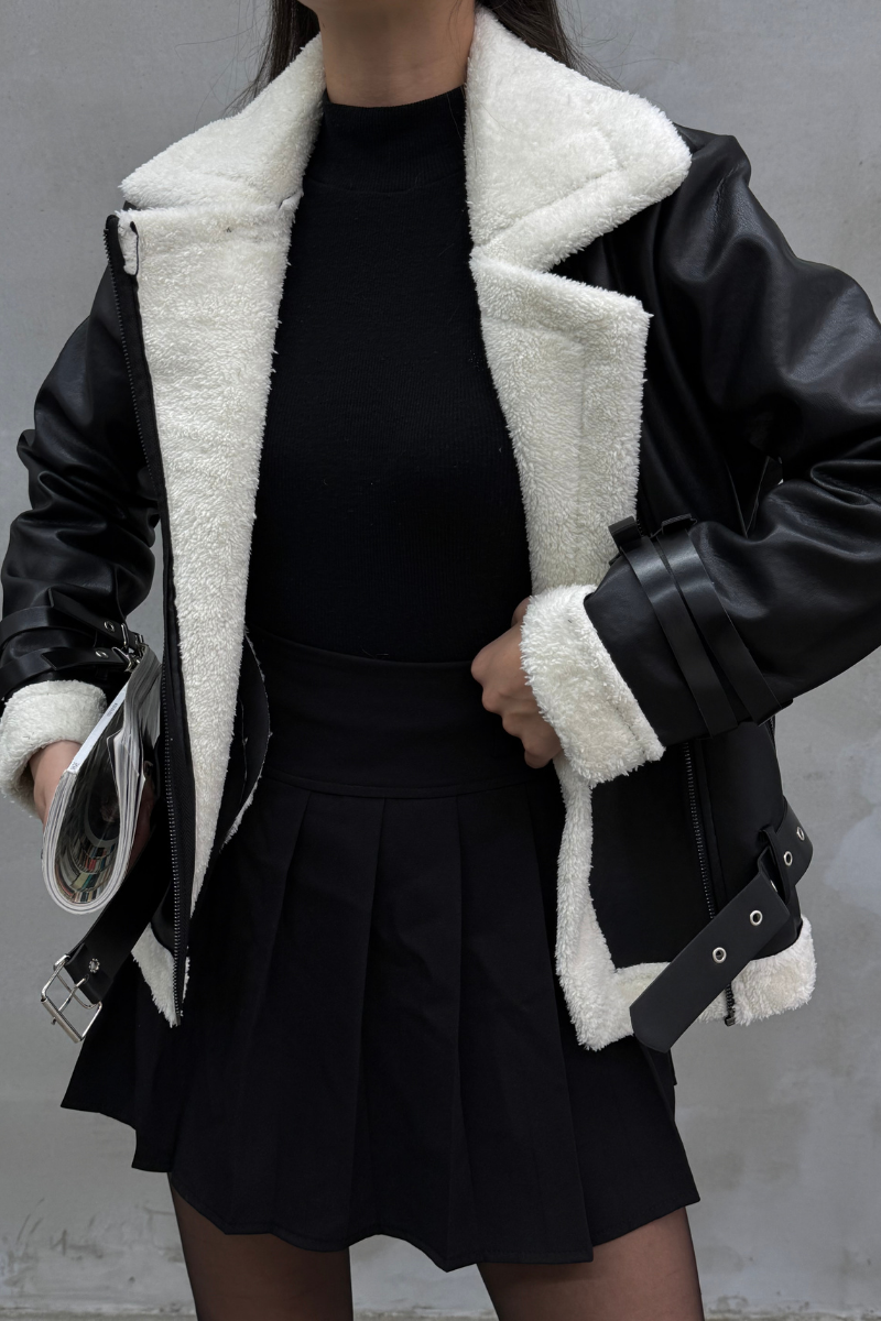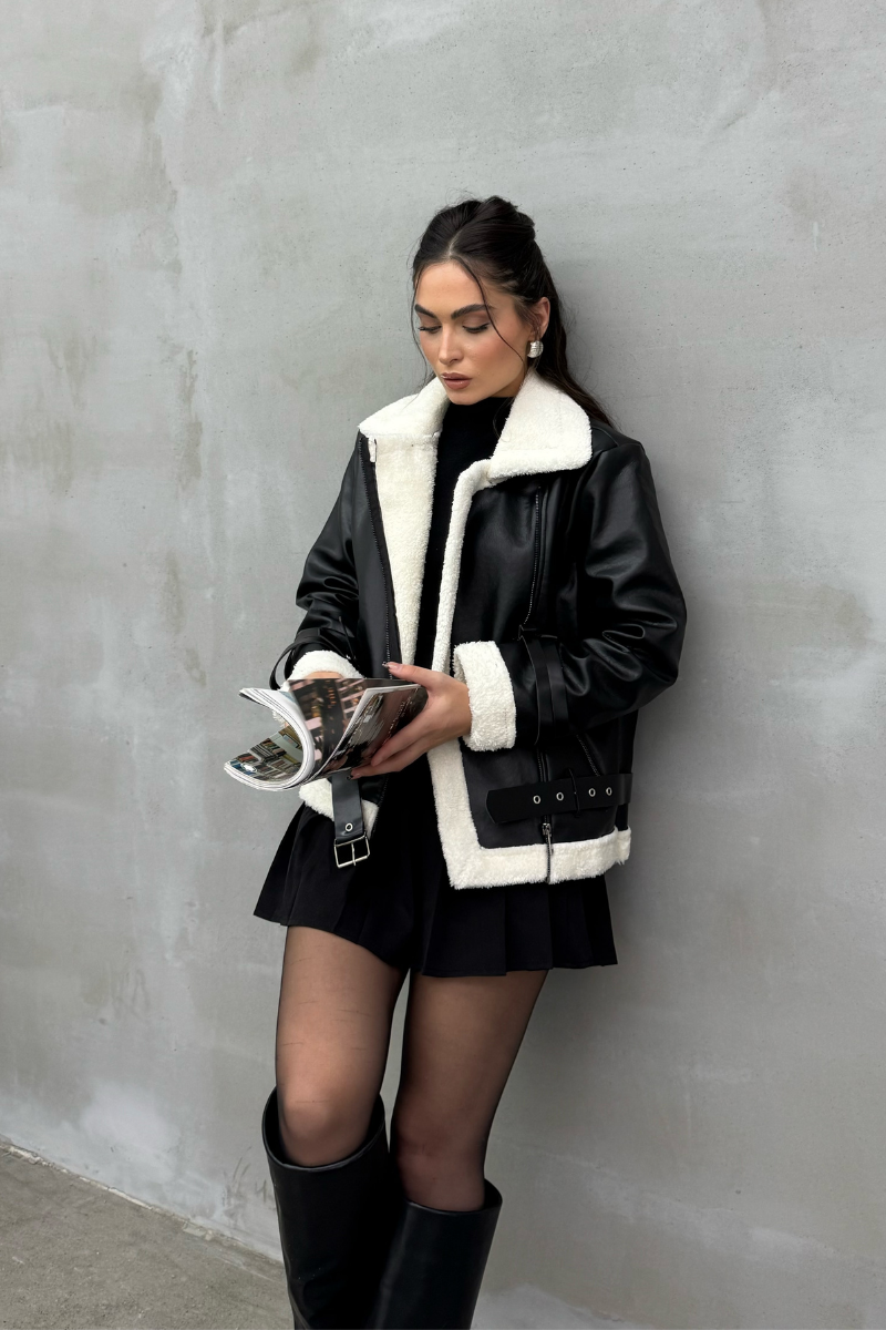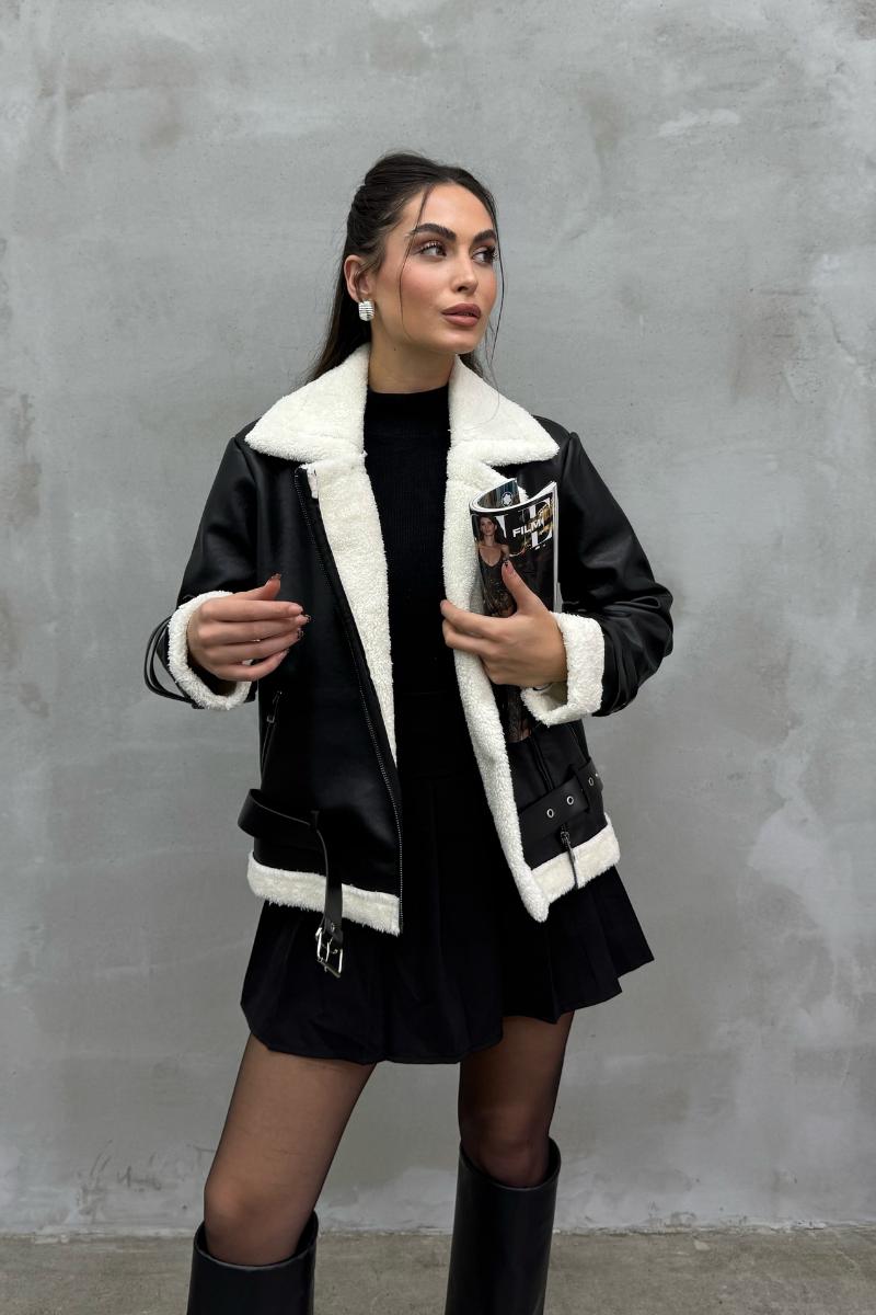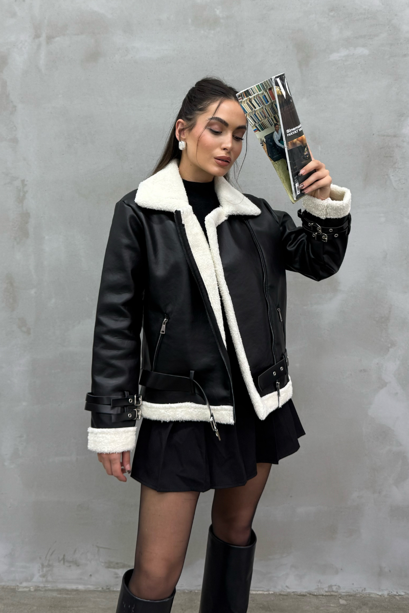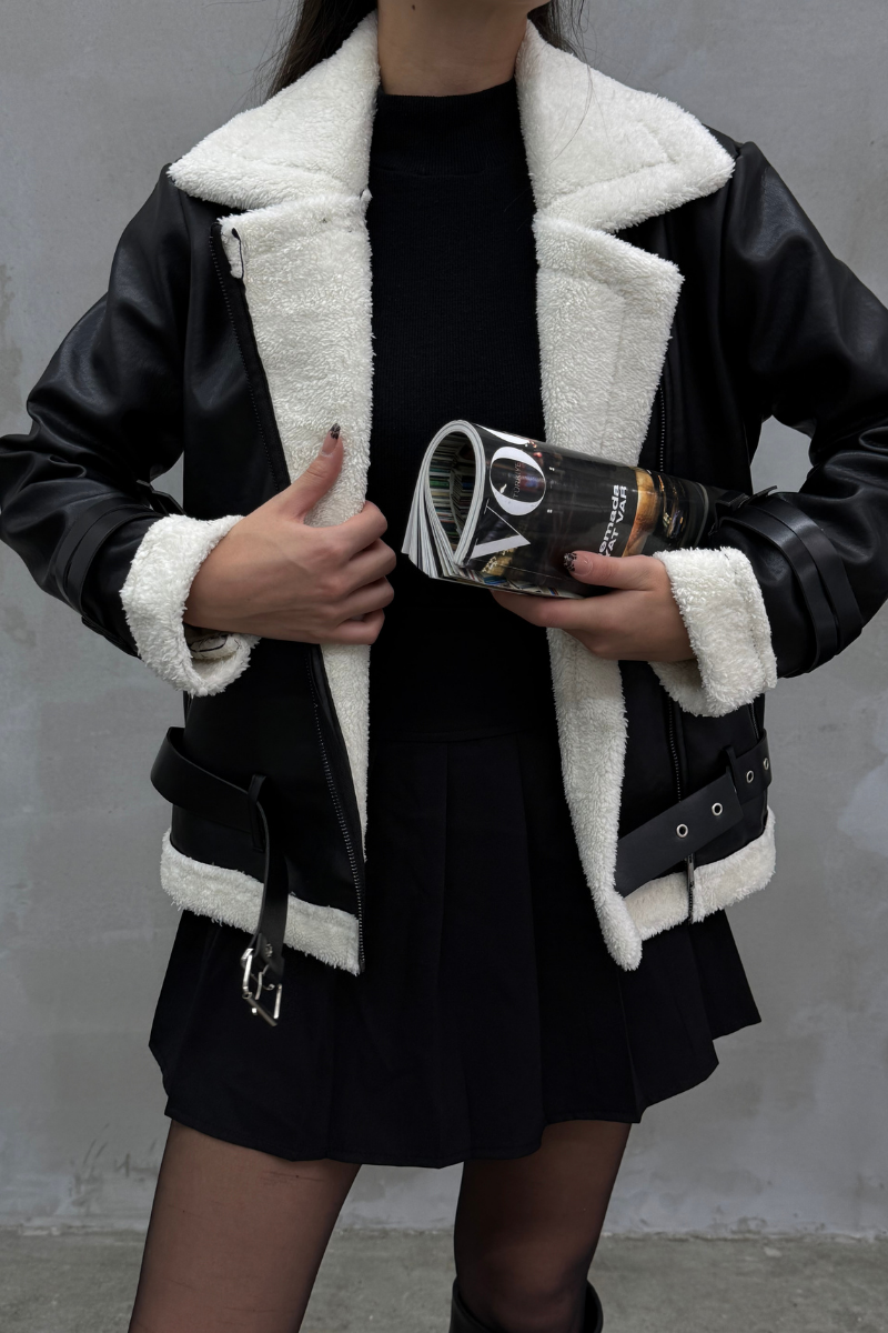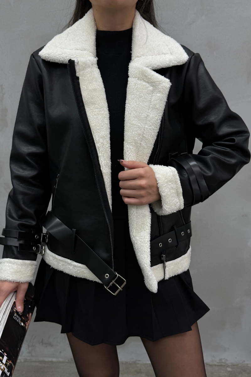 Kadın İçi Beyaz Kürklü Siyah Kısa Biker Deri Ceket Mont