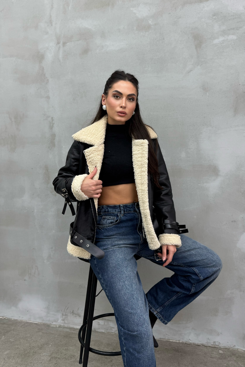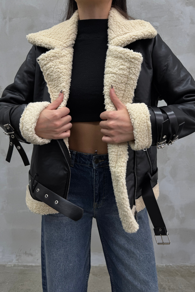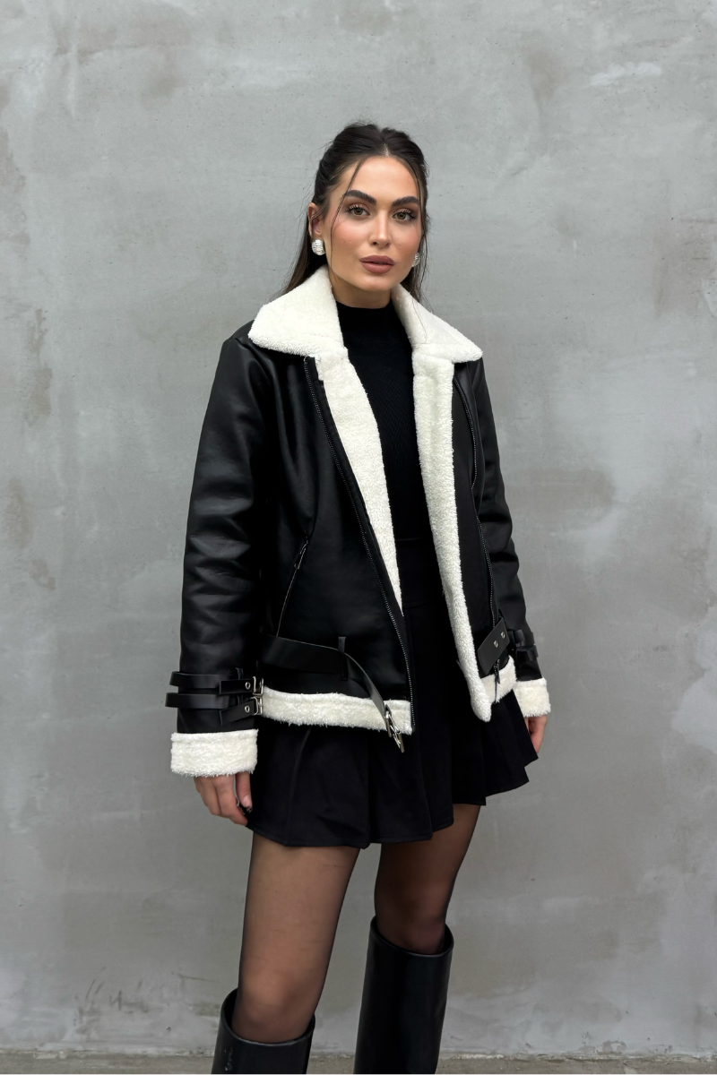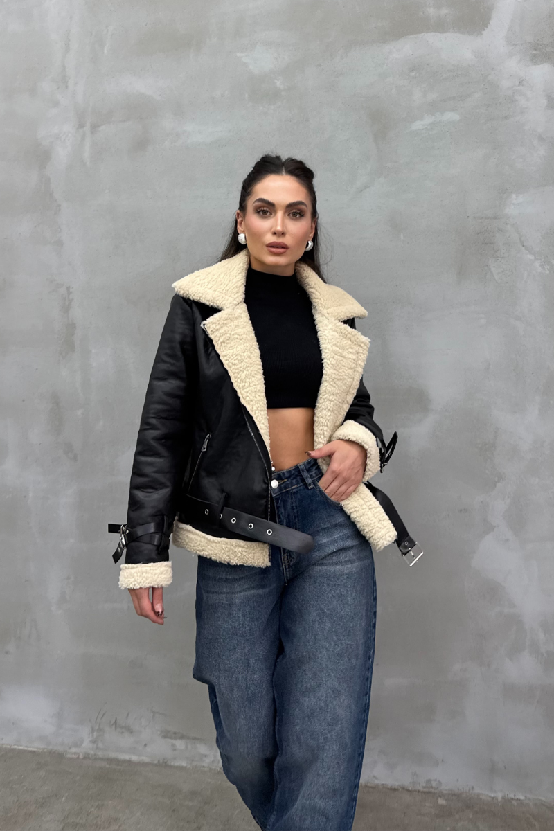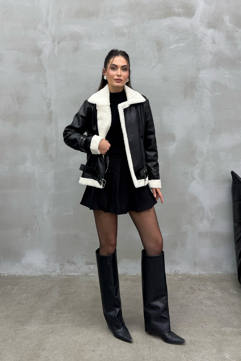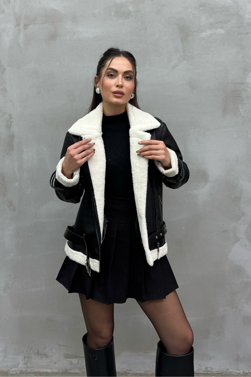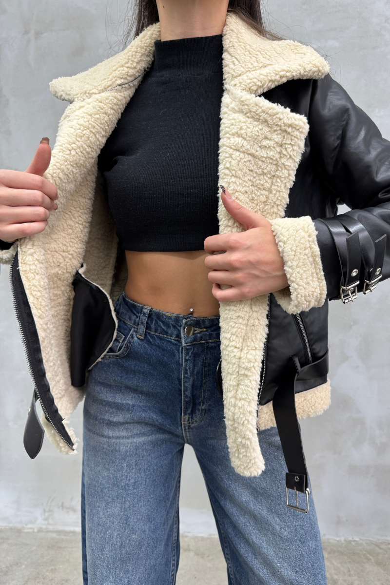 Kadın İçi Beyaz Kürklü Siyah Kısa Biker Deri Ceket Mont
