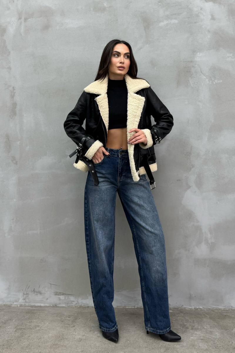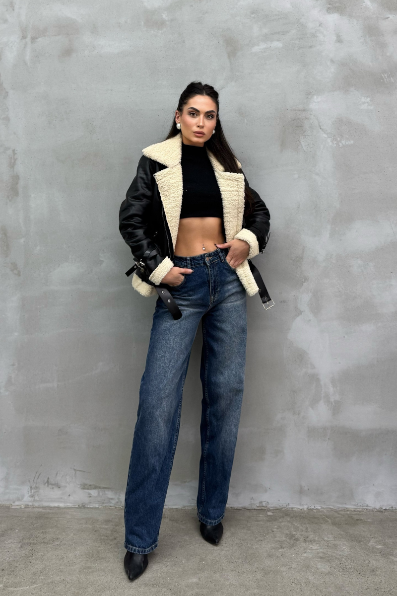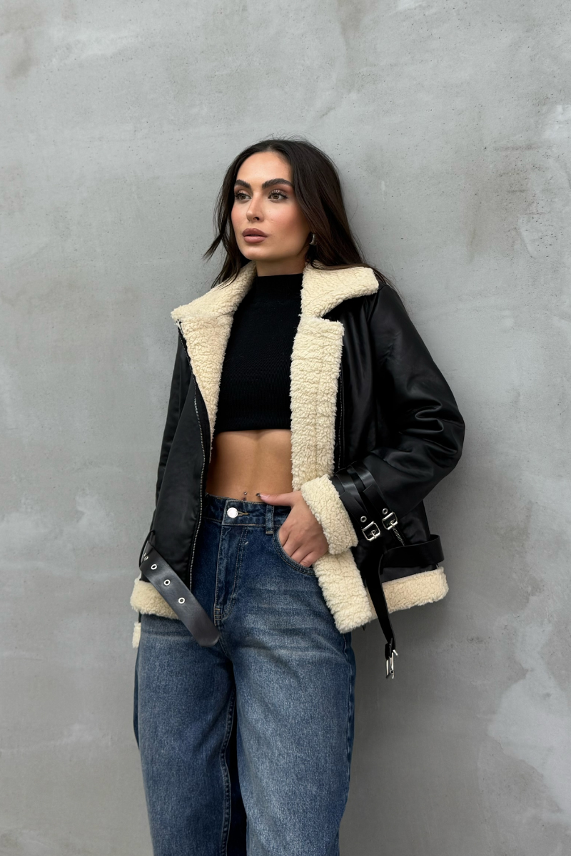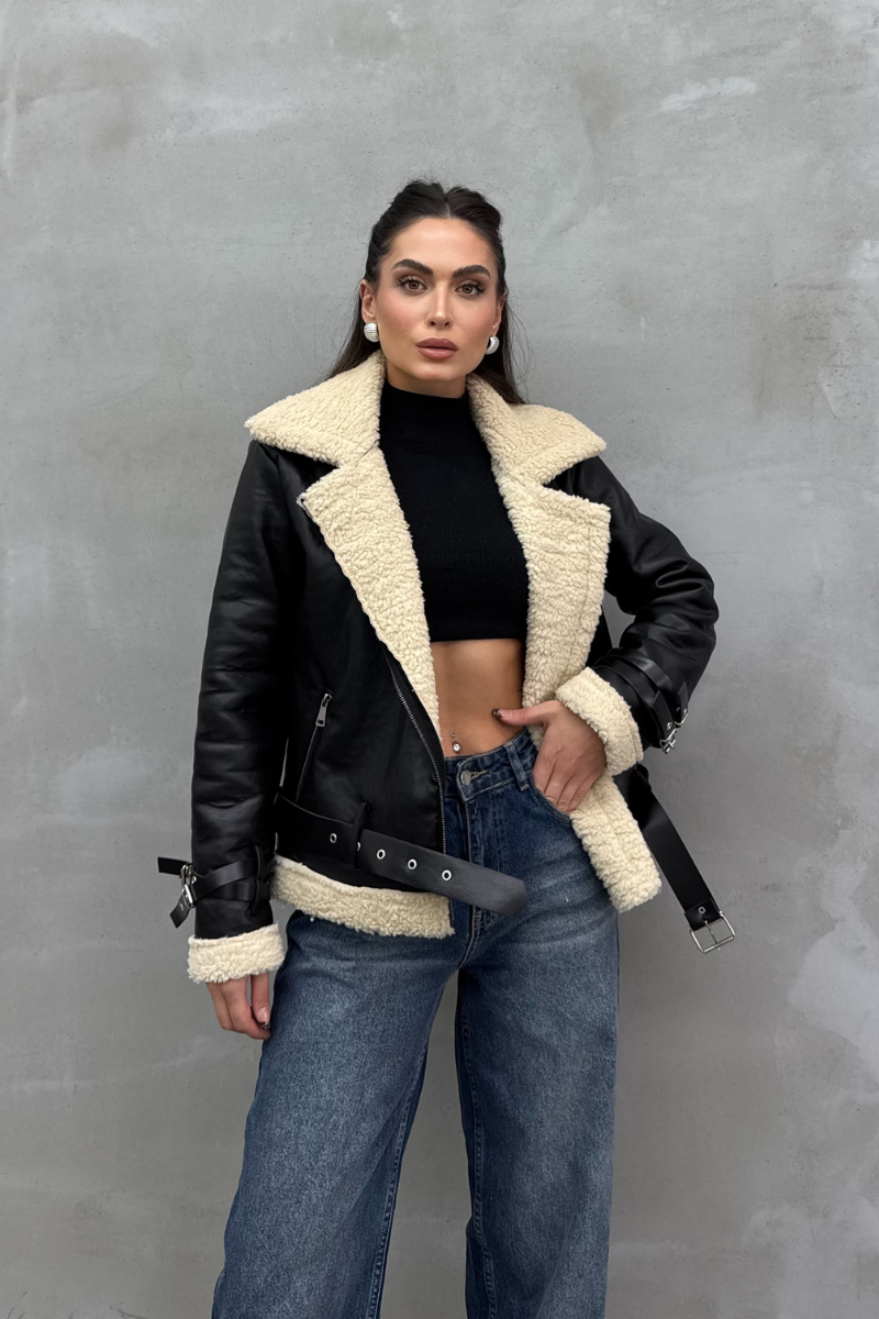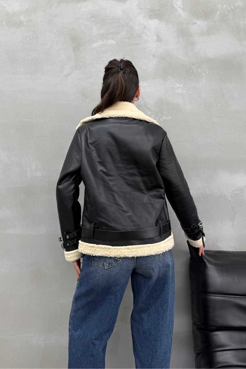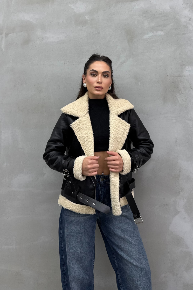 Kadın İçi Beyaz Kürklü Siyah Kısa Biker Deri Ceket Mont