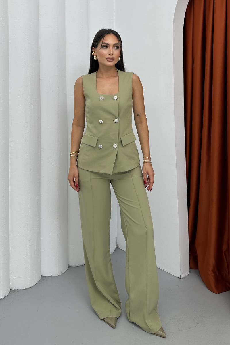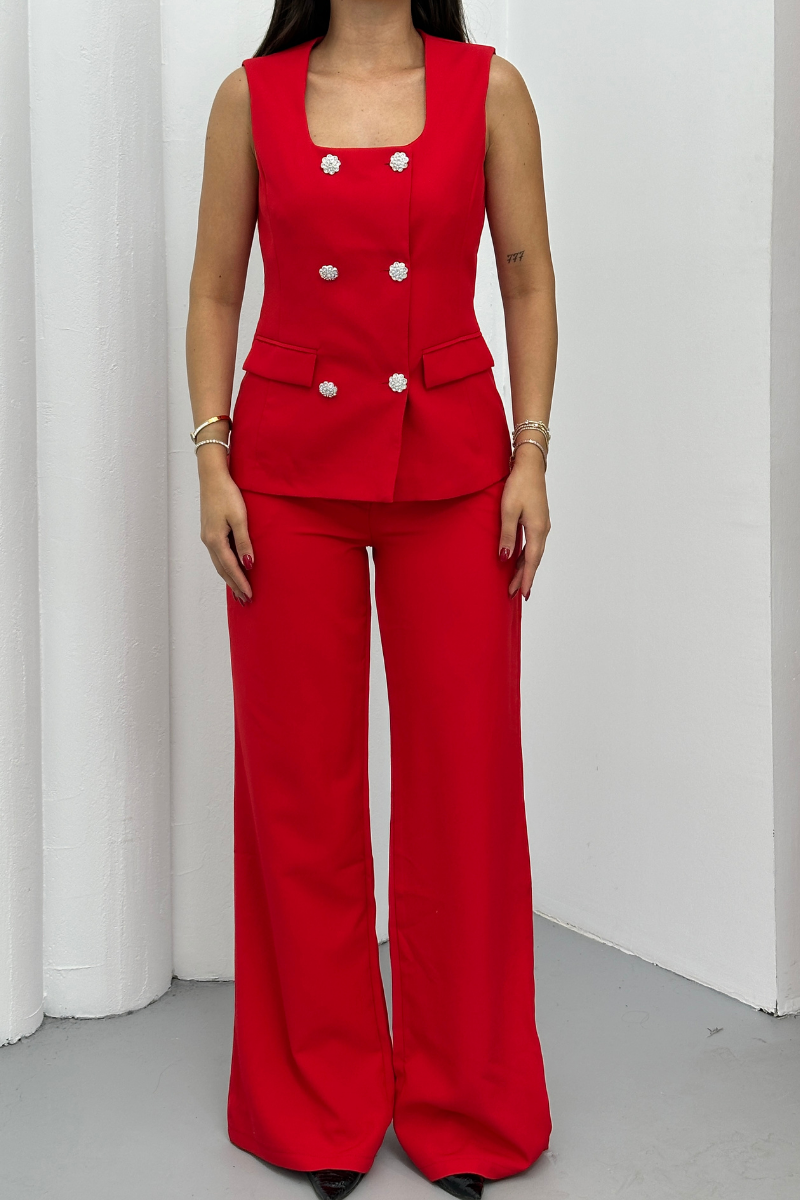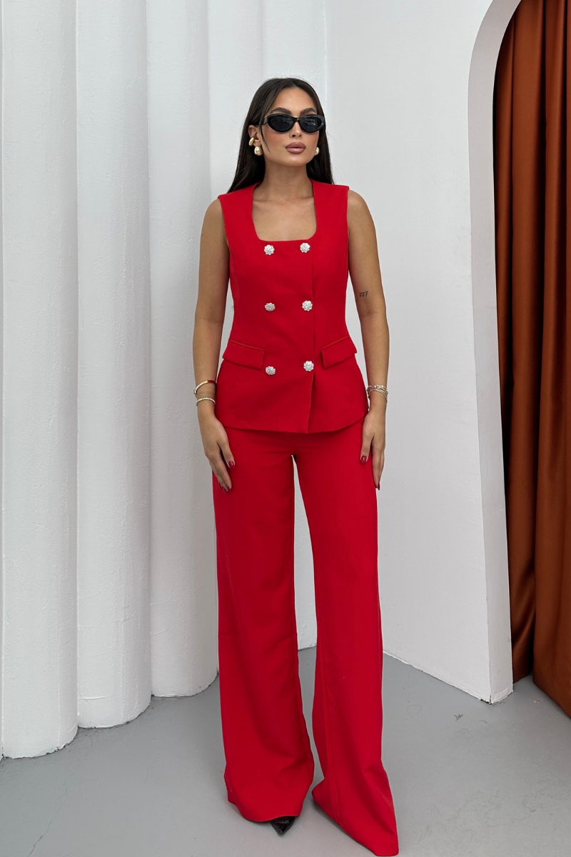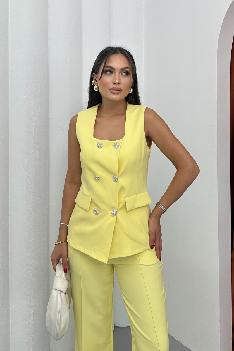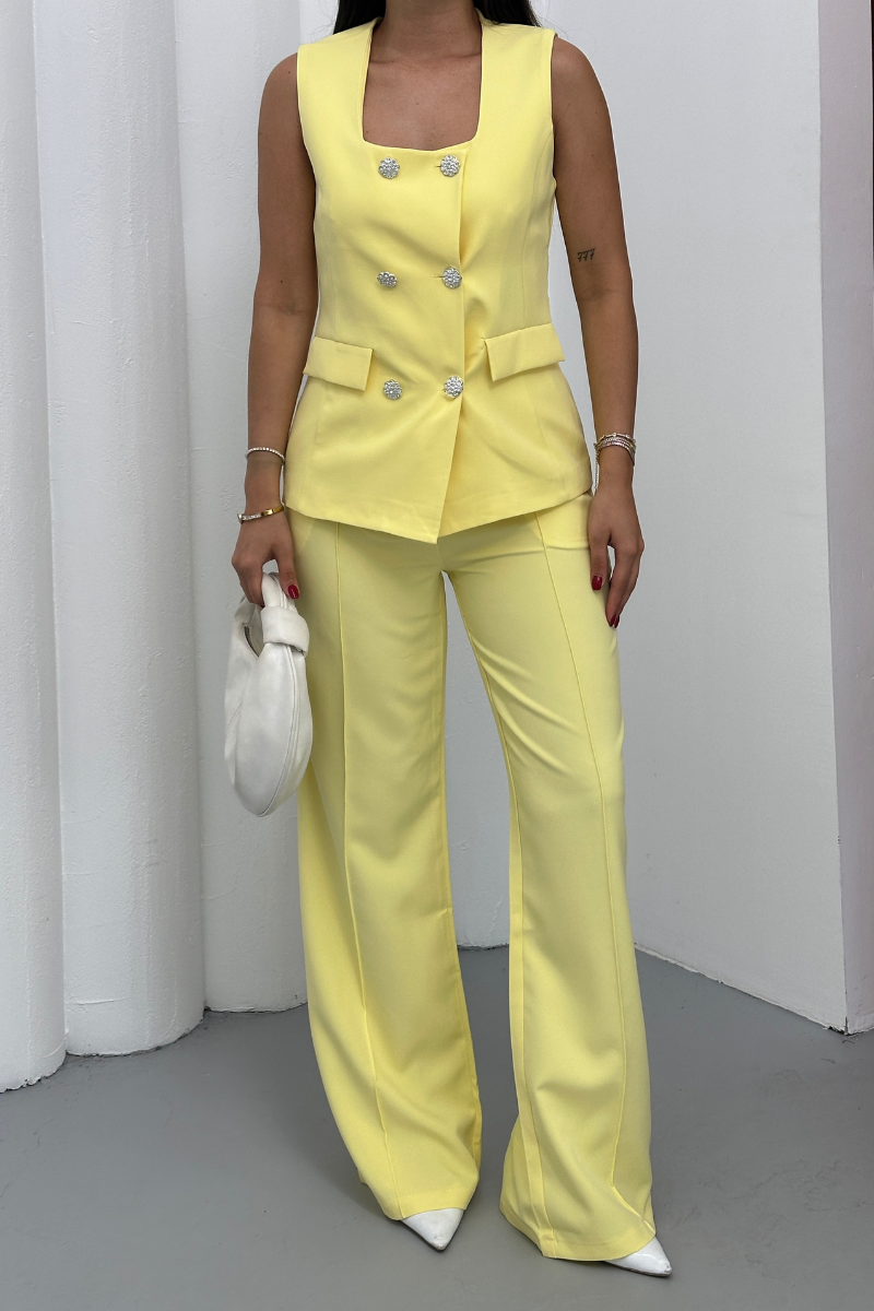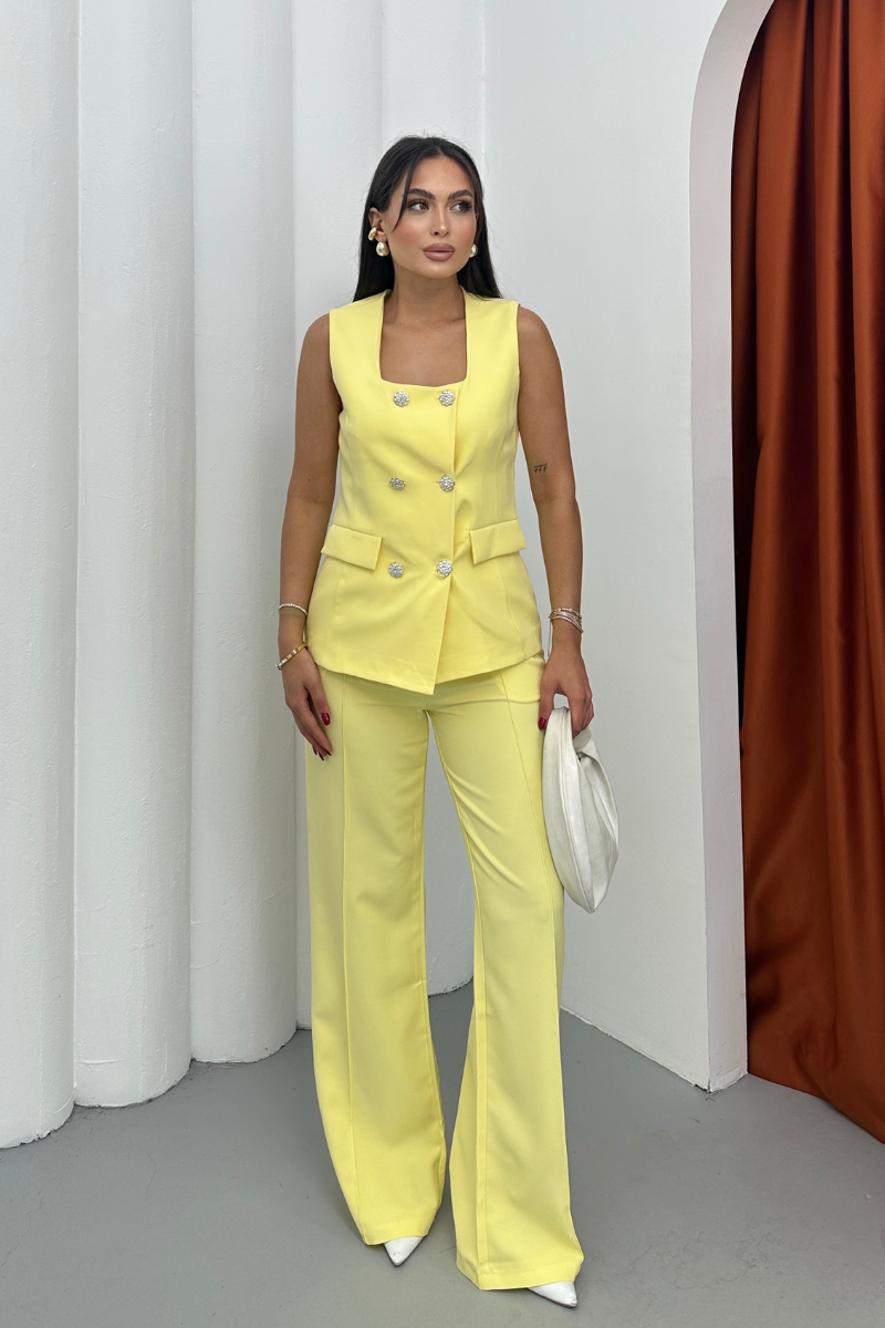 Kadın İkili Alt Üst Takım Şık Düğme Detaylı Kare Yaka Yelek Pantolon Takım