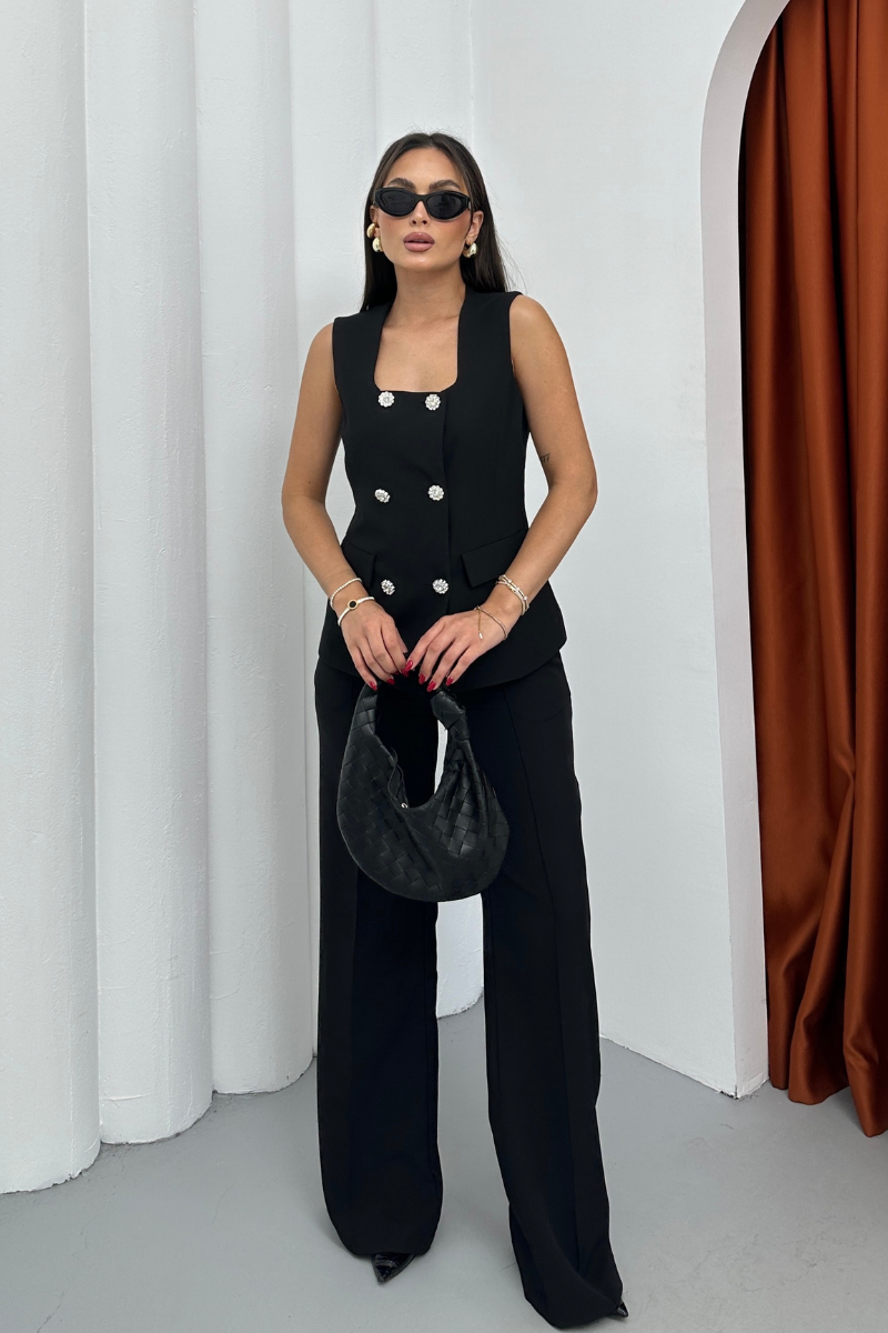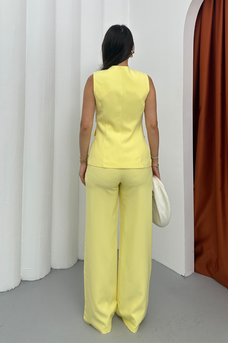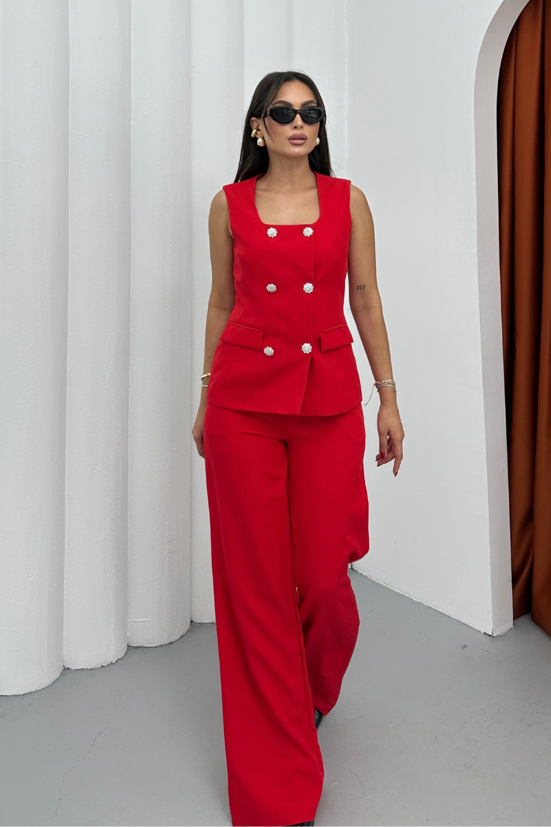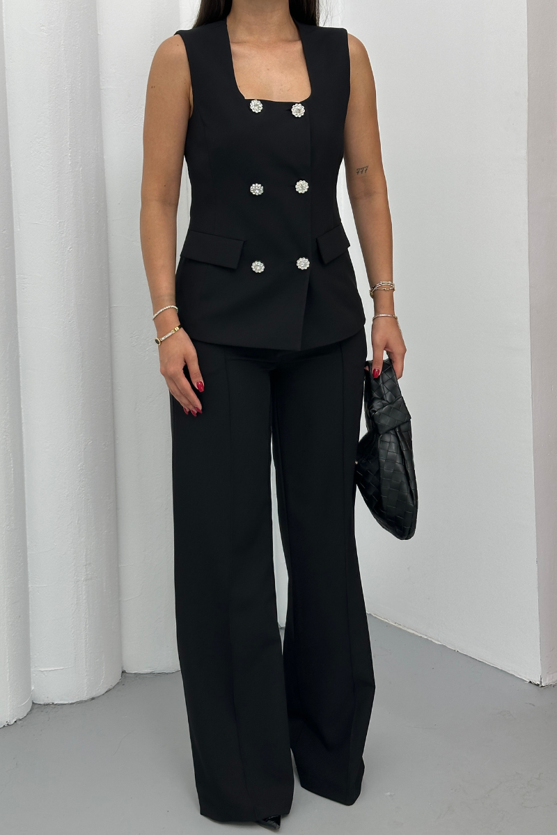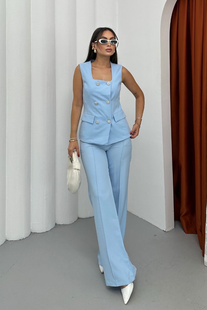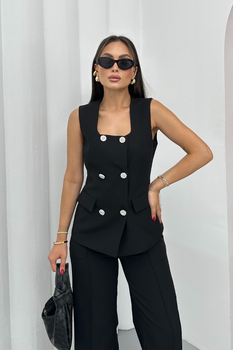 Kadın İkili Alt Üst Takım Şık Düğme Detaylı Kare Yaka Yelek Pantolon Takım