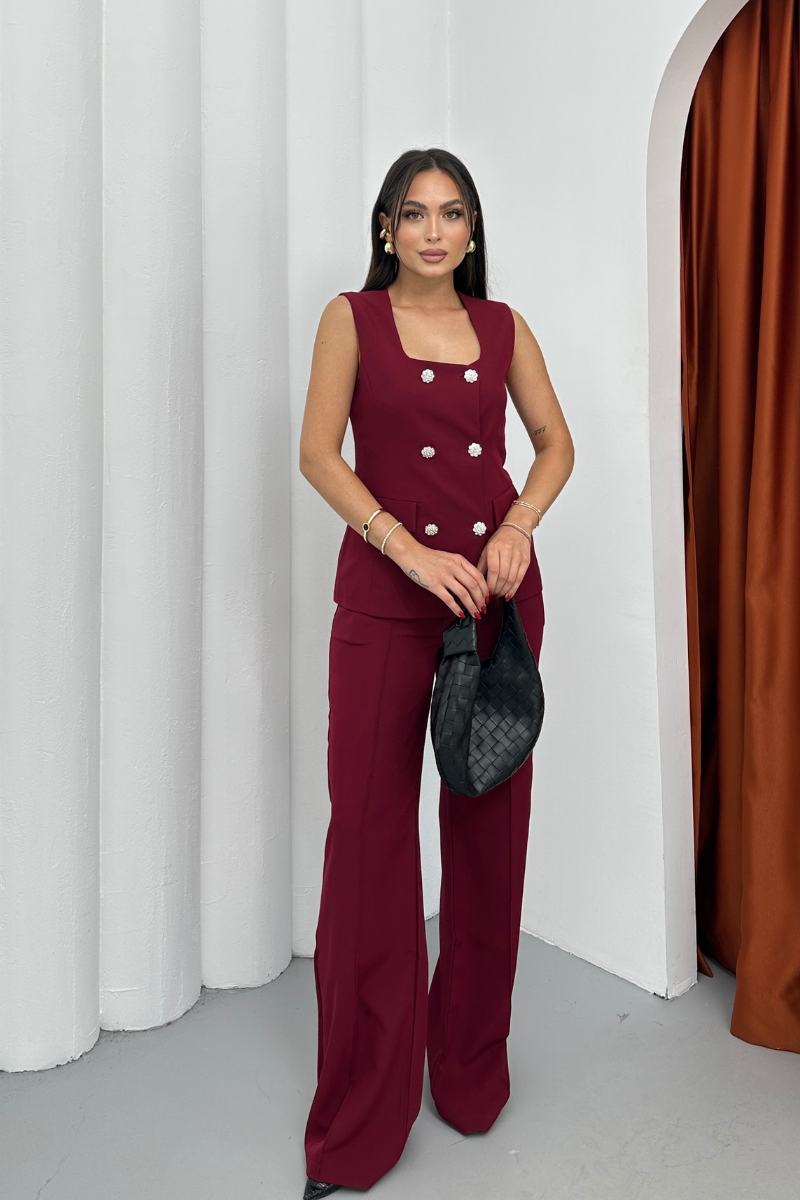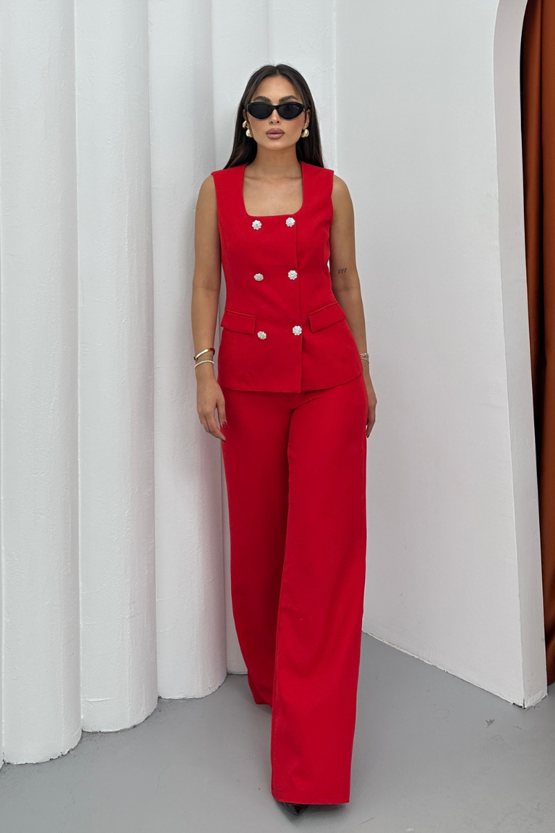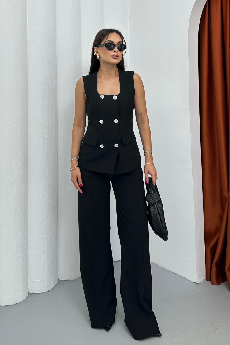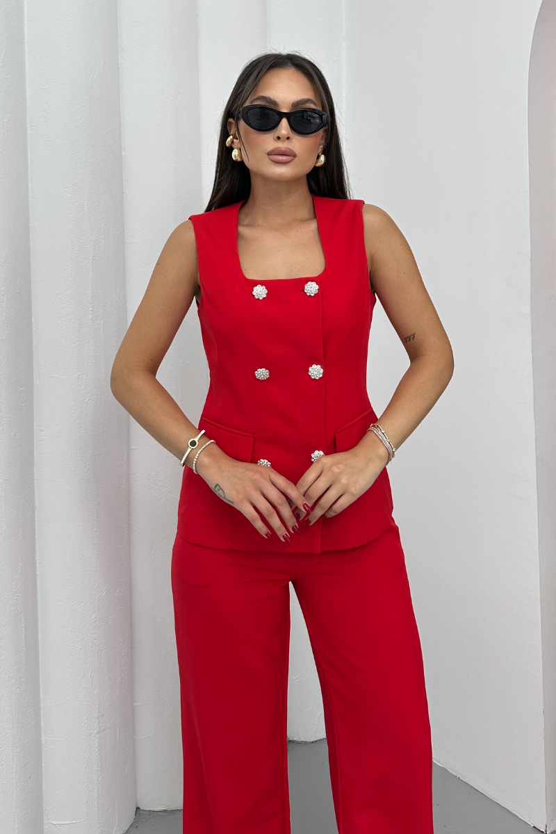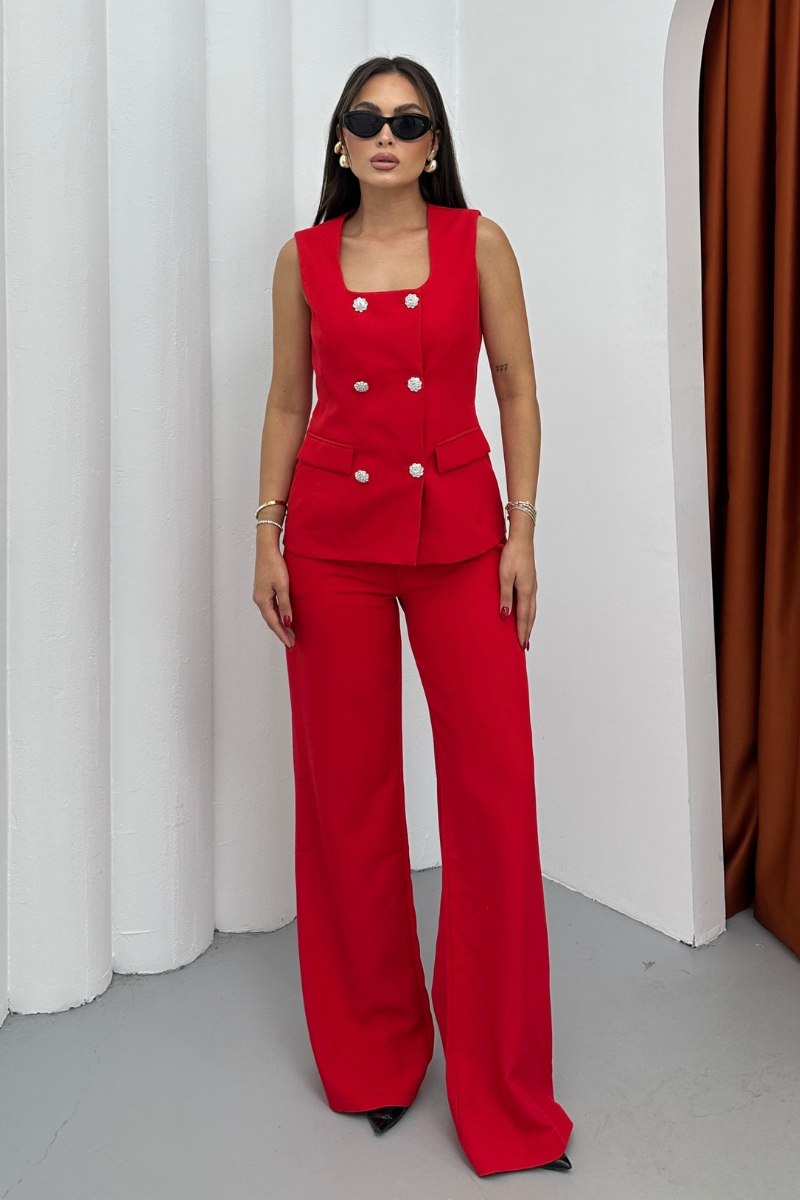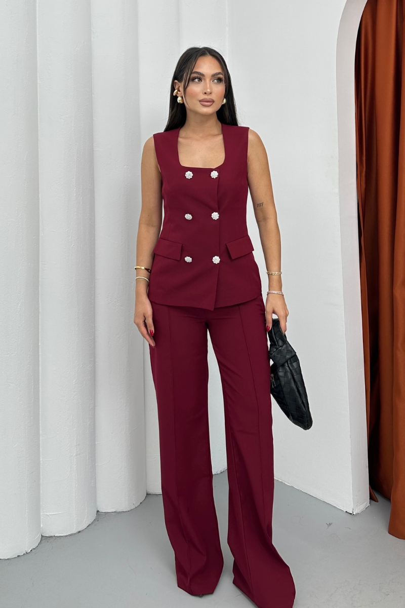 Kadın İkili Alt Üst Takım Şık Düğme Detaylı Kare Yaka Yelek Pantolon Takım