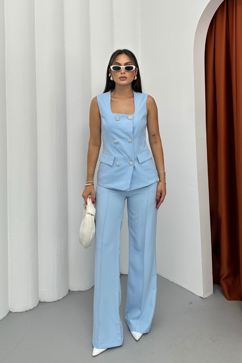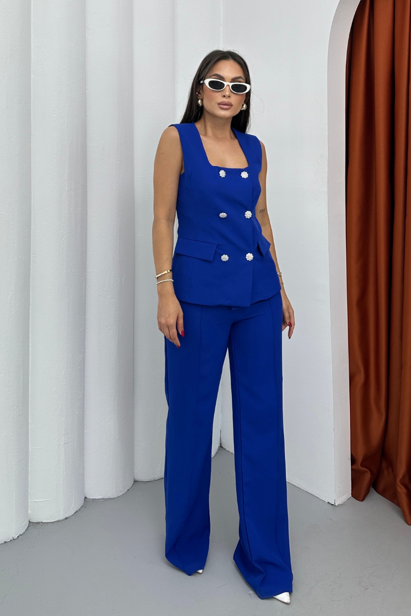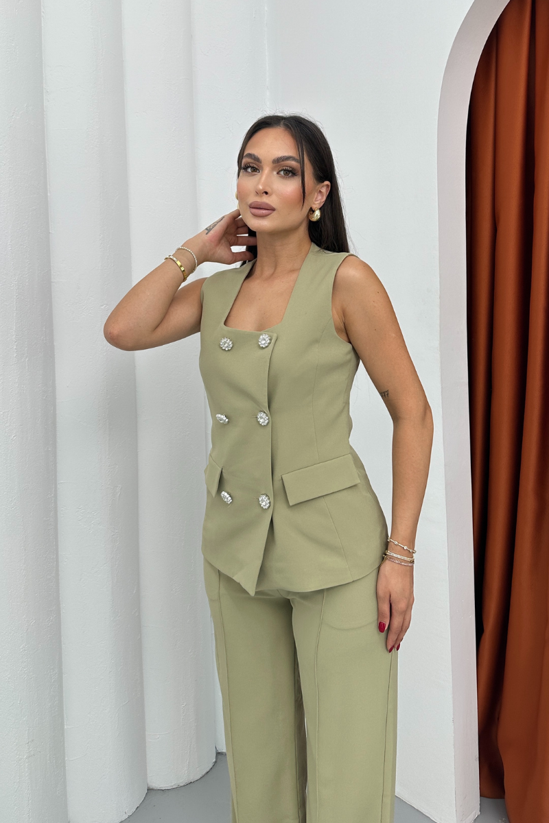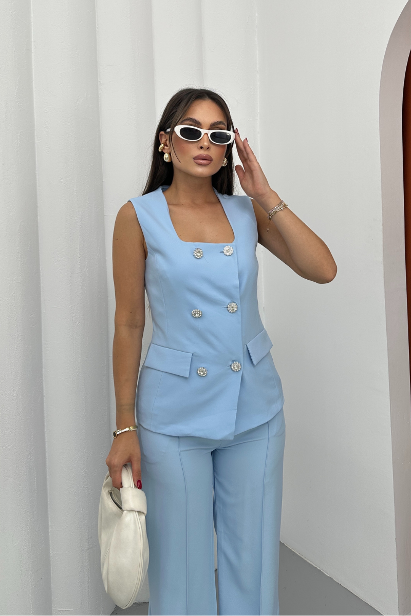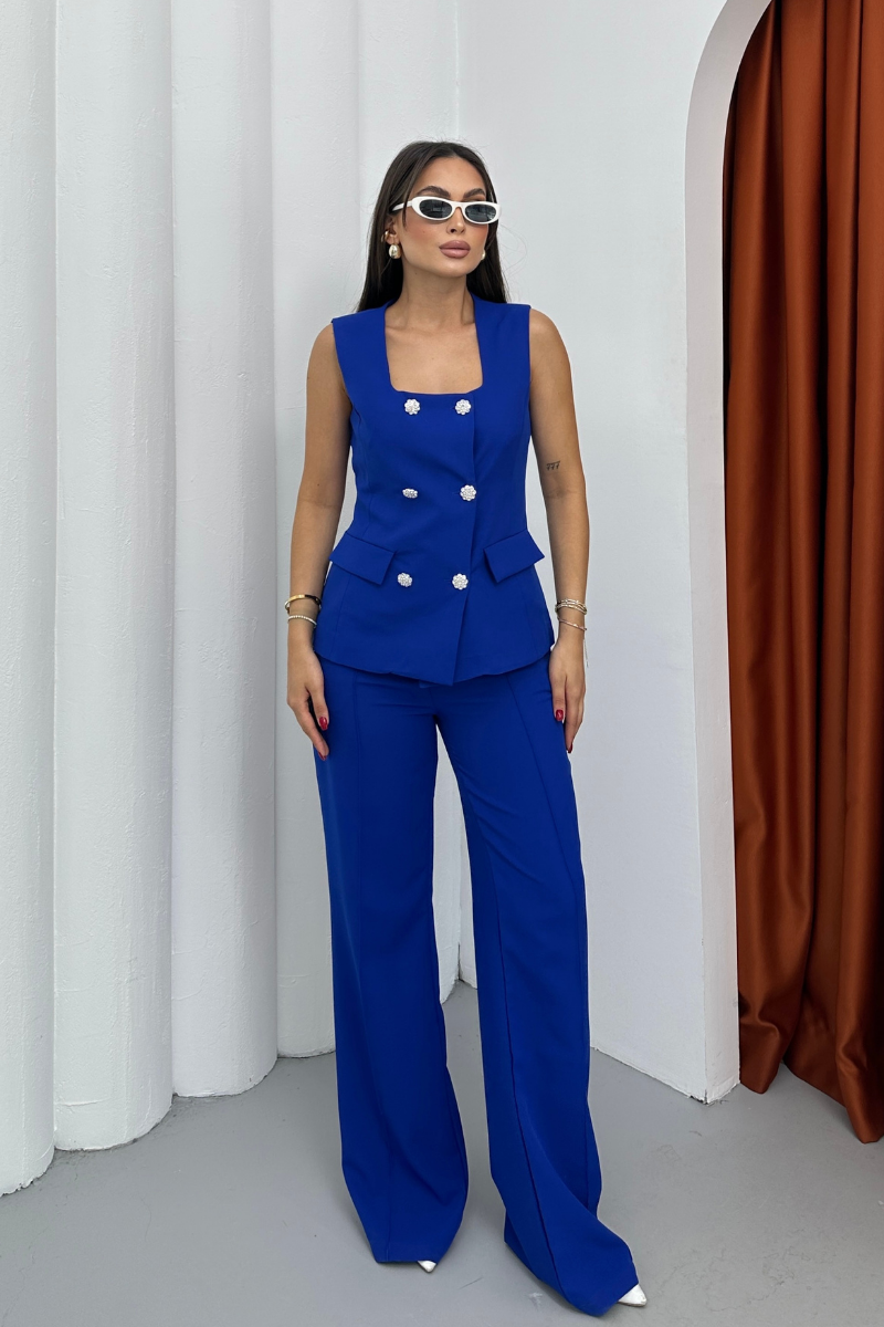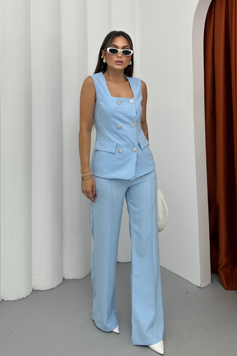 Kadın İkili Alt Üst Takım Şık Düğme Detaylı Kare Yaka Yelek Pantolon Takım