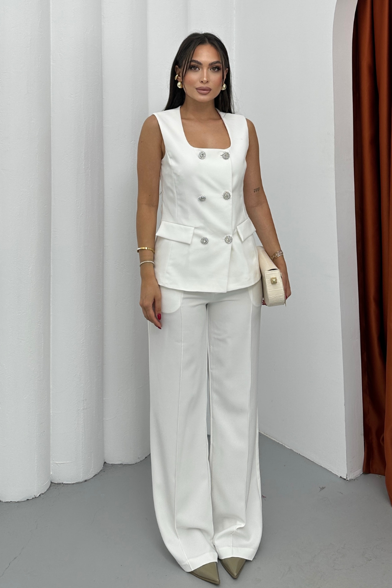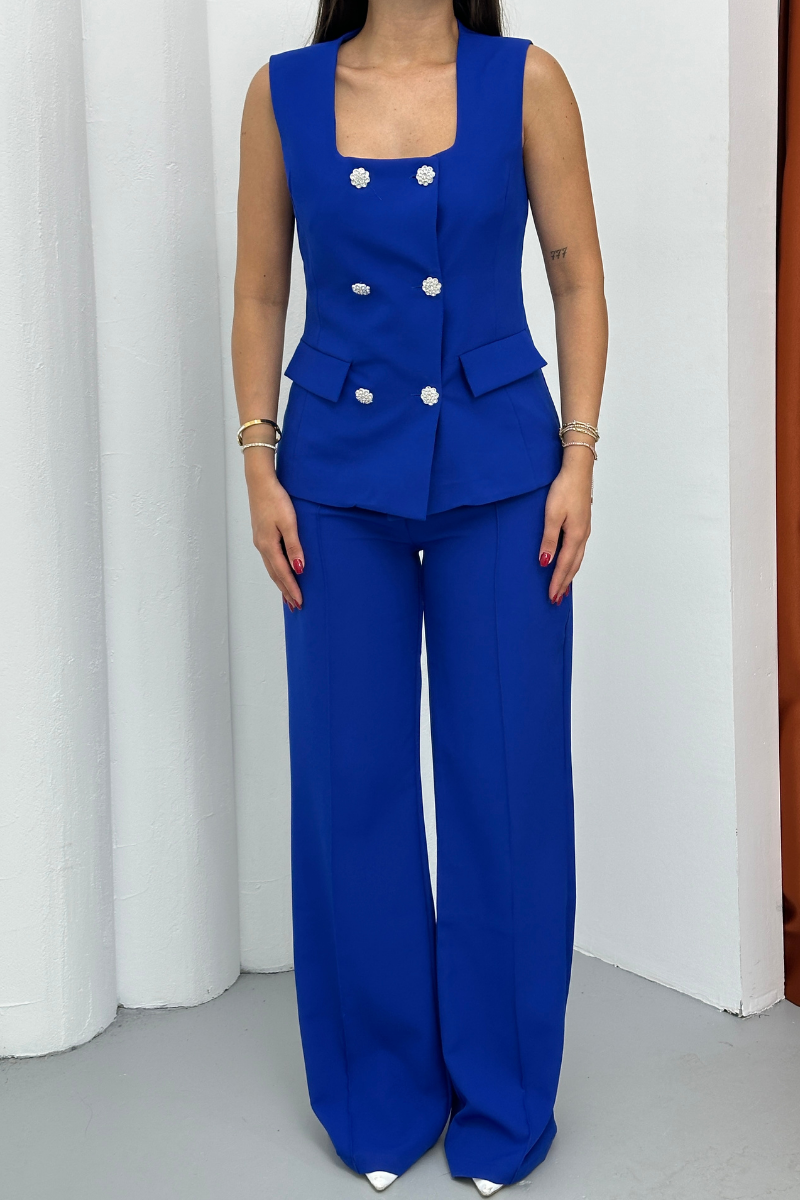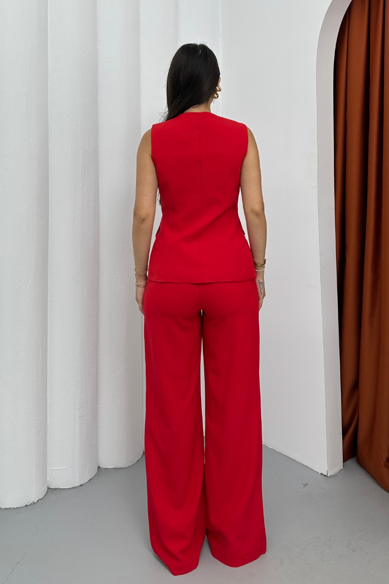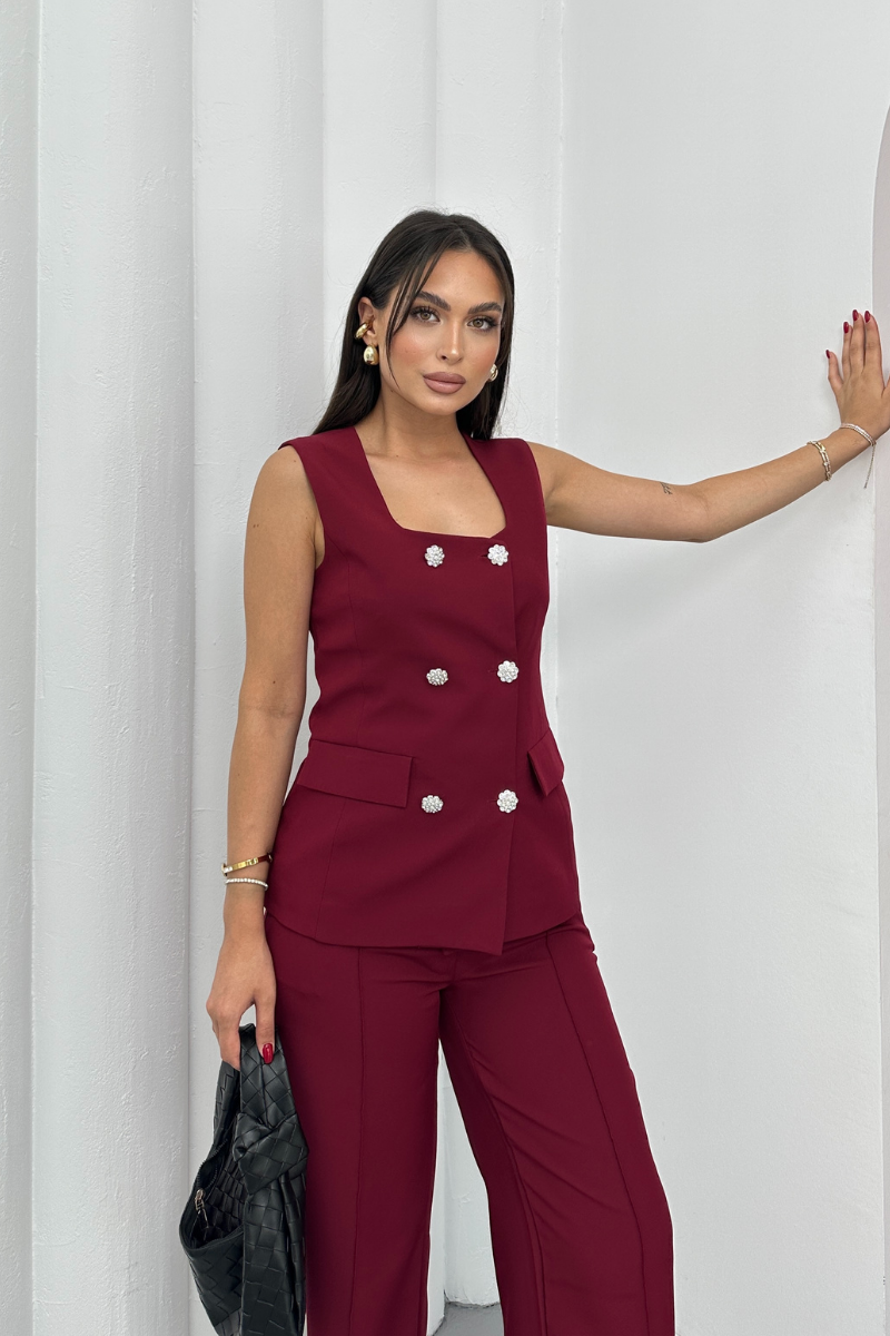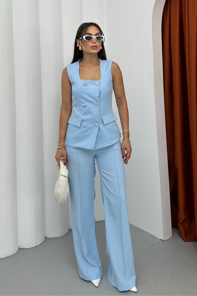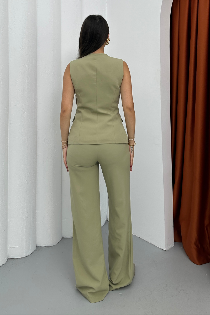Kadın İkili Alt Üst Takım Şık Düğme Detaylı Kare Yaka Yelek Pantolon Takım