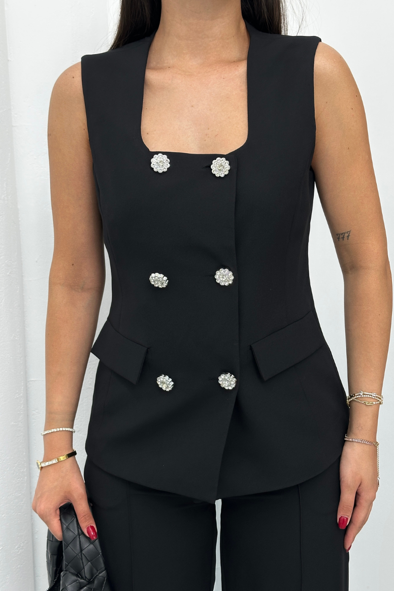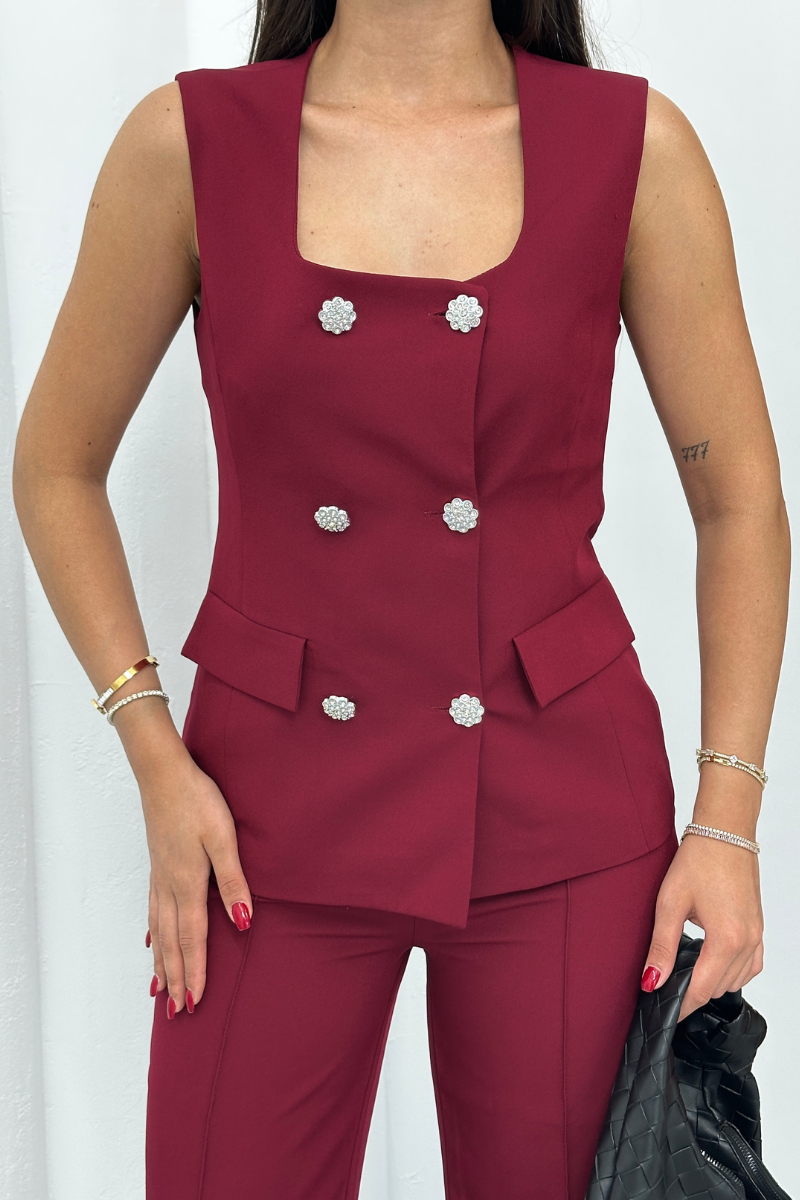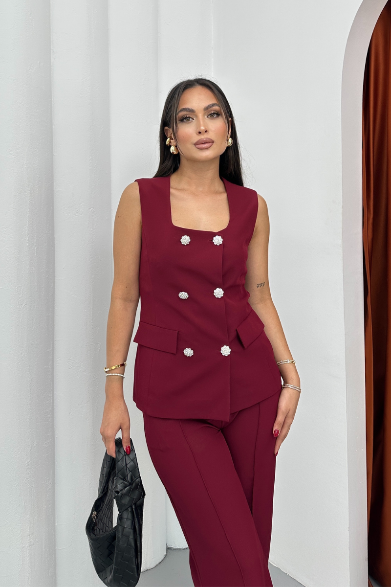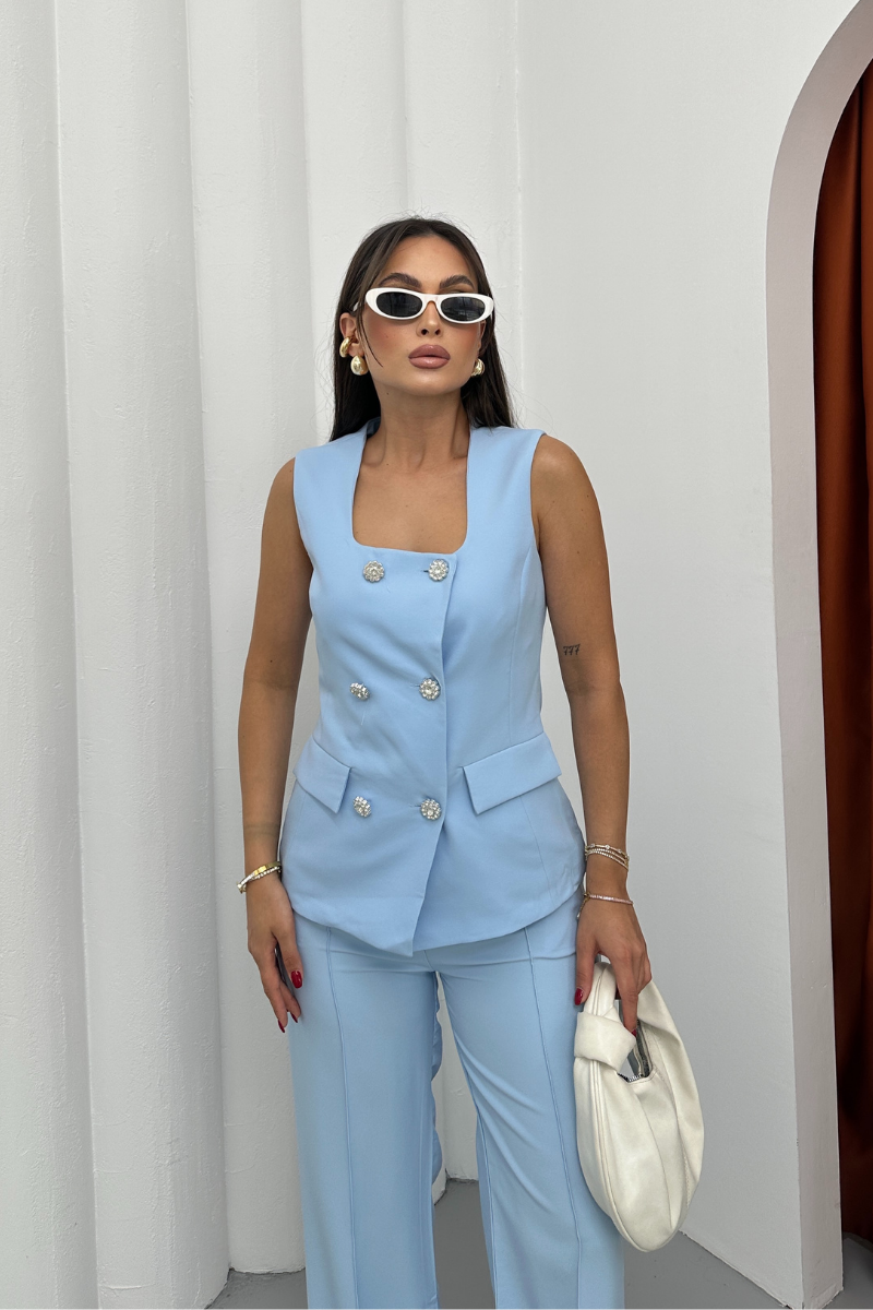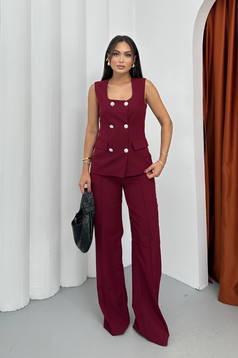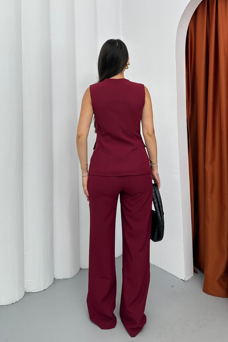 Kadın İkili Alt Üst Takım Şık Düğme Detaylı Kare Yaka Yelek Pantolon Takım