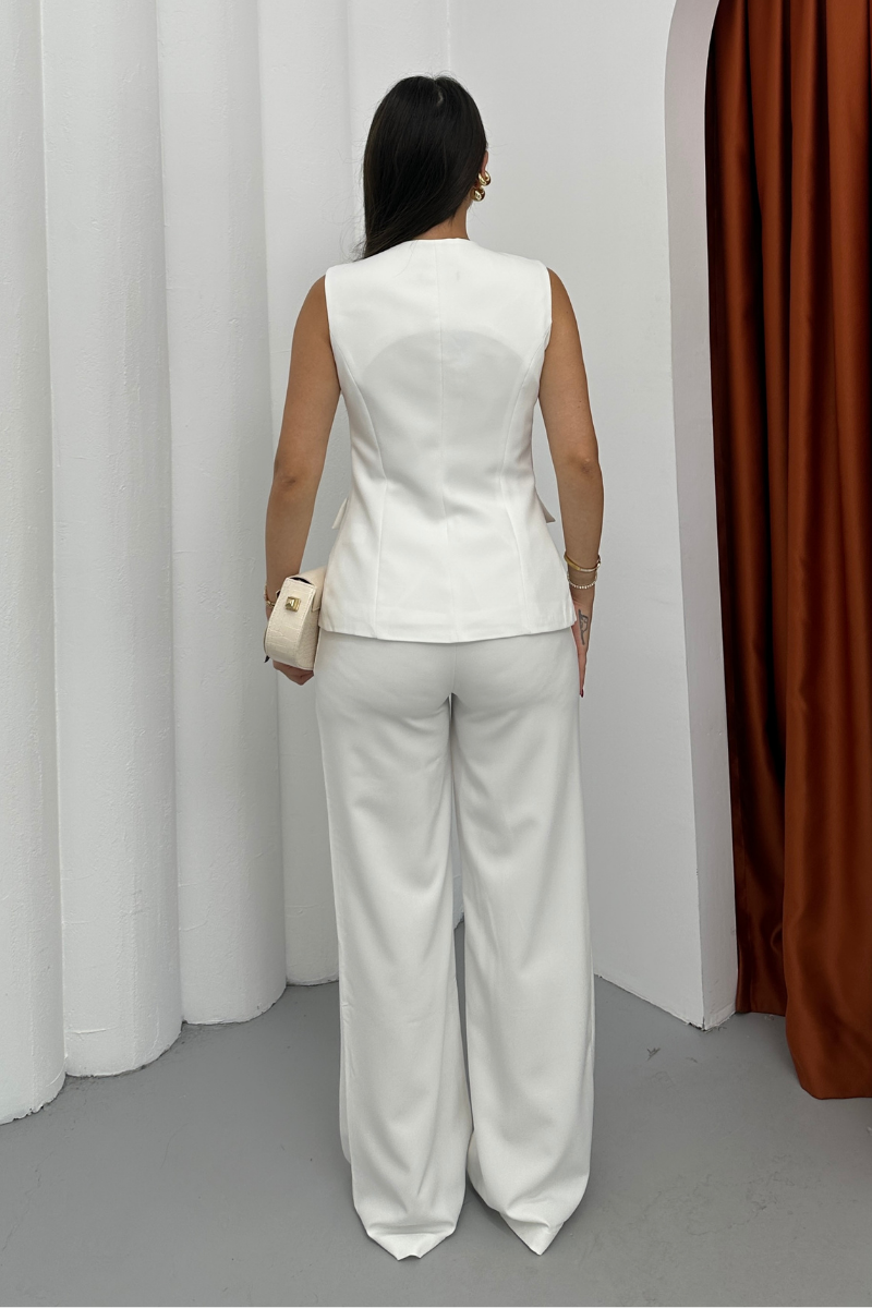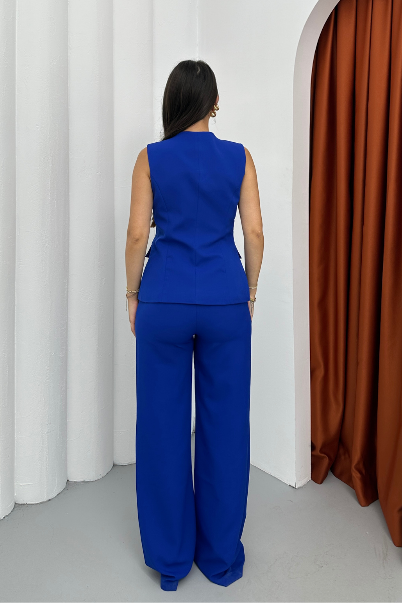 Zarif bir silüet sunan bu kolsuz takım, özel günler ve şık davetler için ideal bir seçimdir. Kare yaka detayı ve geniş paça pantolonu ile vücut hatlarını zarifçe vurgular. Göz alıcı ama abartısız bir şıklık arayanların gardırobuna modern bir dokunuş katıyor.