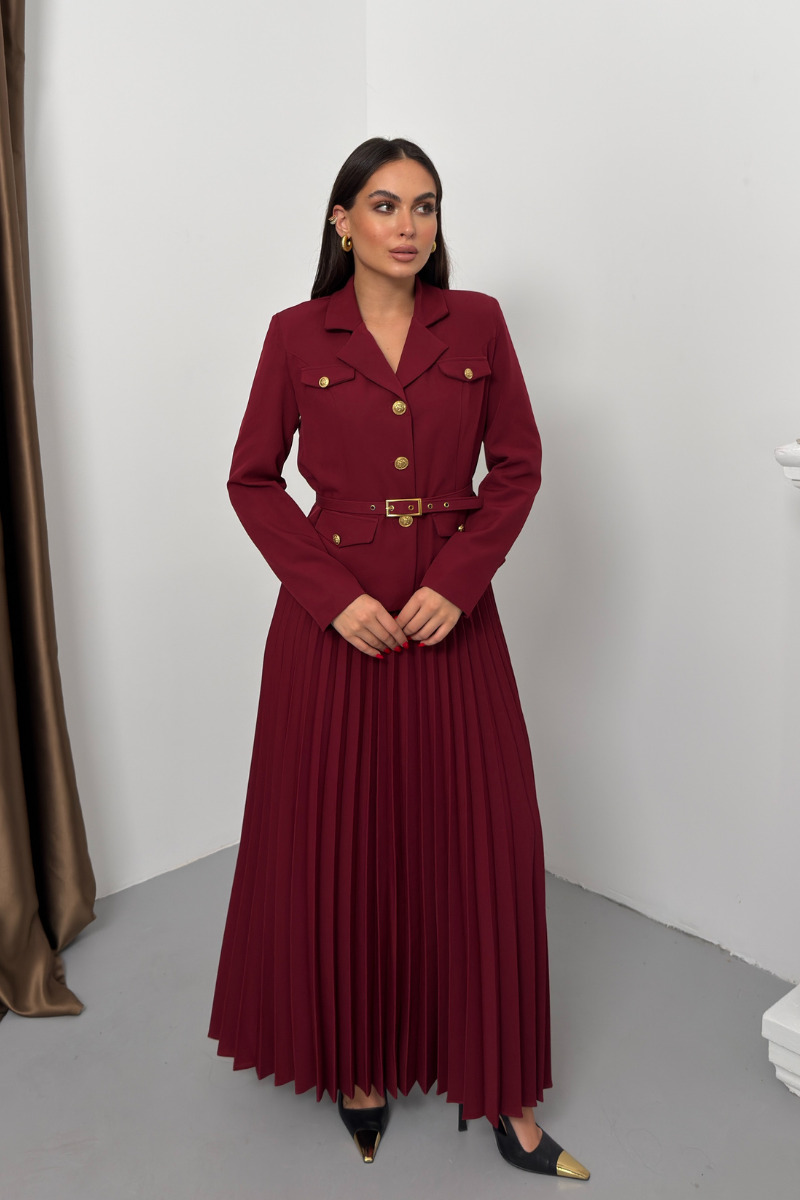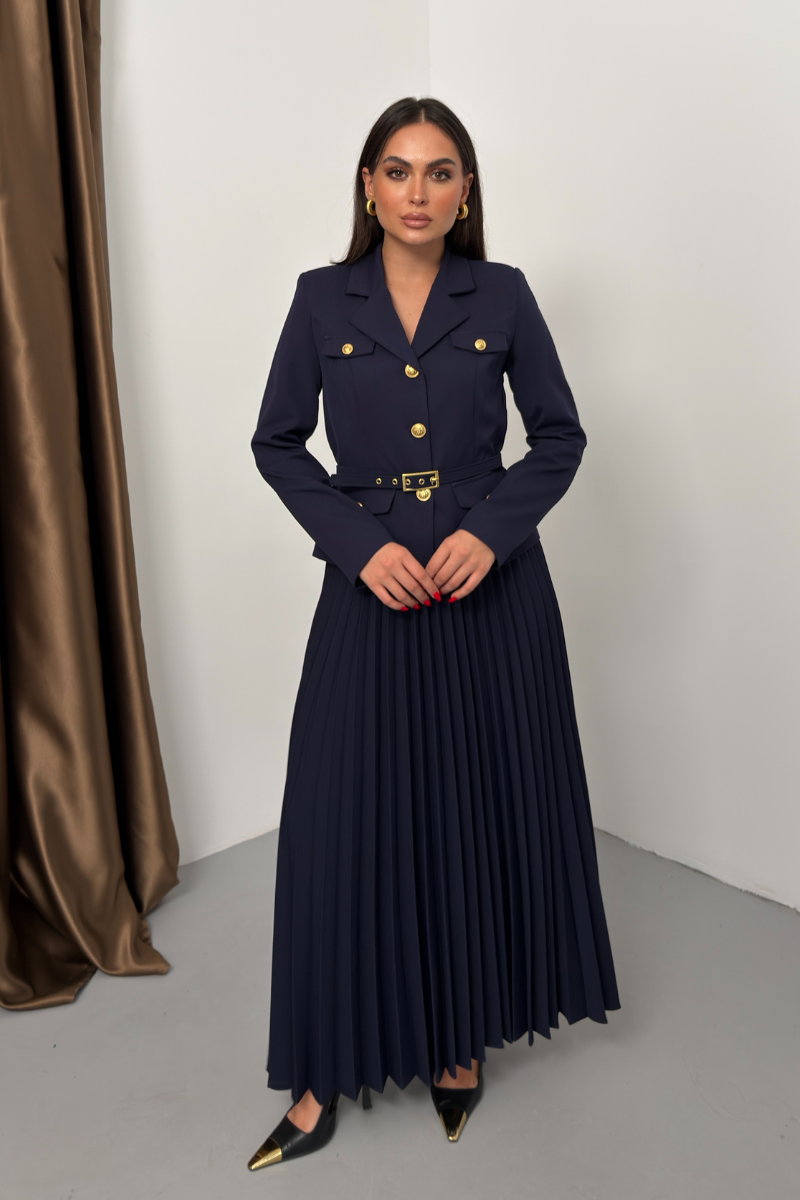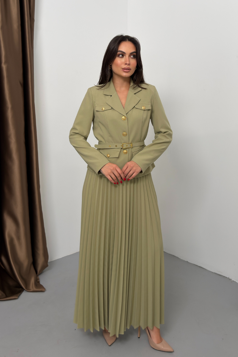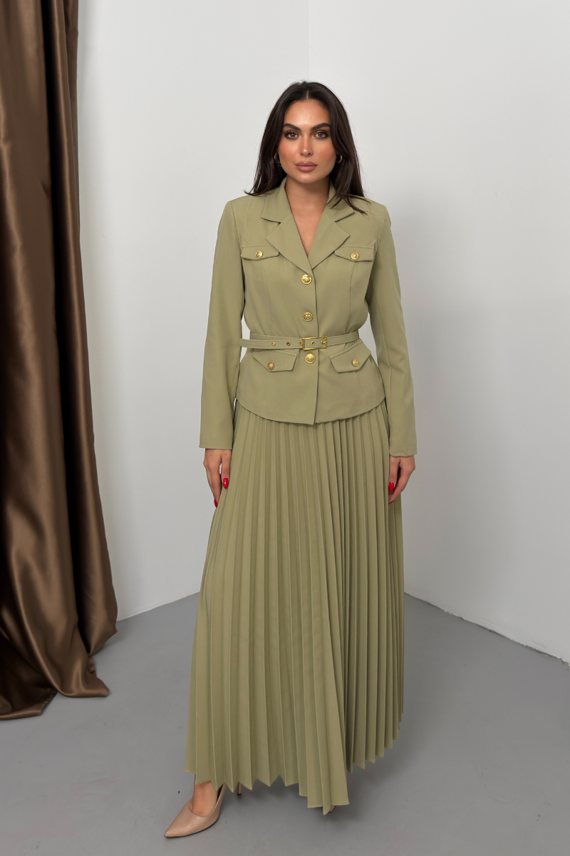 Kadın İkili Alt Üst Takım Şık Kemerli Cep ve Düğme Detaylı Kısa Blazer Ceket Piliseli Uzun Etek Takım