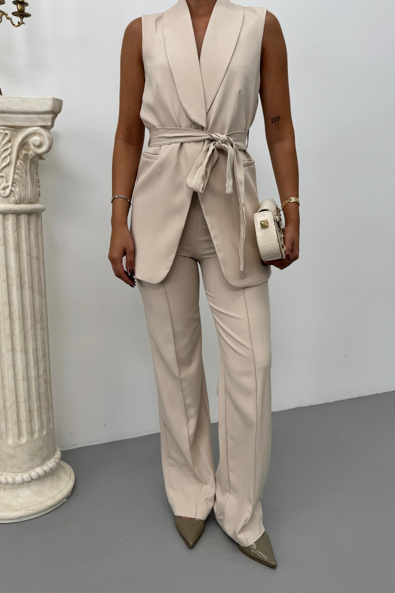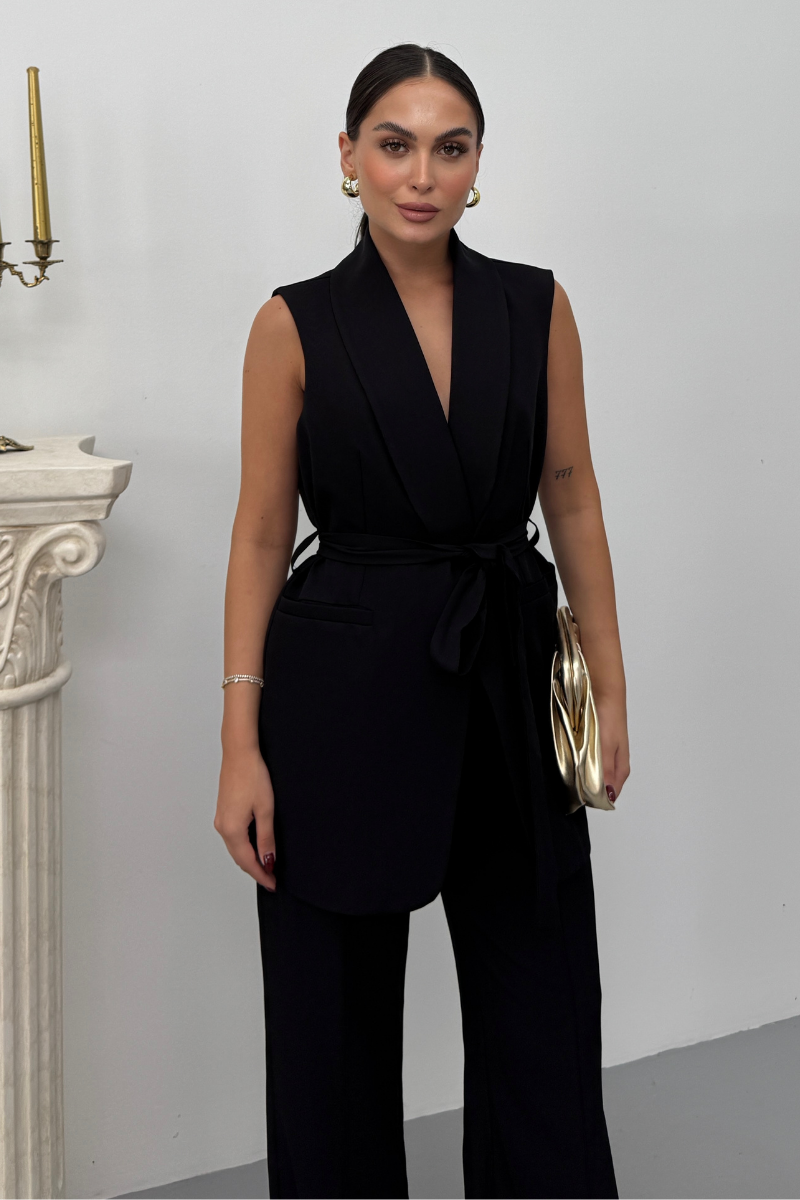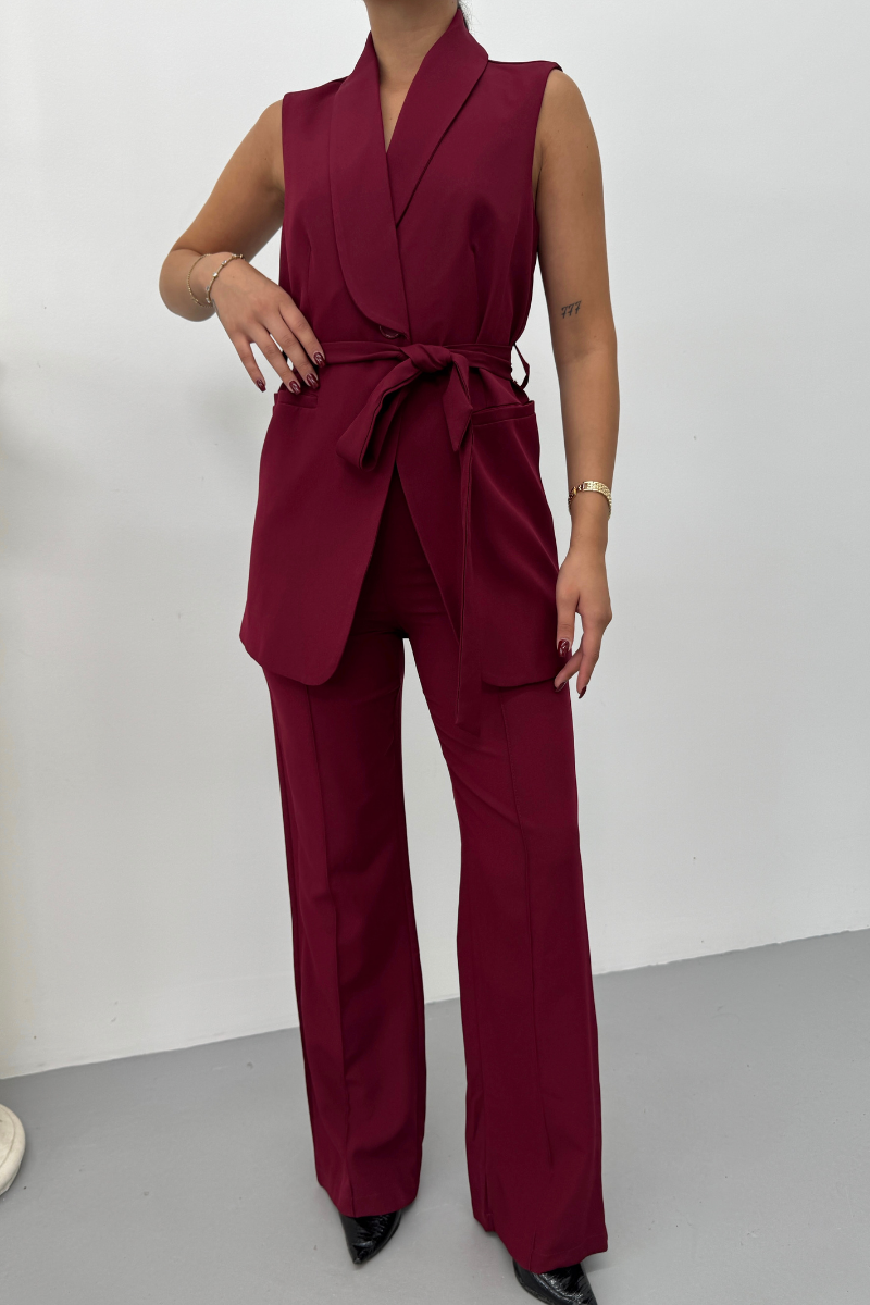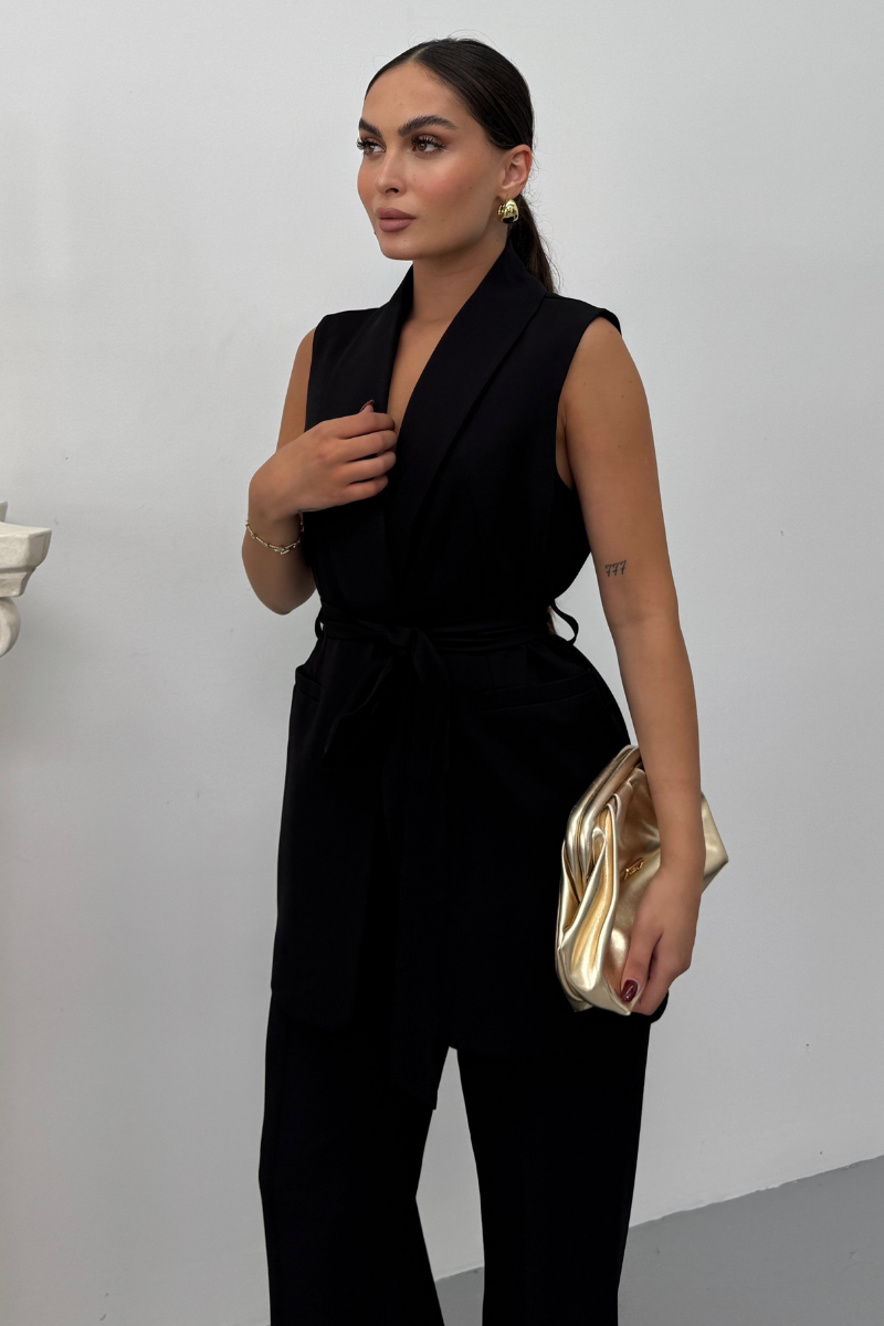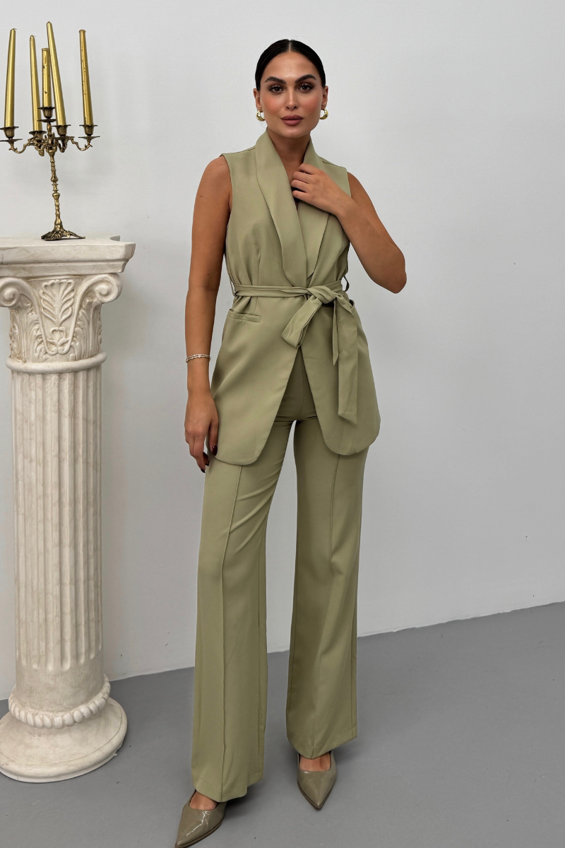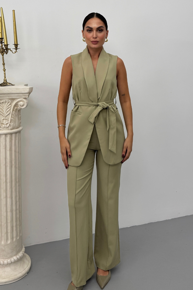 Kadın İkili Alt Üst Takım Şık Kuşaklı Cep Detaylı Yelek Pantolon Takım
