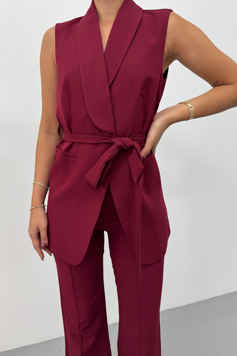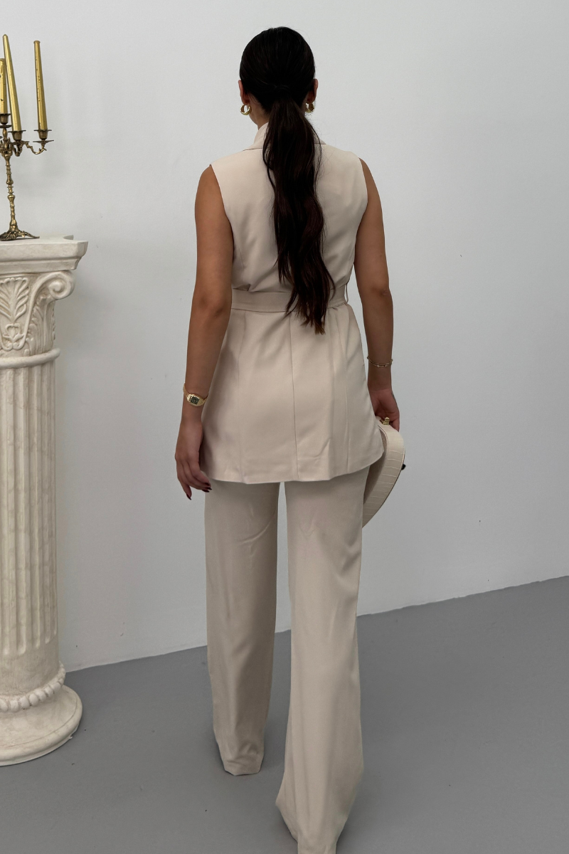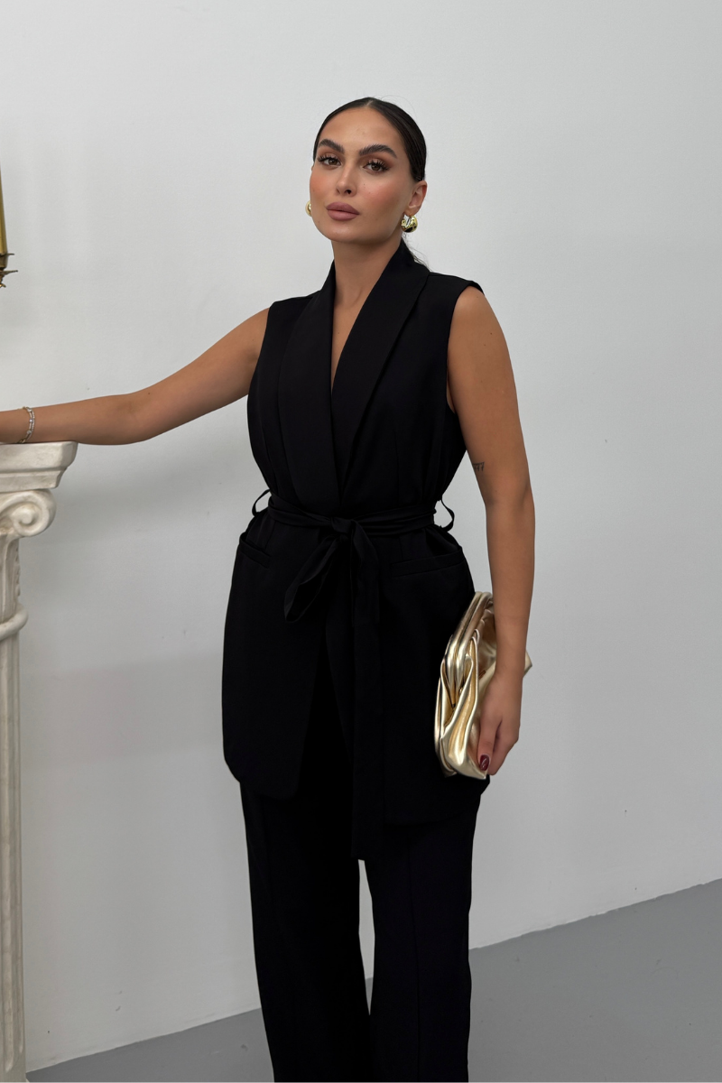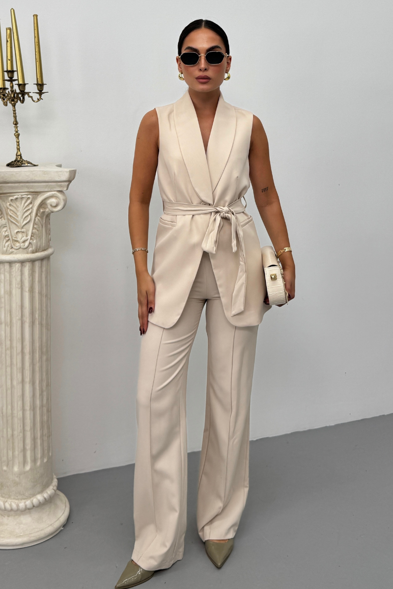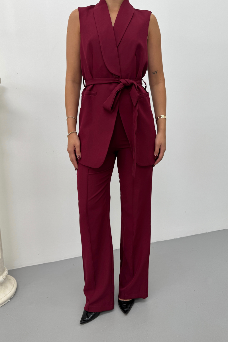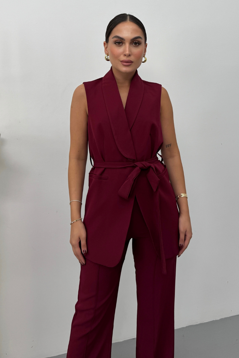 Kadın İkili Alt Üst Takım Şık Kuşaklı Cep Detaylı Yelek Pantolon Takım