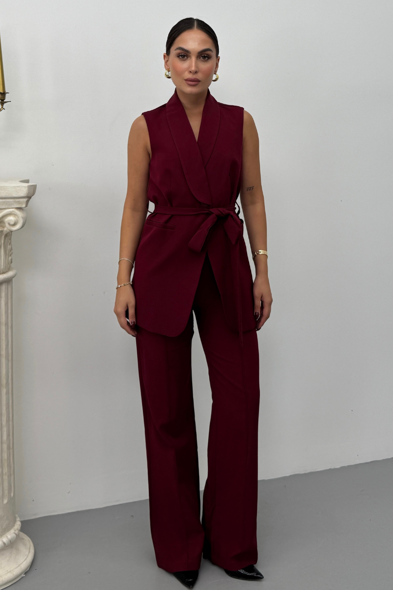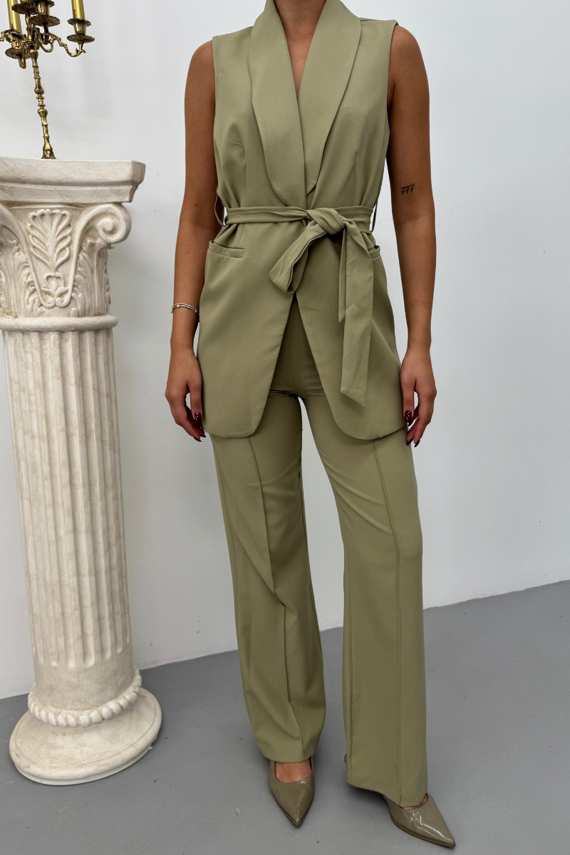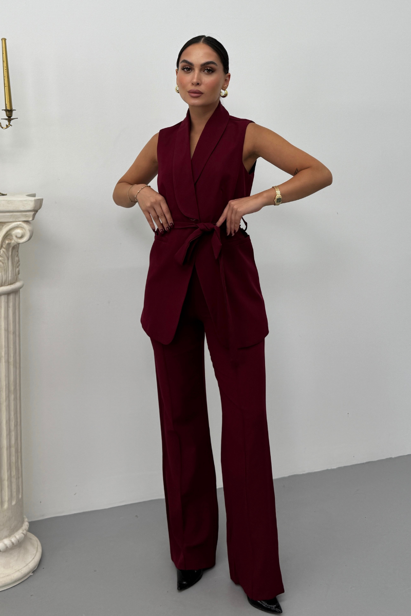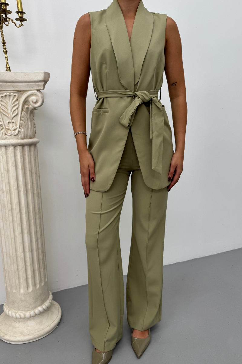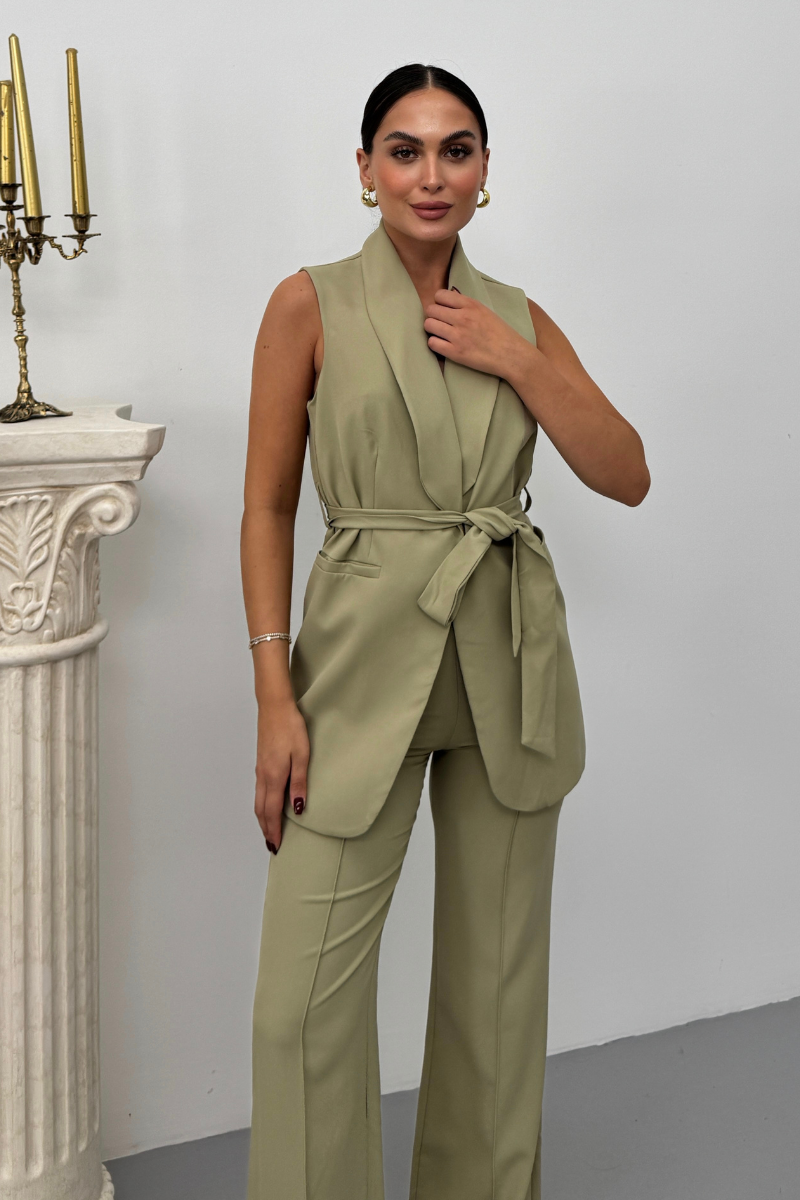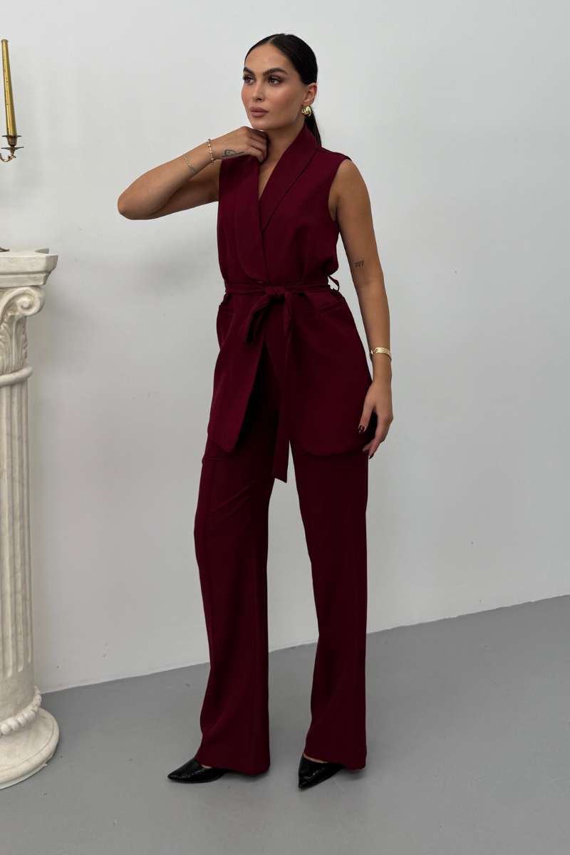 Kadın İkili Alt Üst Takım Şık Kuşaklı Cep Detaylı Yelek Pantolon Takım