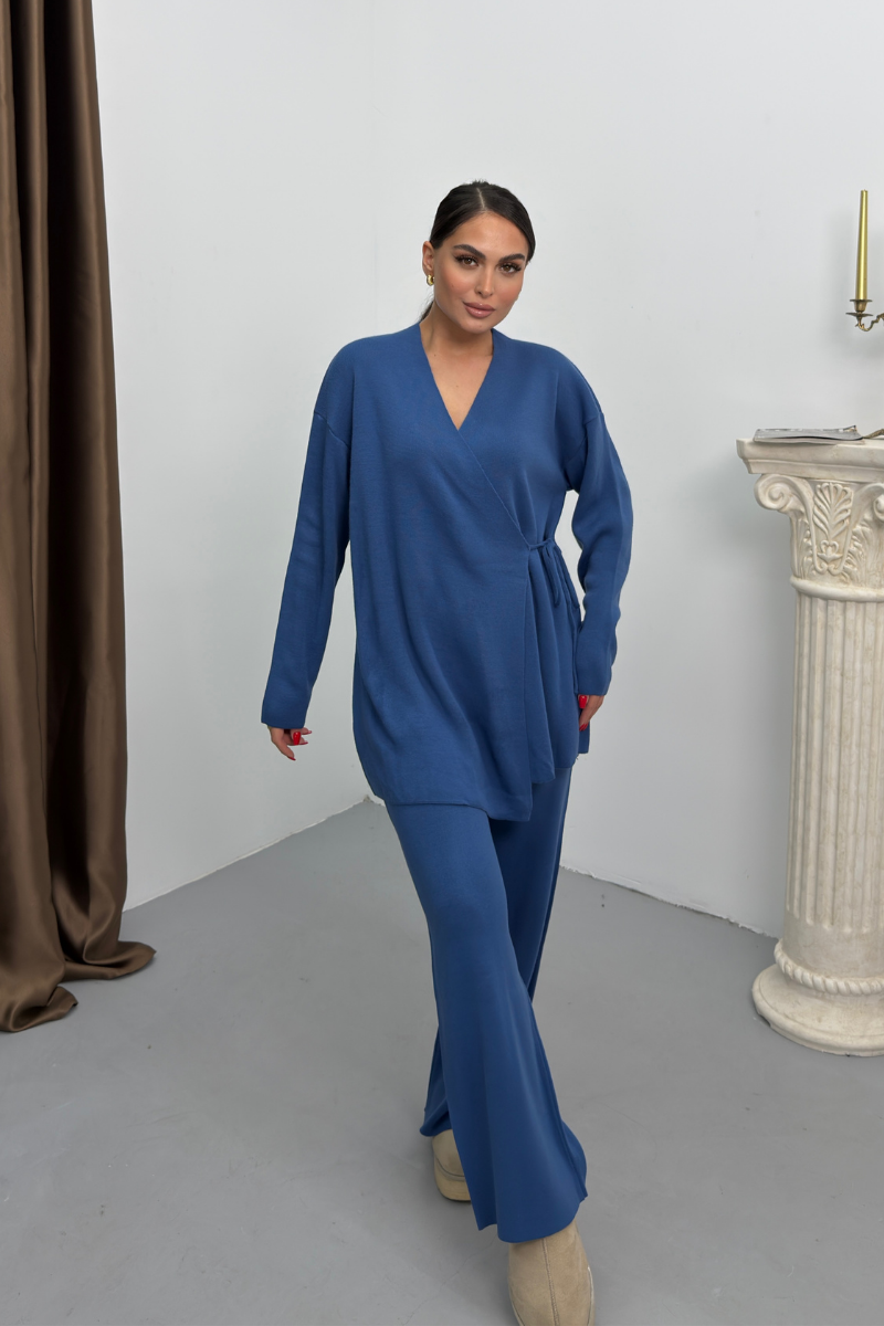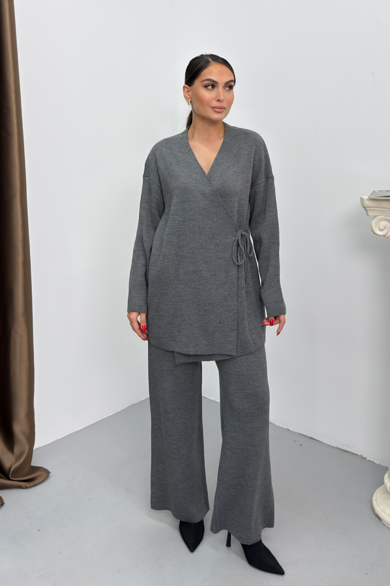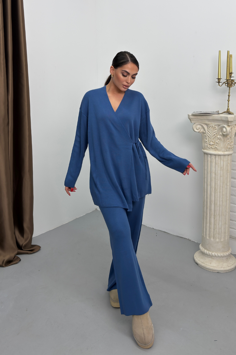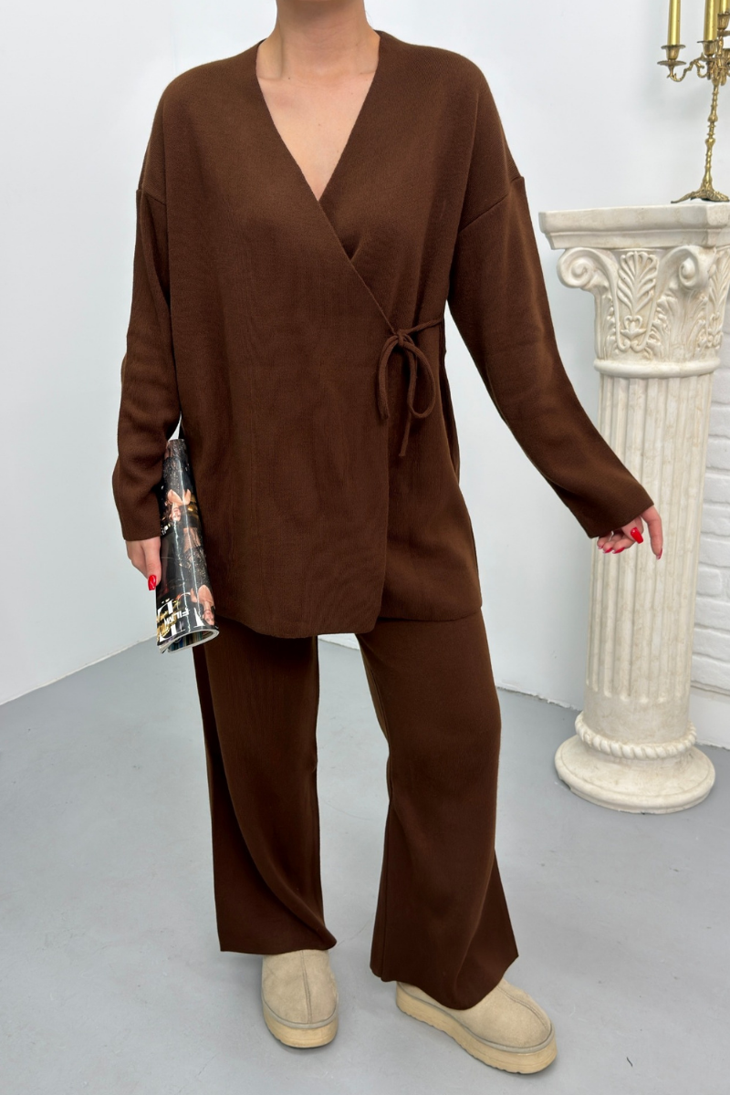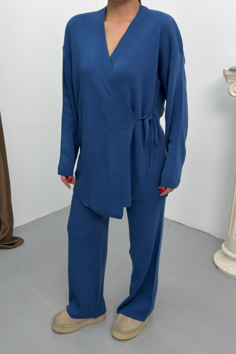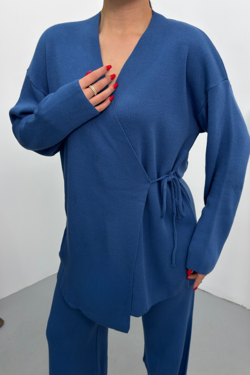 Kadın İkili Alt Üst Takım Triko Yandan Bağcıklı Kruvaze Hırka Bol Paça Pantolon Örme Takım