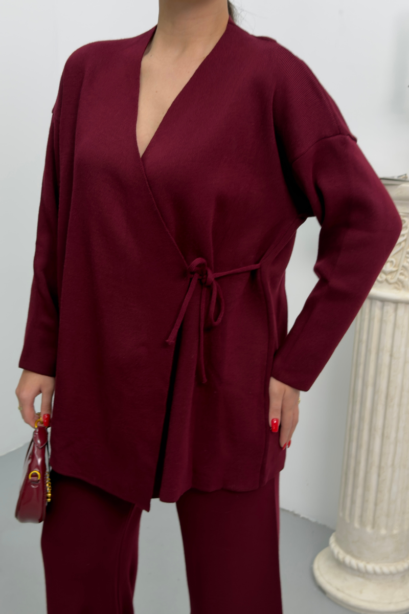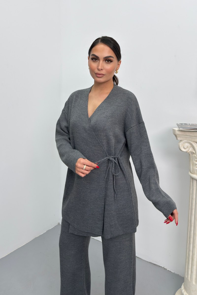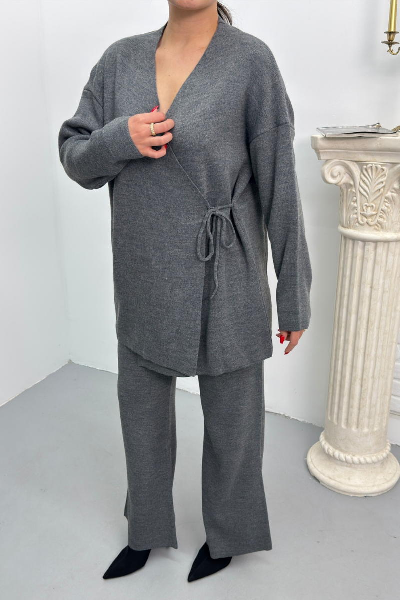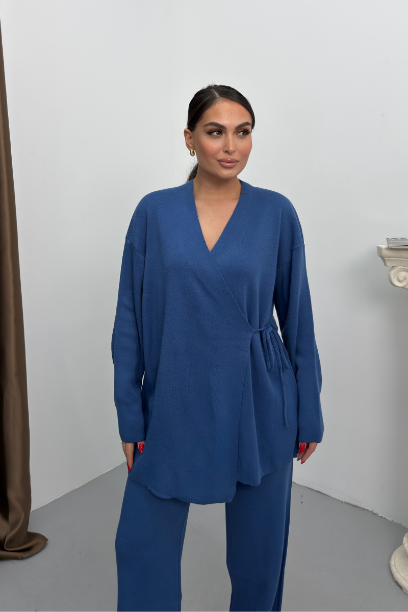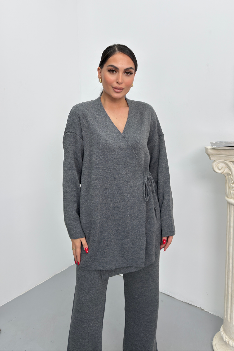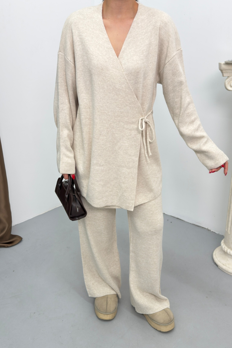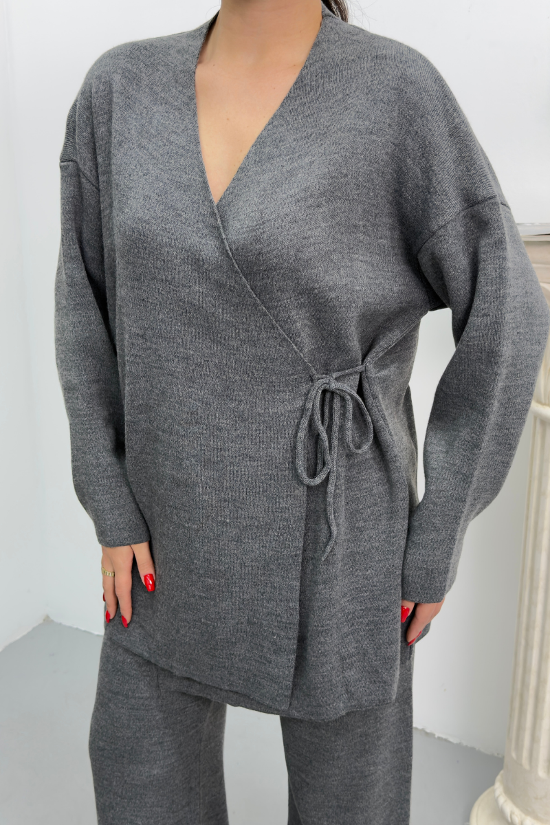 Kadın İkili Alt Üst Takım Triko Yandan Bağcıklı Kruvaze Hırka Bol Paça Pantolon Örme Takım