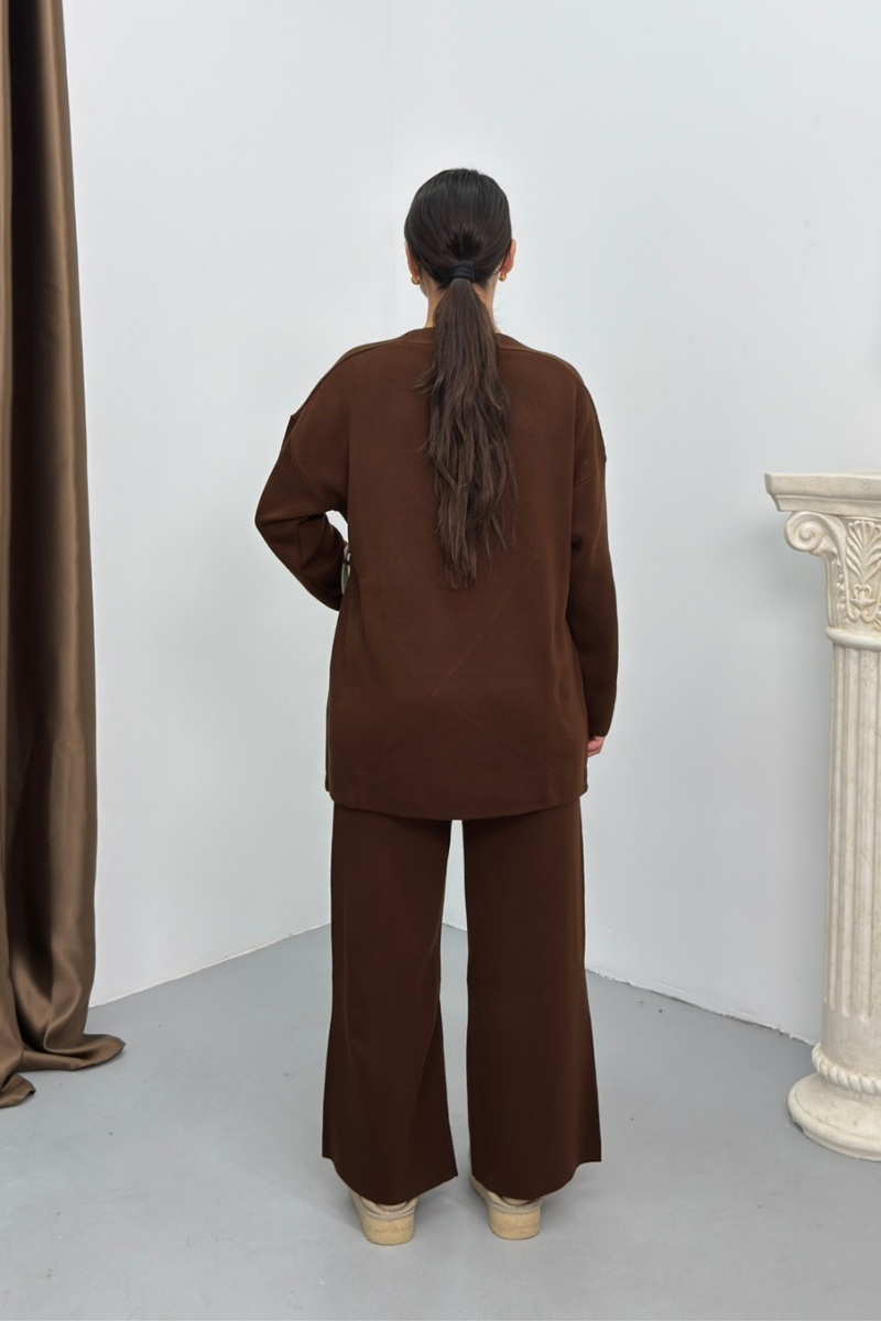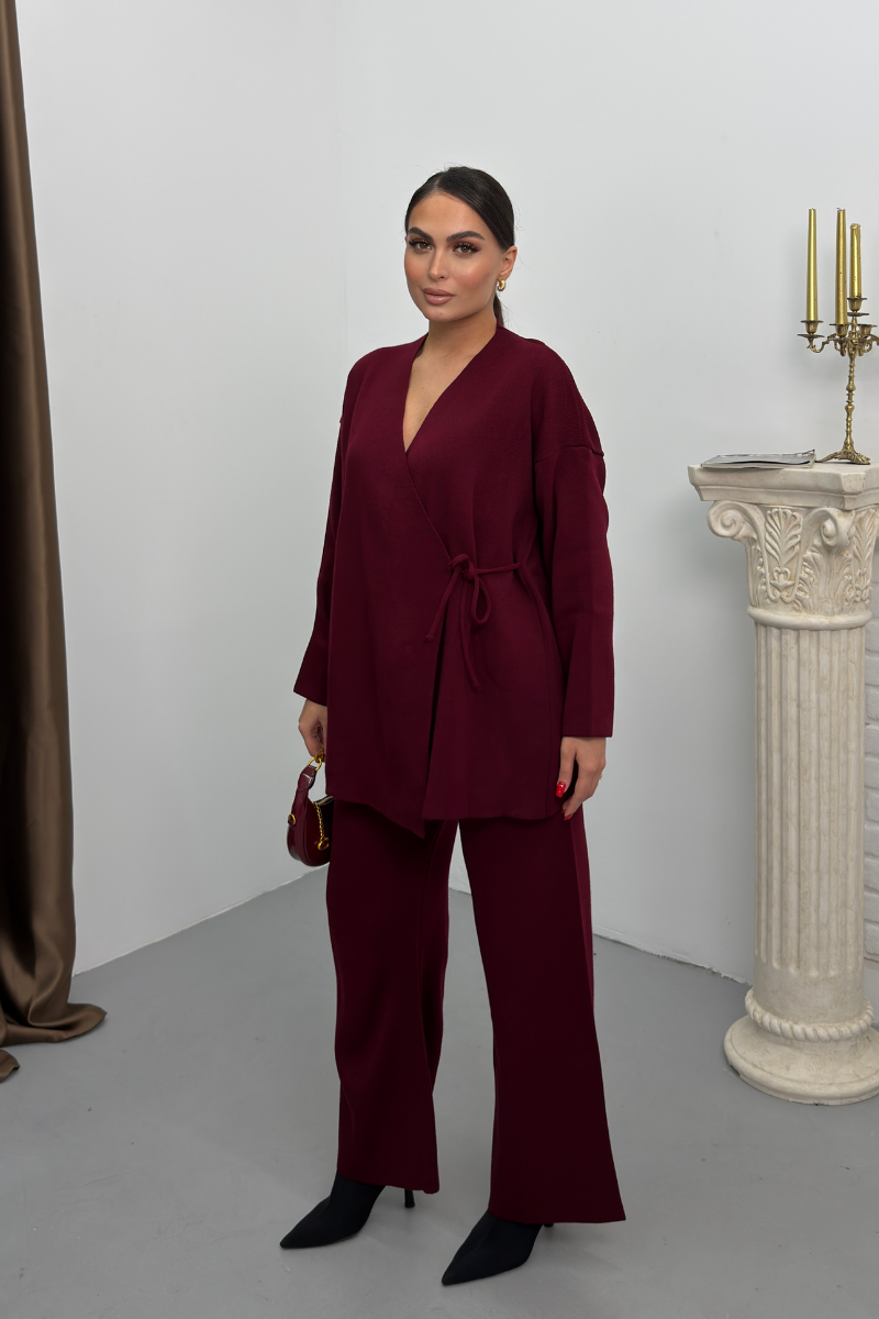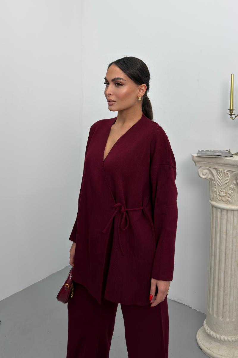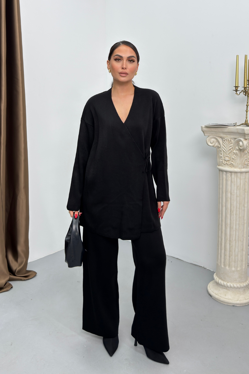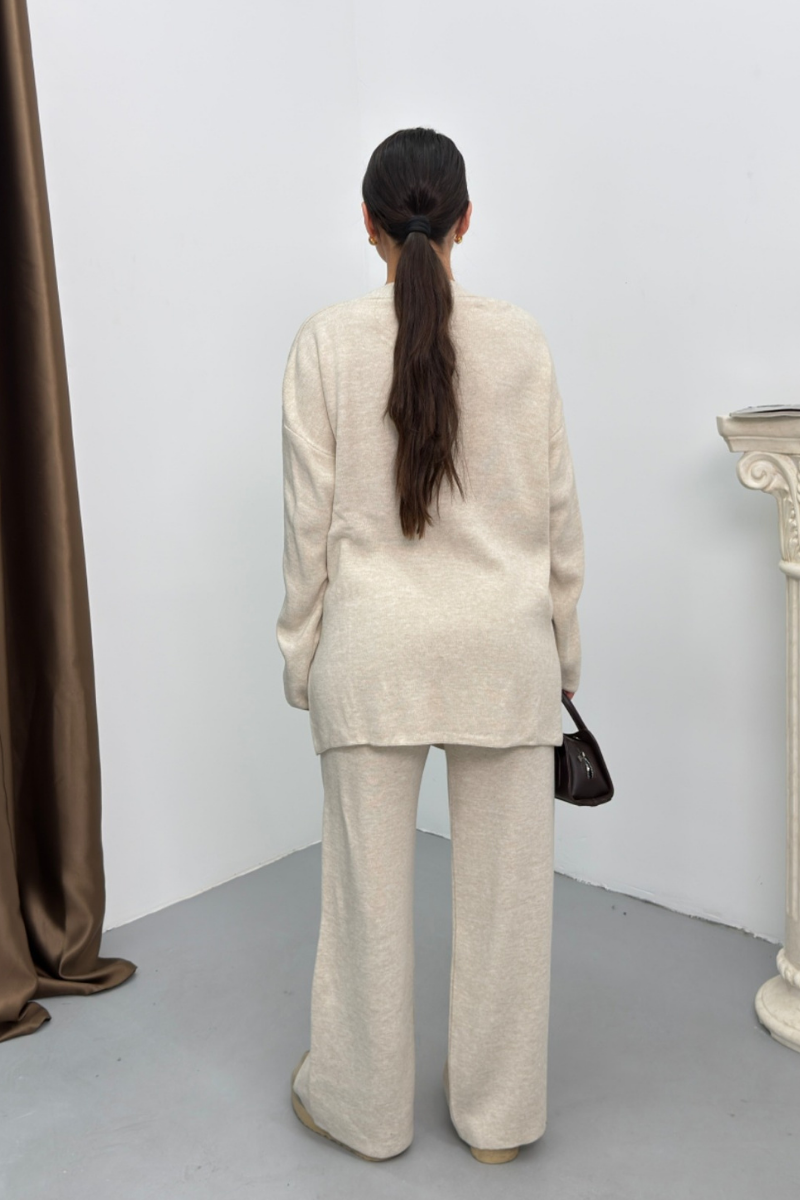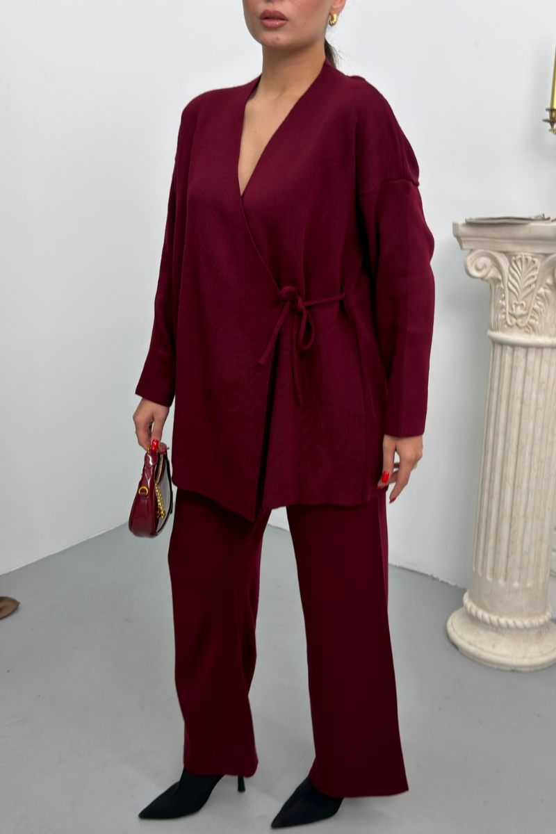 Kadın İkili Alt Üst Takım Triko Yandan Bağcıklı Kruvaze Hırka Bol Paça Pantolon Örme Takım