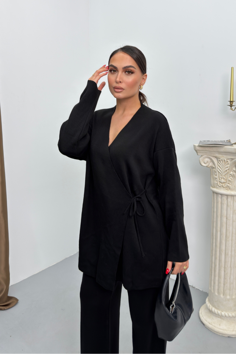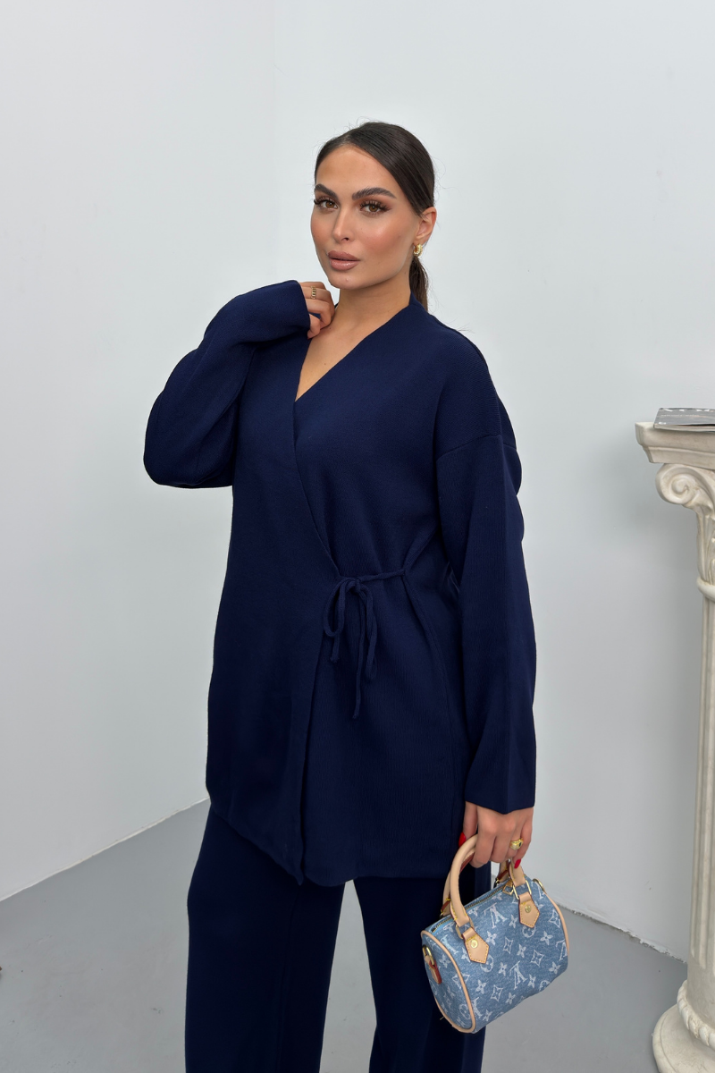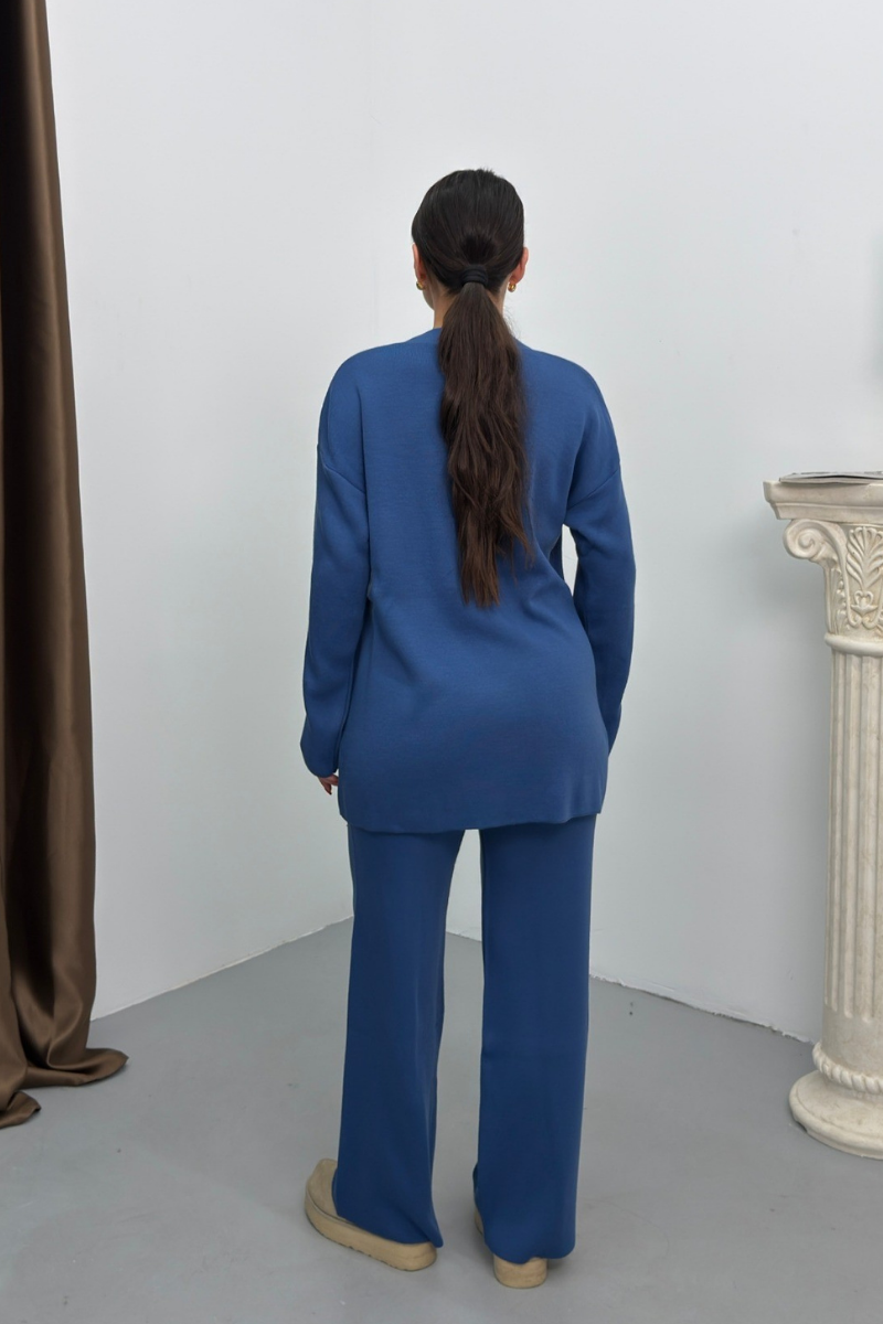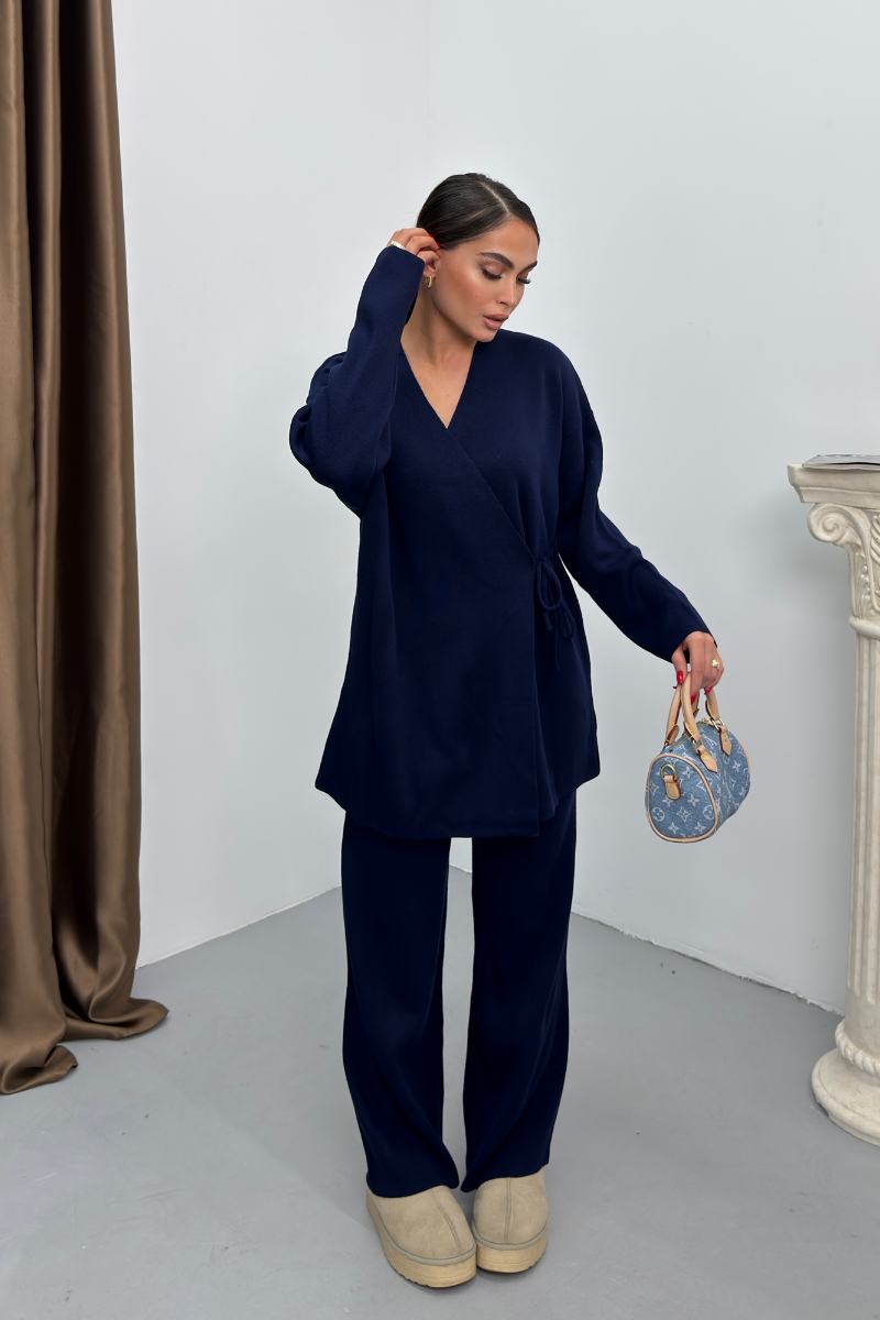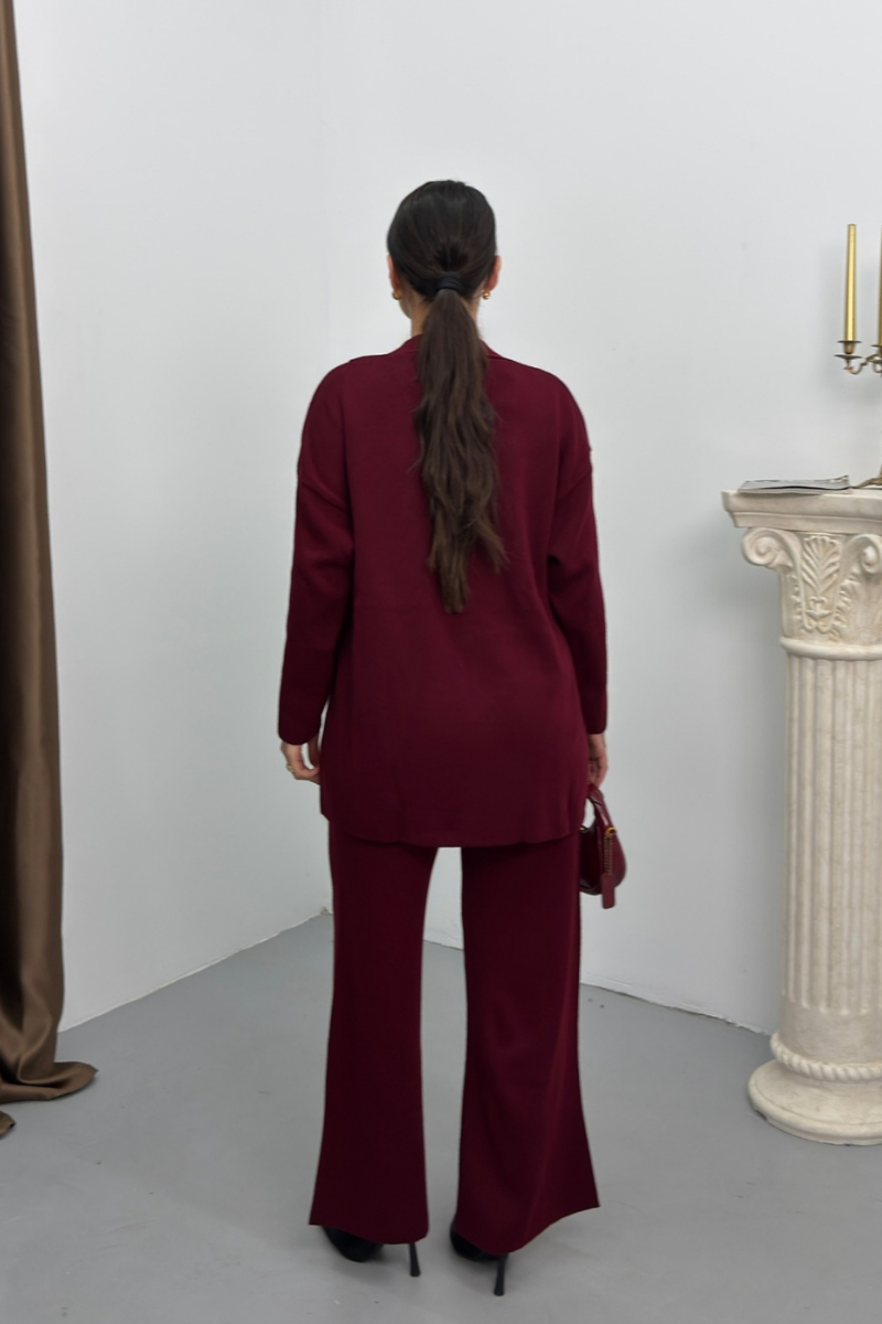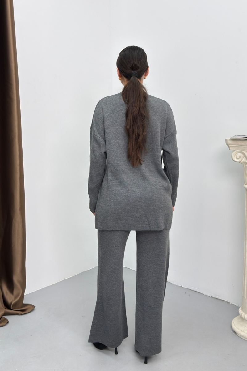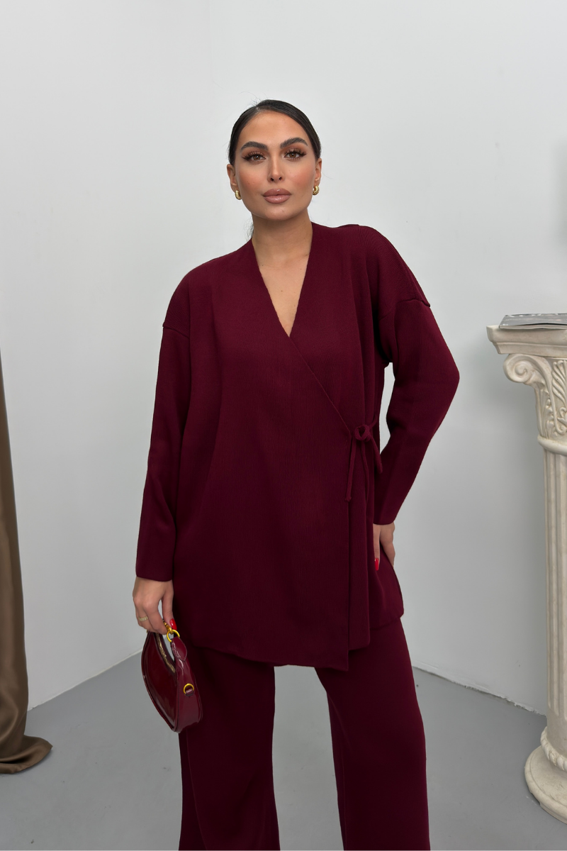 Kadın İkili Alt Üst Takım Triko Yandan Bağcıklı Kruvaze Hırka Bol Paça Pantolon Örme Takım