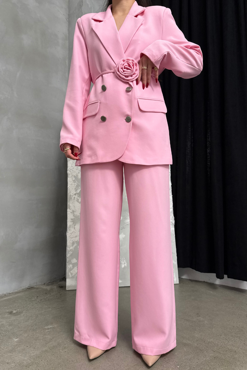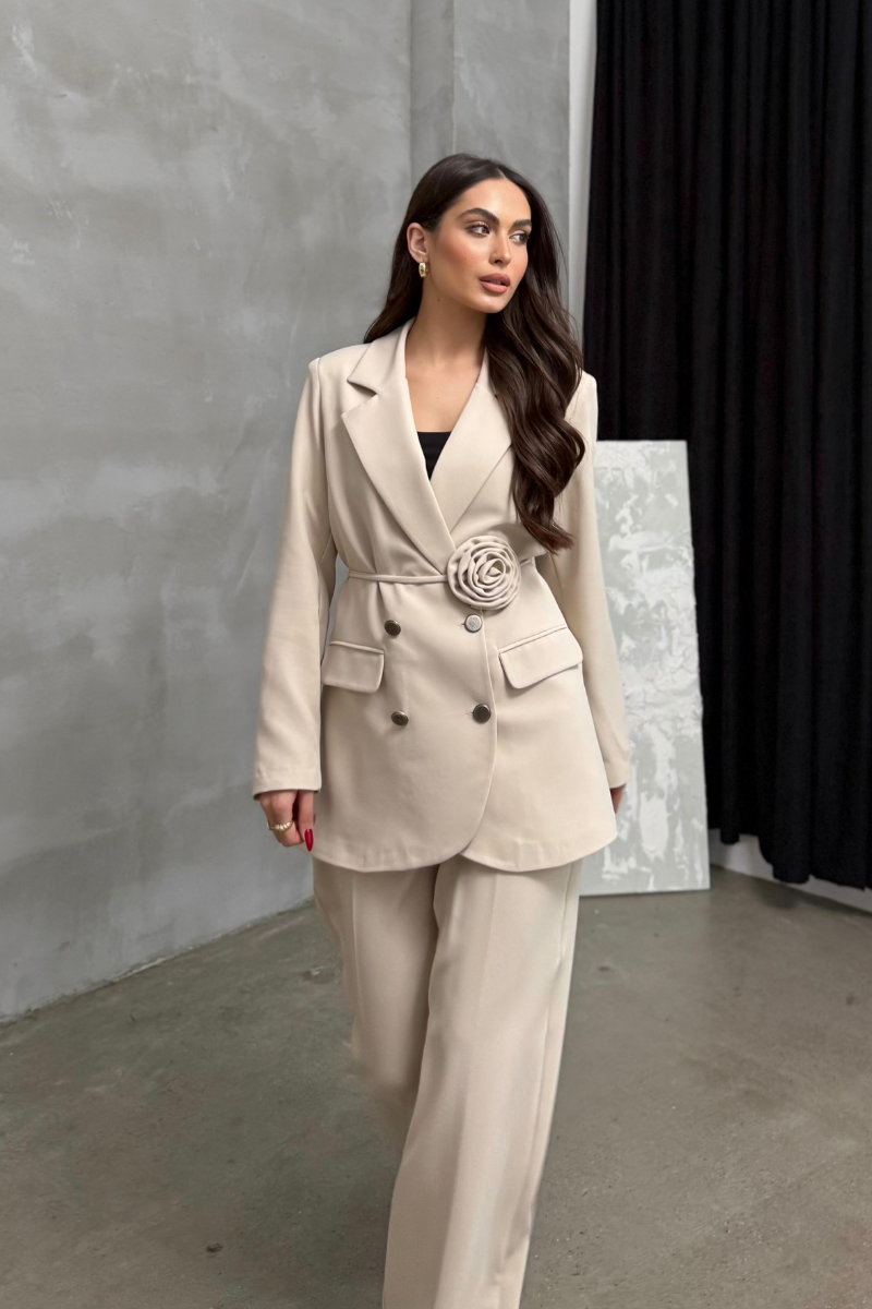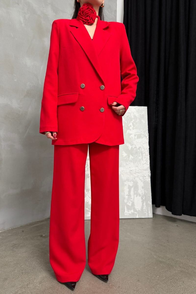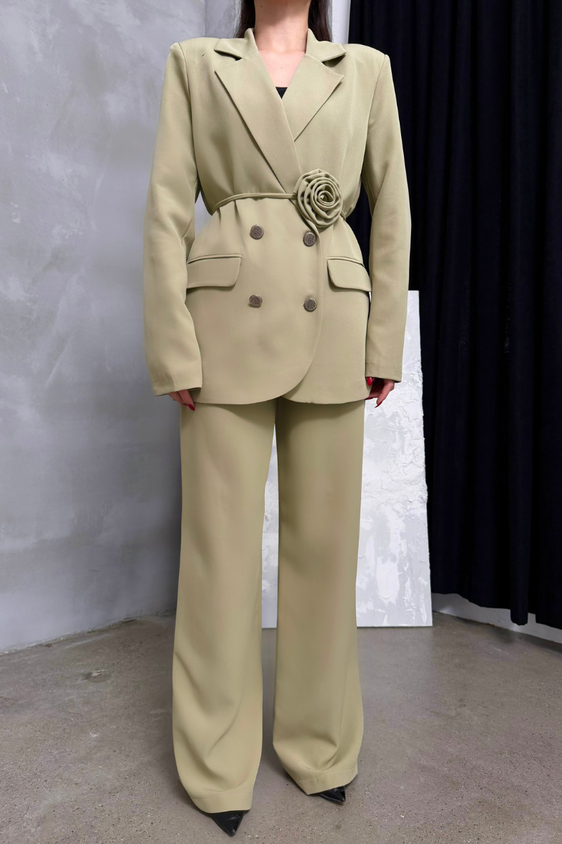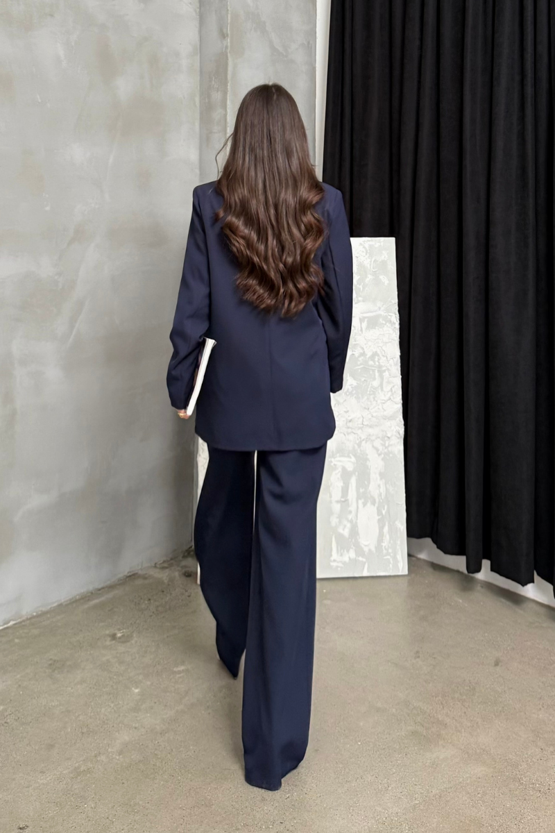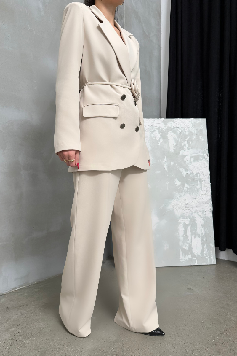 Kadın İkili Blazer Ceket Pantolon Takım Aksesuar ve Düğme Detaylı Bol Paça
