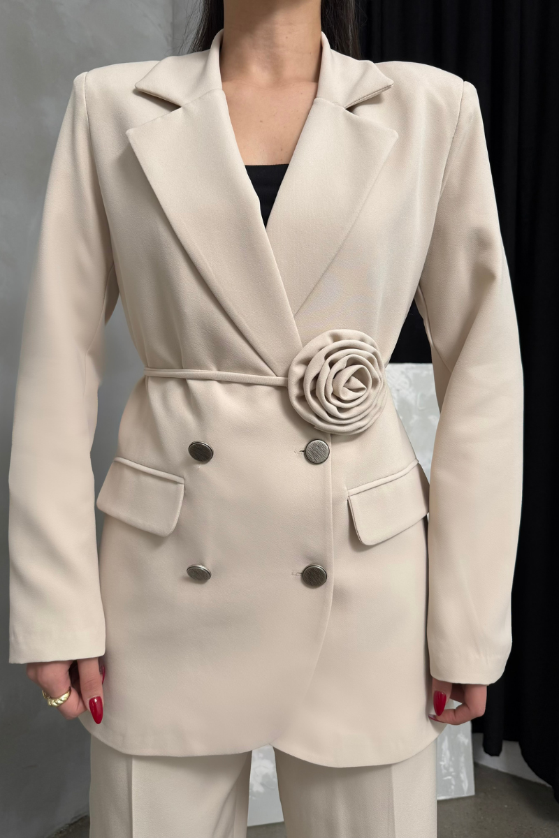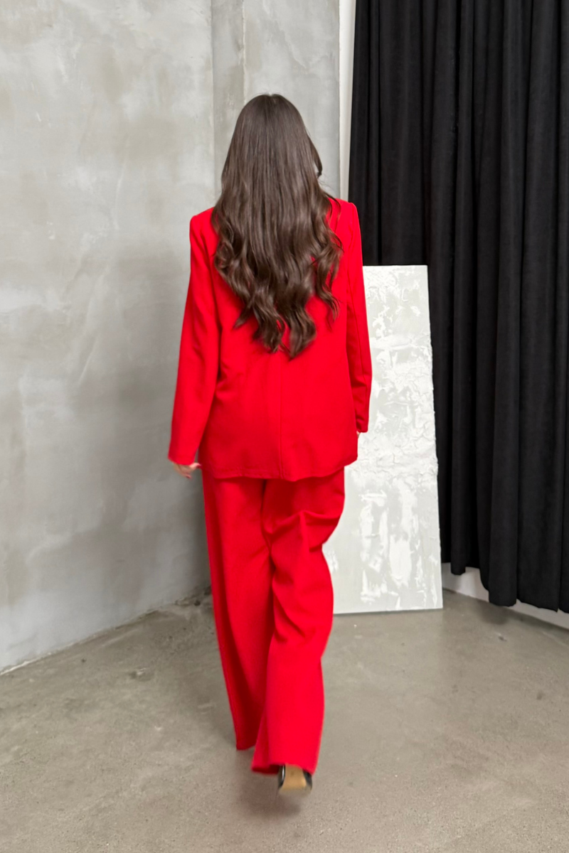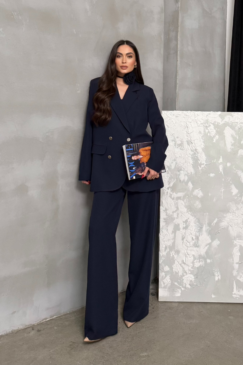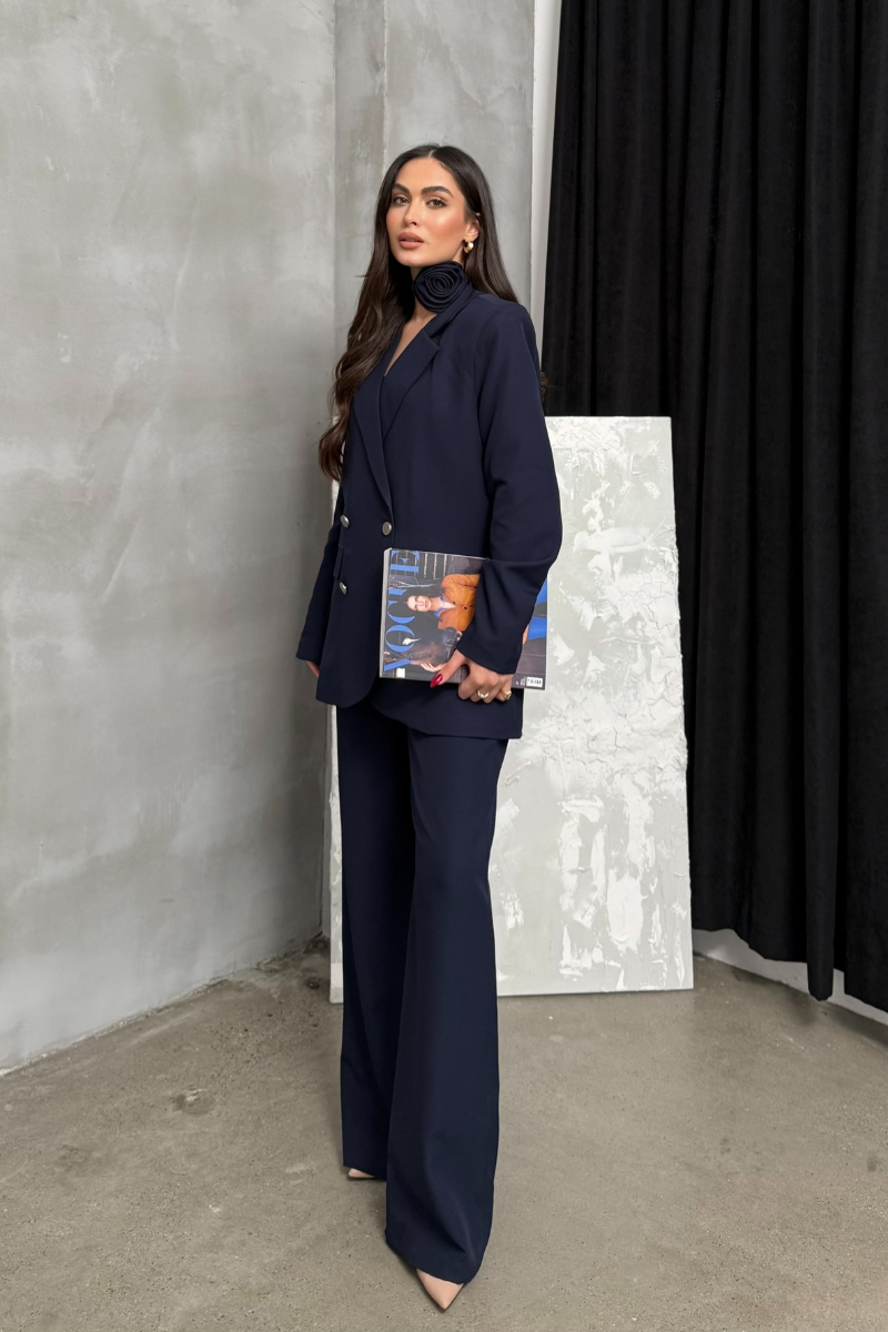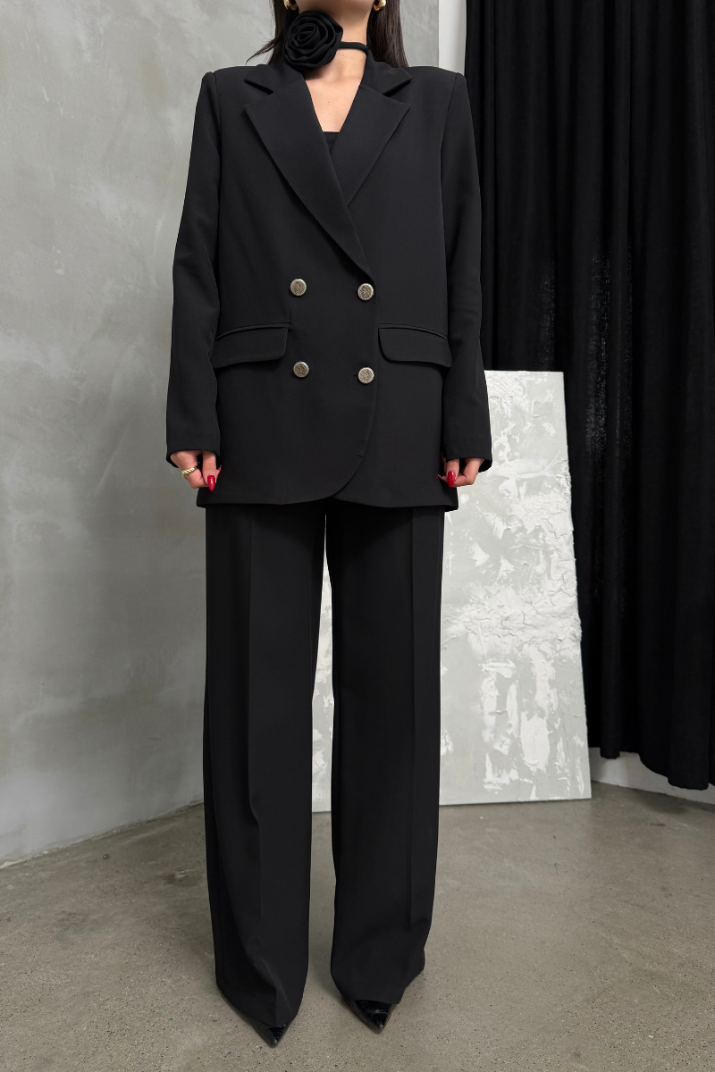Kadın İkili Blazer Ceket Pantolon Takım Aksesuar ve Düğme Detaylı Bol Paça