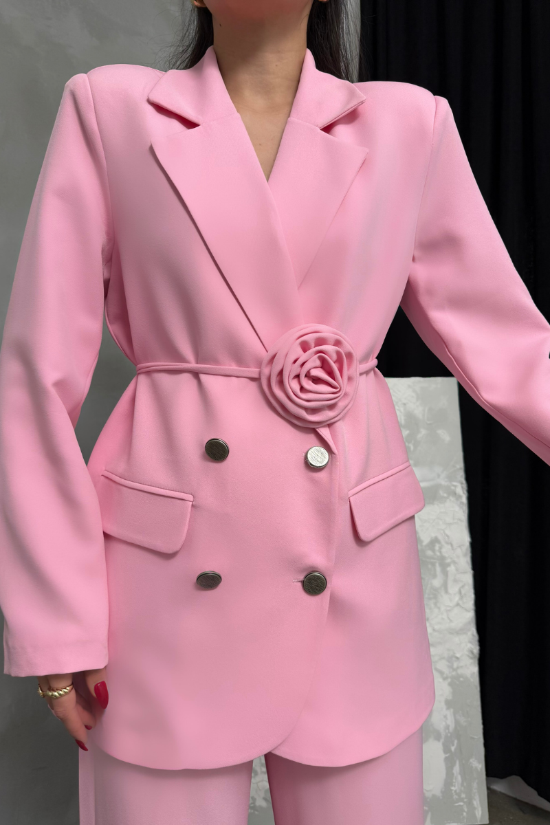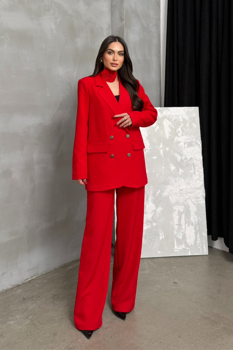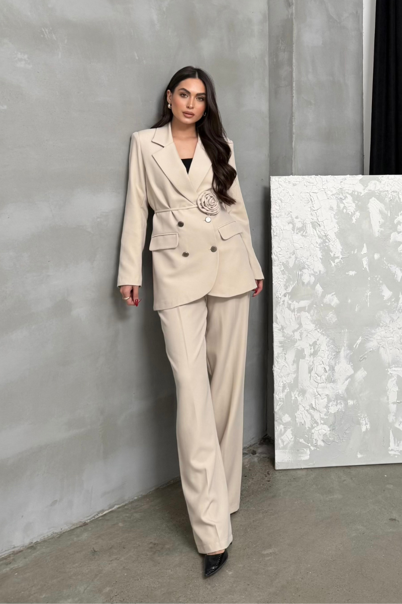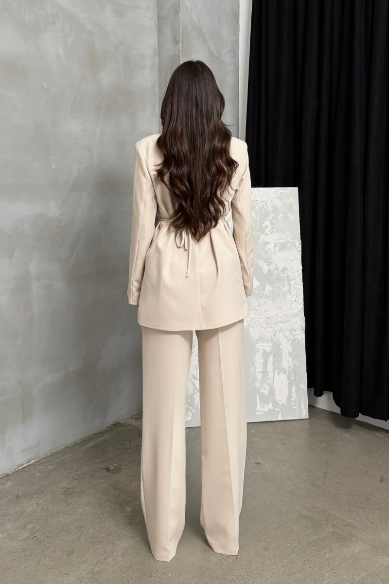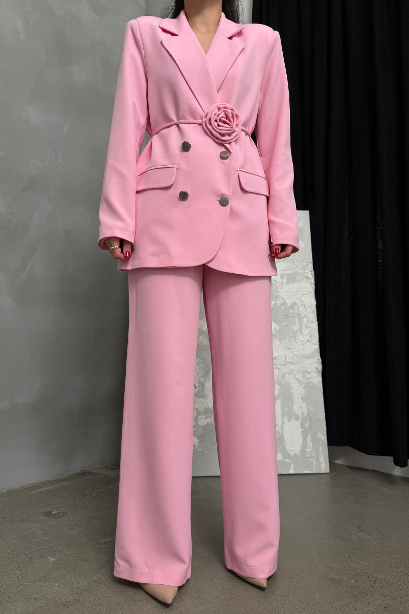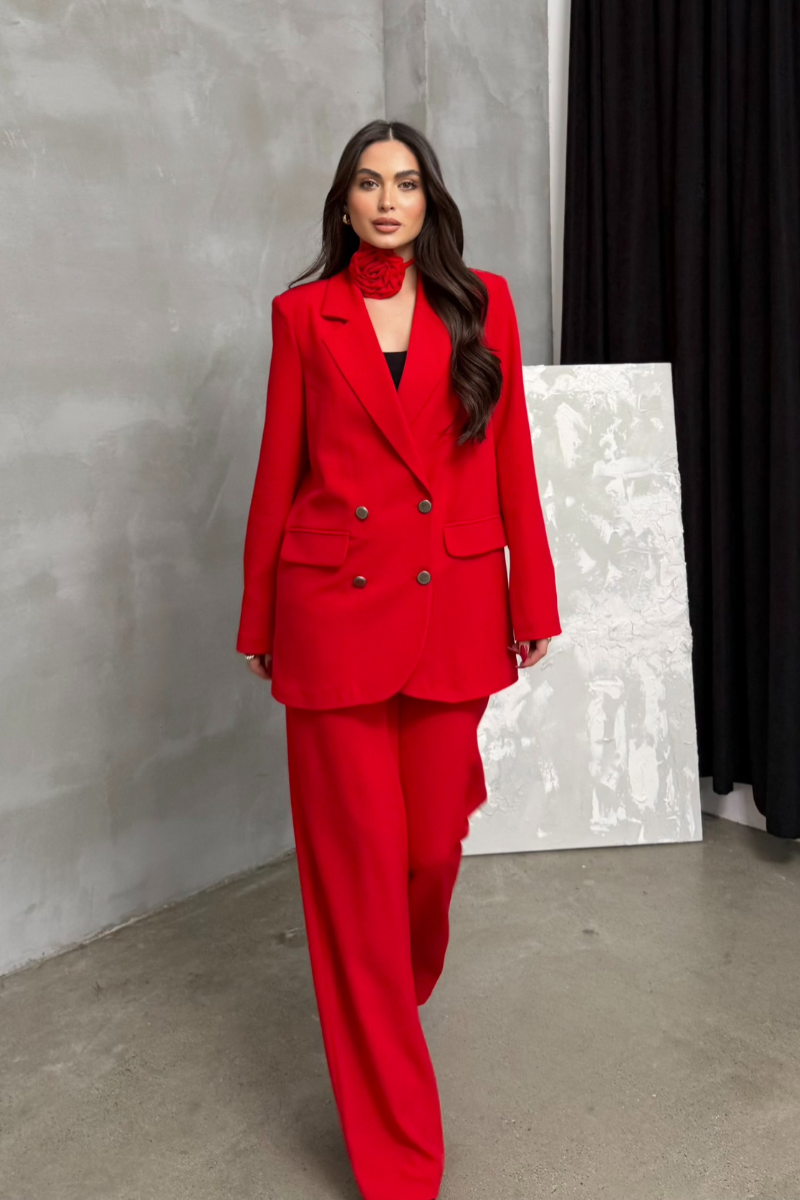 Kadın İkili Blazer Ceket Pantolon Takım Aksesuar ve Düğme Detaylı Bol Paça