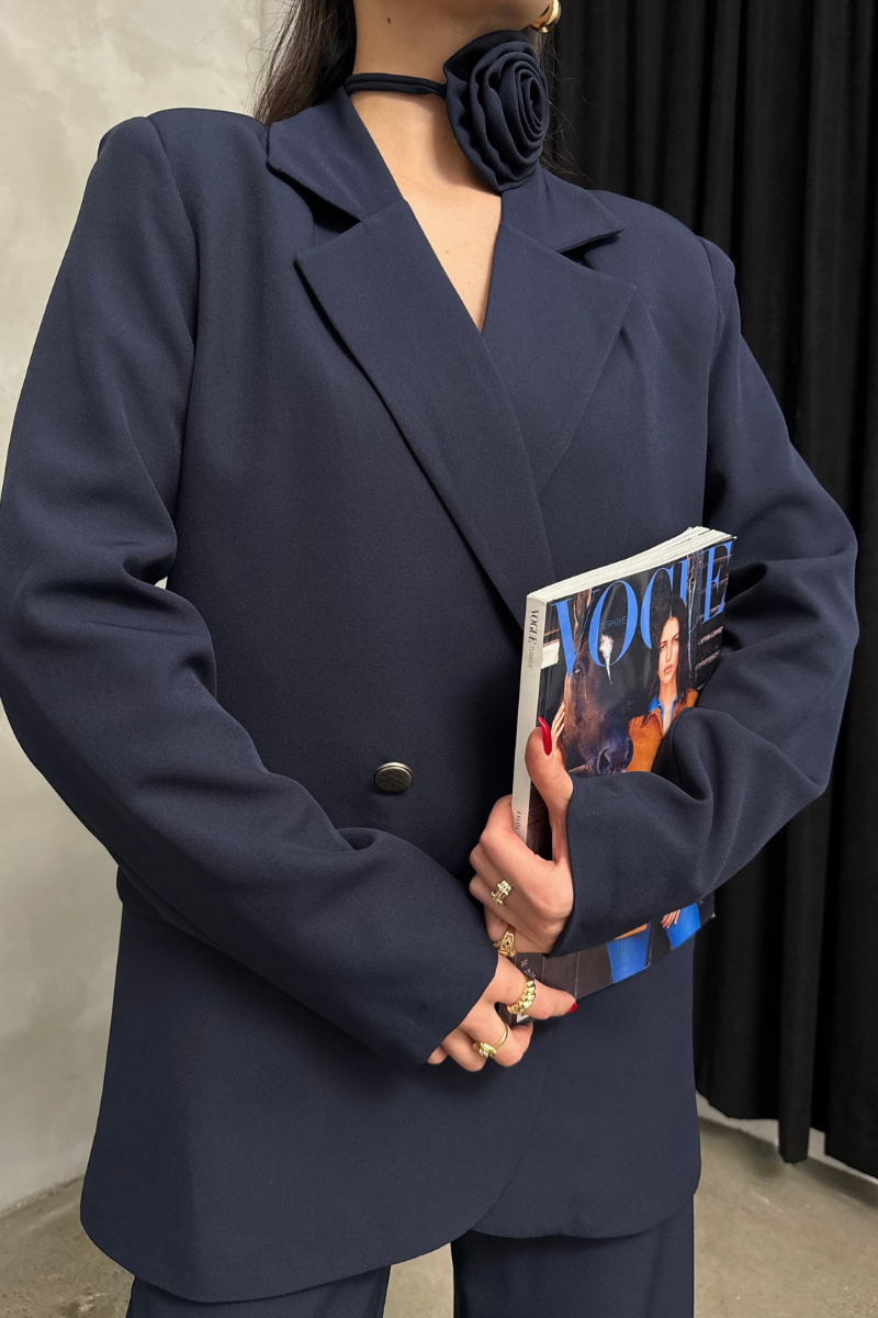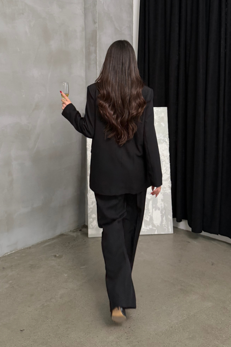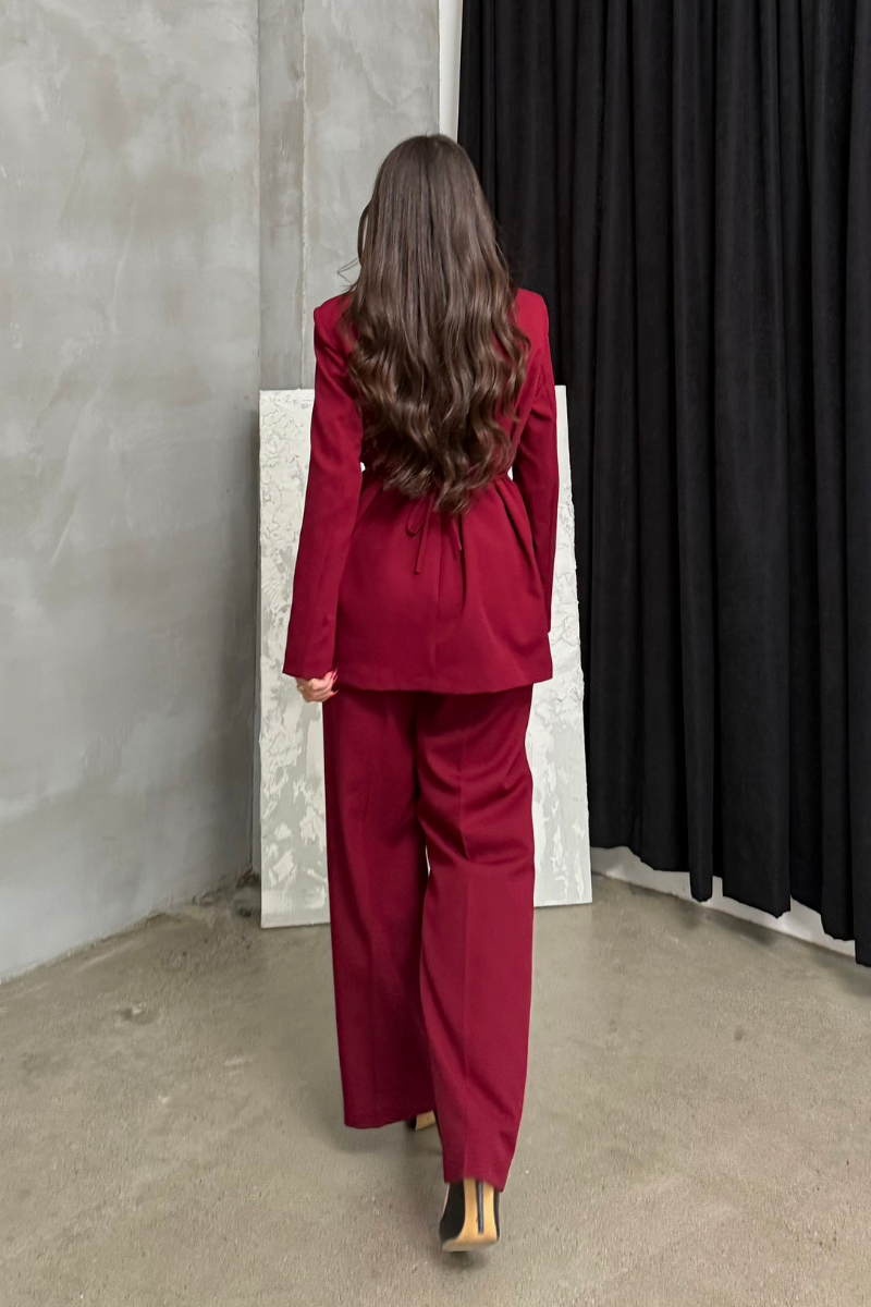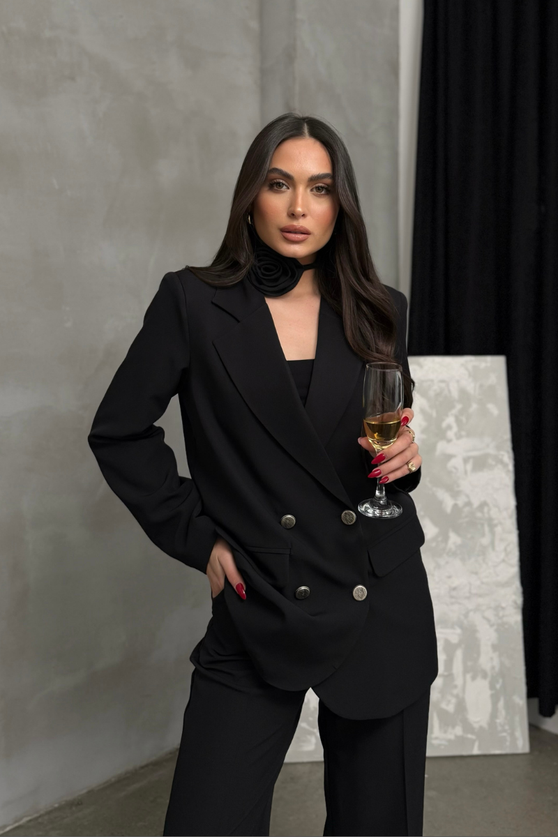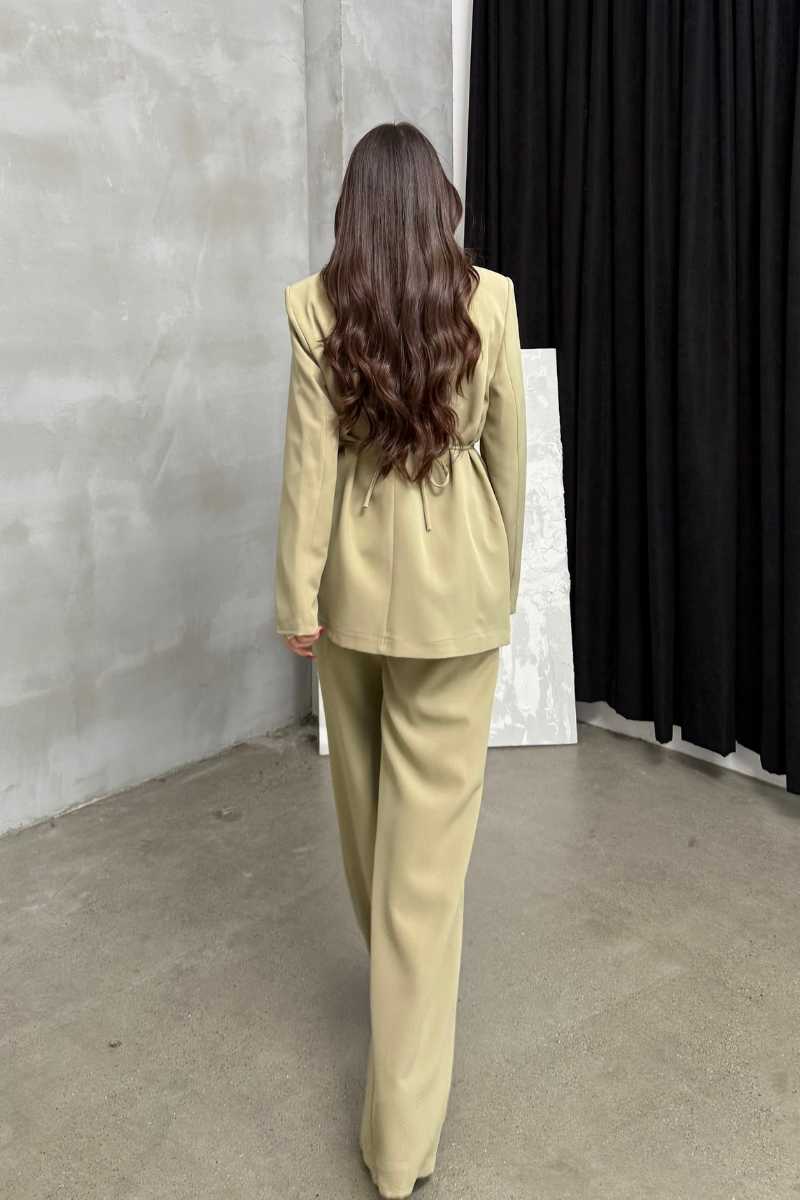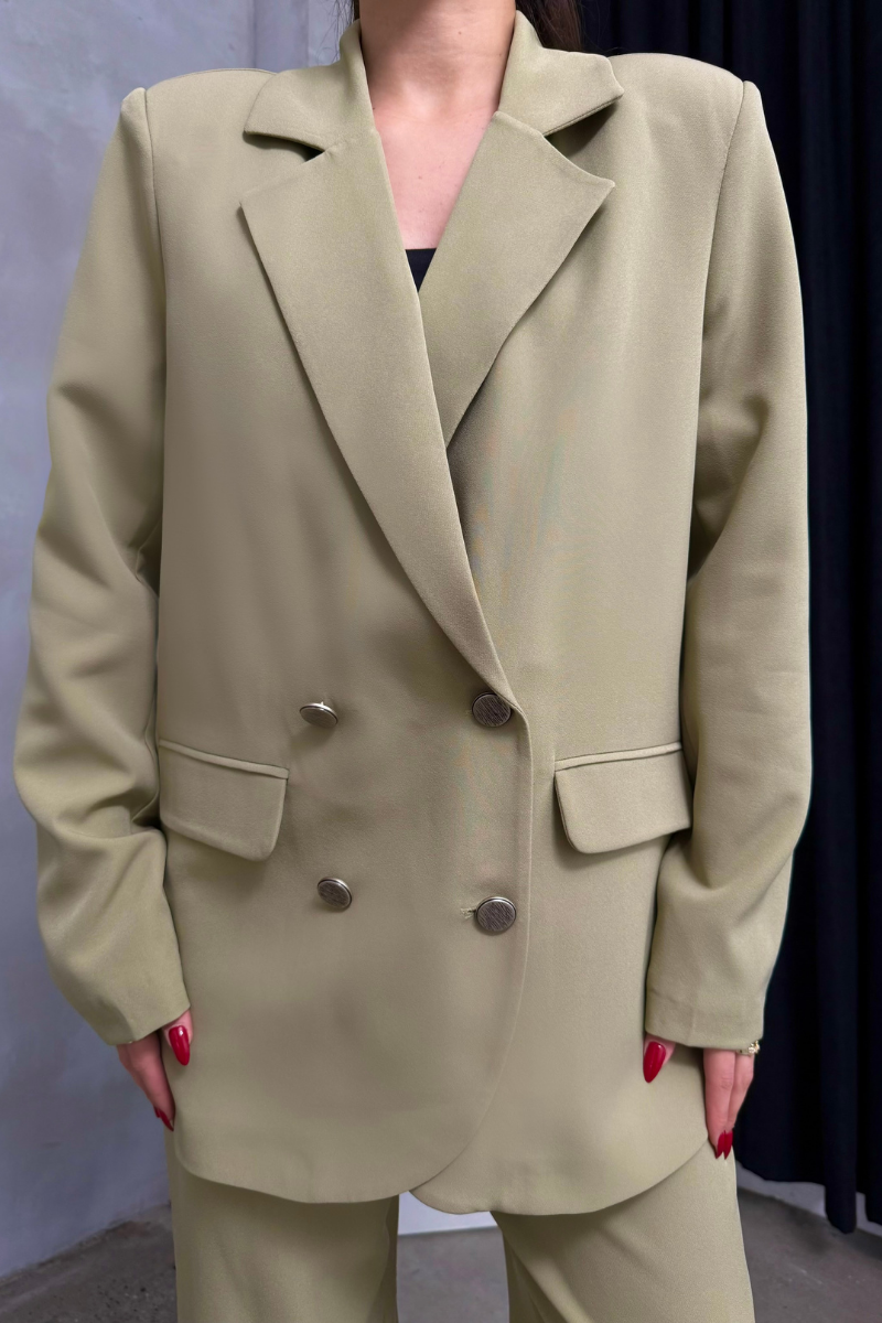 Kadın İkili Blazer Ceket Pantolon Takım Aksesuar ve Düğme Detaylı Bol Paça