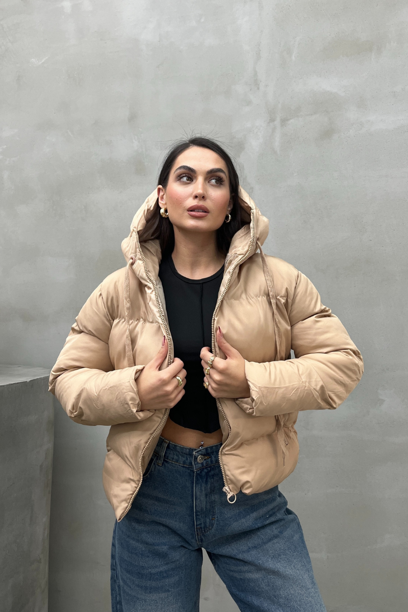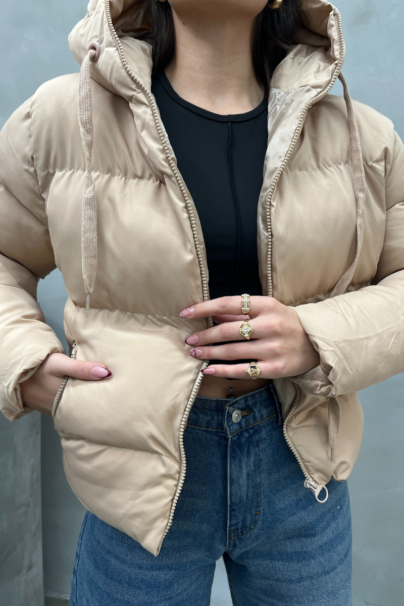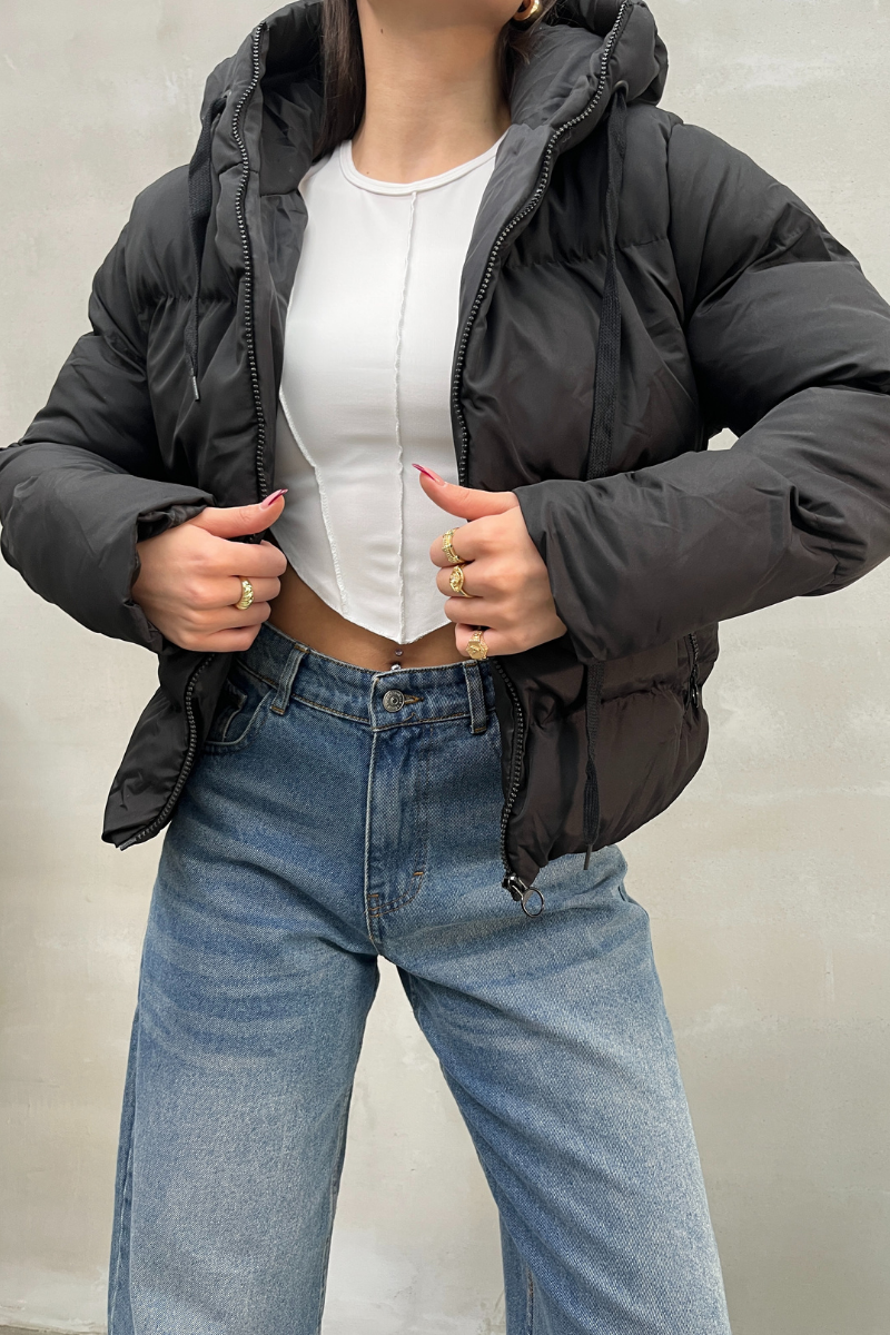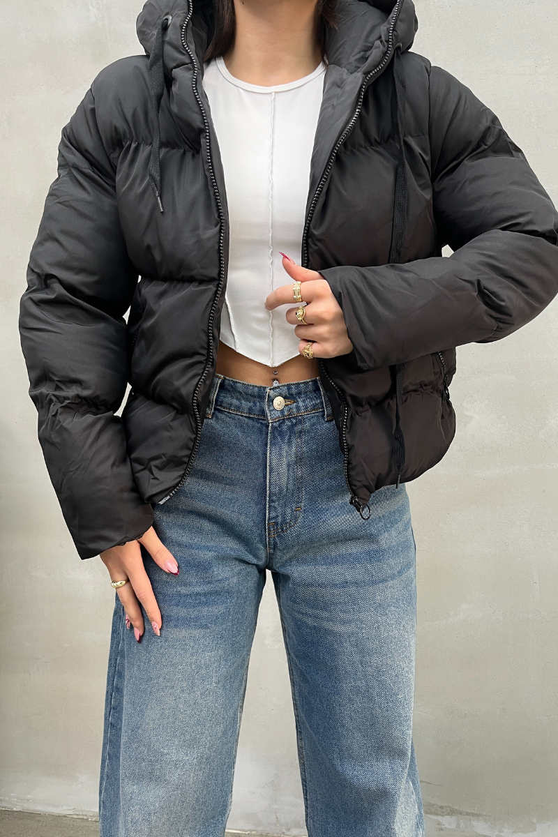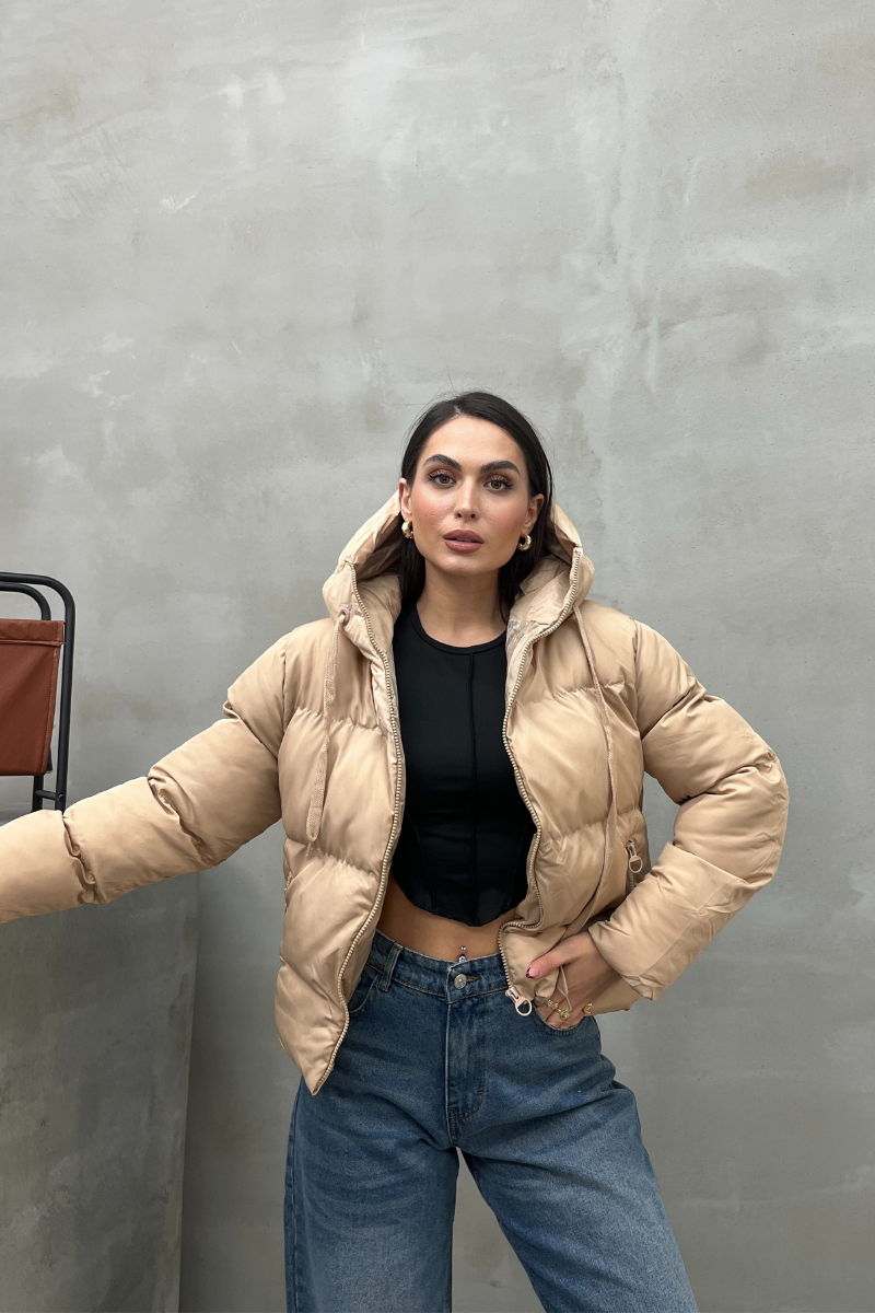 Kadın Kapüşonlu Cepli Kısa Şişme Mont